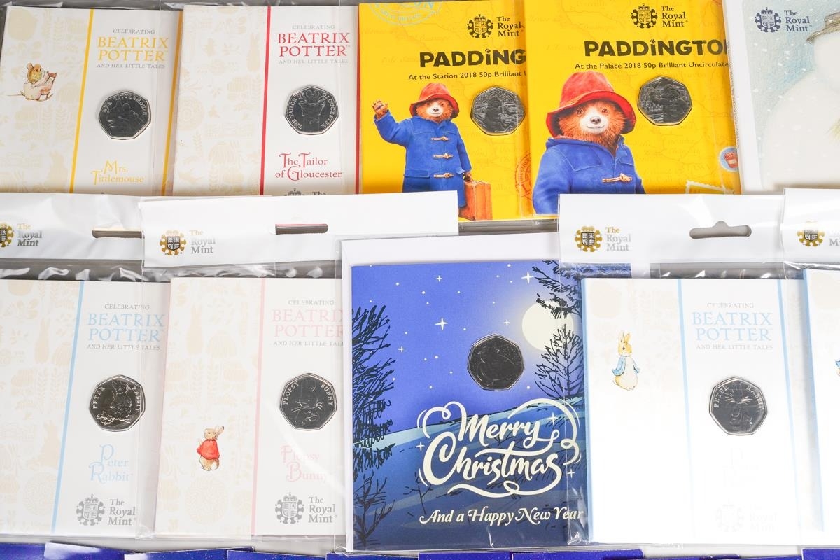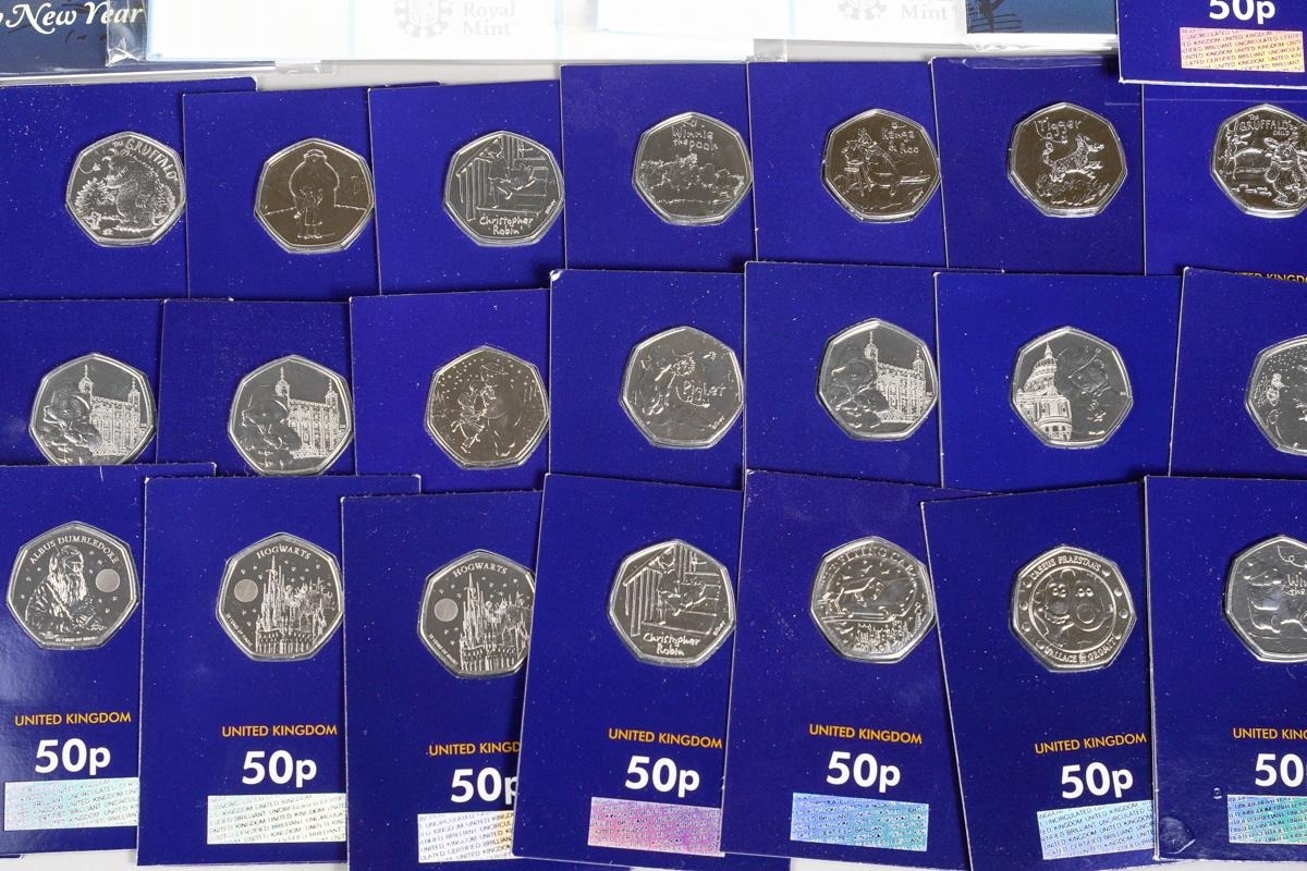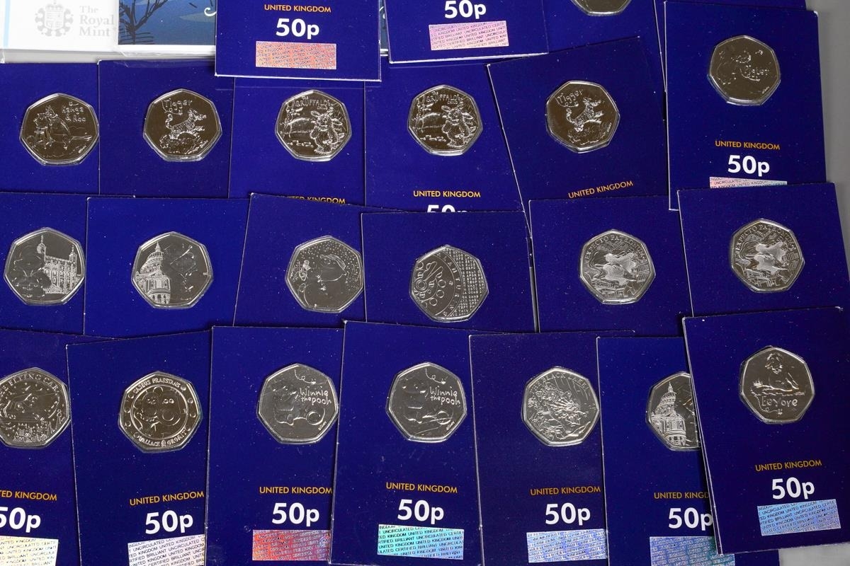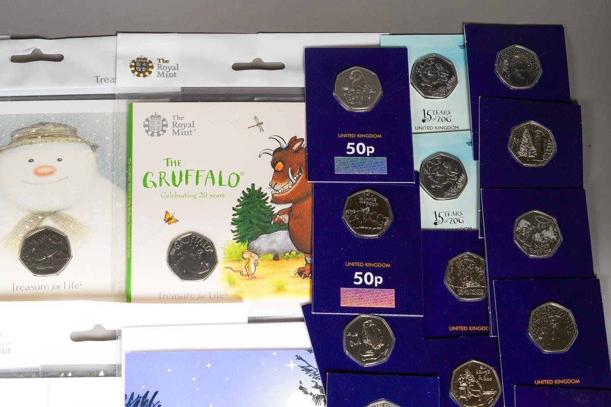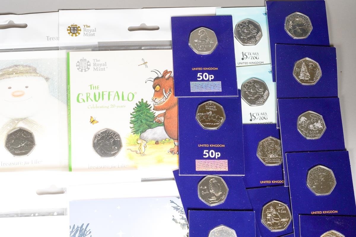 UK COINS: A collection of current pictorial back 50 pence pieces all of children's story themes, including Beatrix Potter, Harry Potter, The Gruffalo, The Snowman, Paddington, etc, twelve in sealed Royal Mint packs, two for Magic Light (Julia Donaldson's Zog), the remaining sixty four in Change Checker packs, £39 total in legal tender (1 bag)