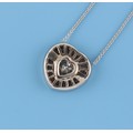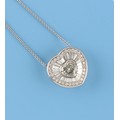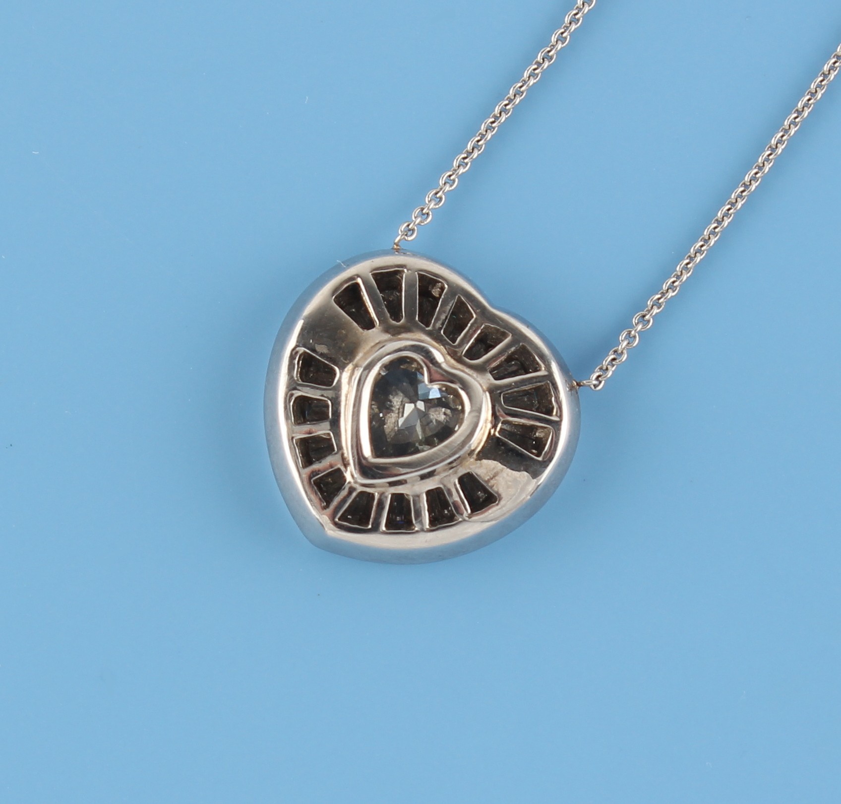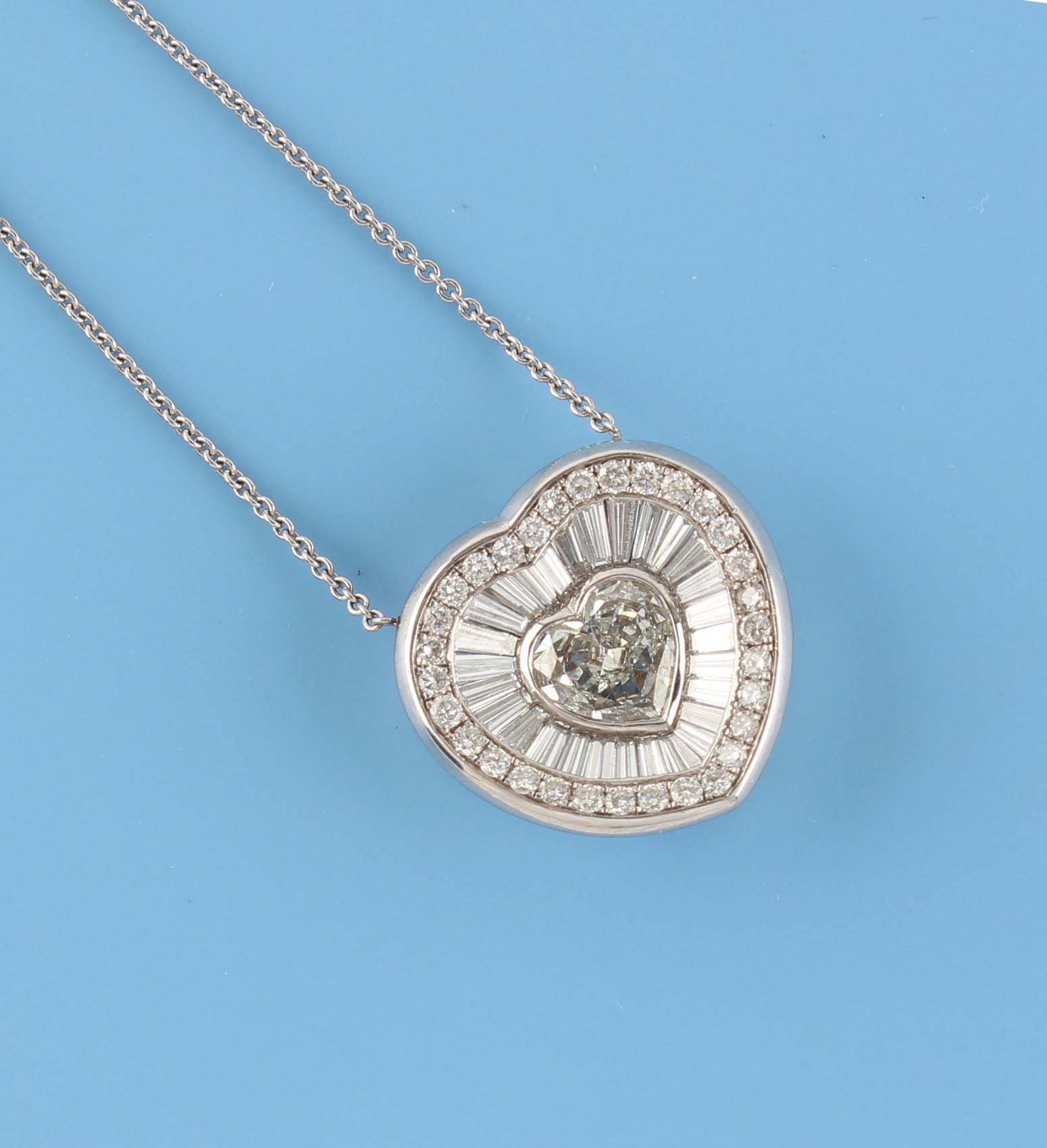 A modern white gold diamond heart shaped pendant on chain necklace, the pendant with centre heart shaped cut diamond within a border of tapering baguette cut diamonds & an outer border of round brilliant cut diamonds, the estimated total diamond weight 1.55 carats, the pendant 15 by 15mm, the chain 16.2ins. (41cms.) long.