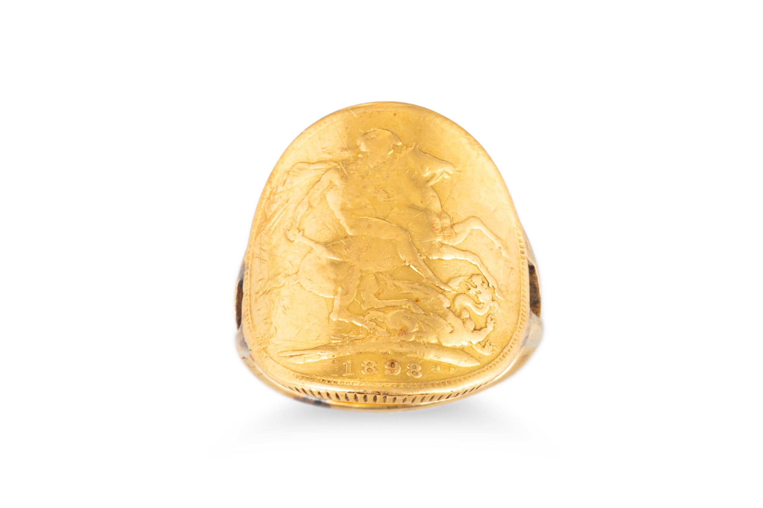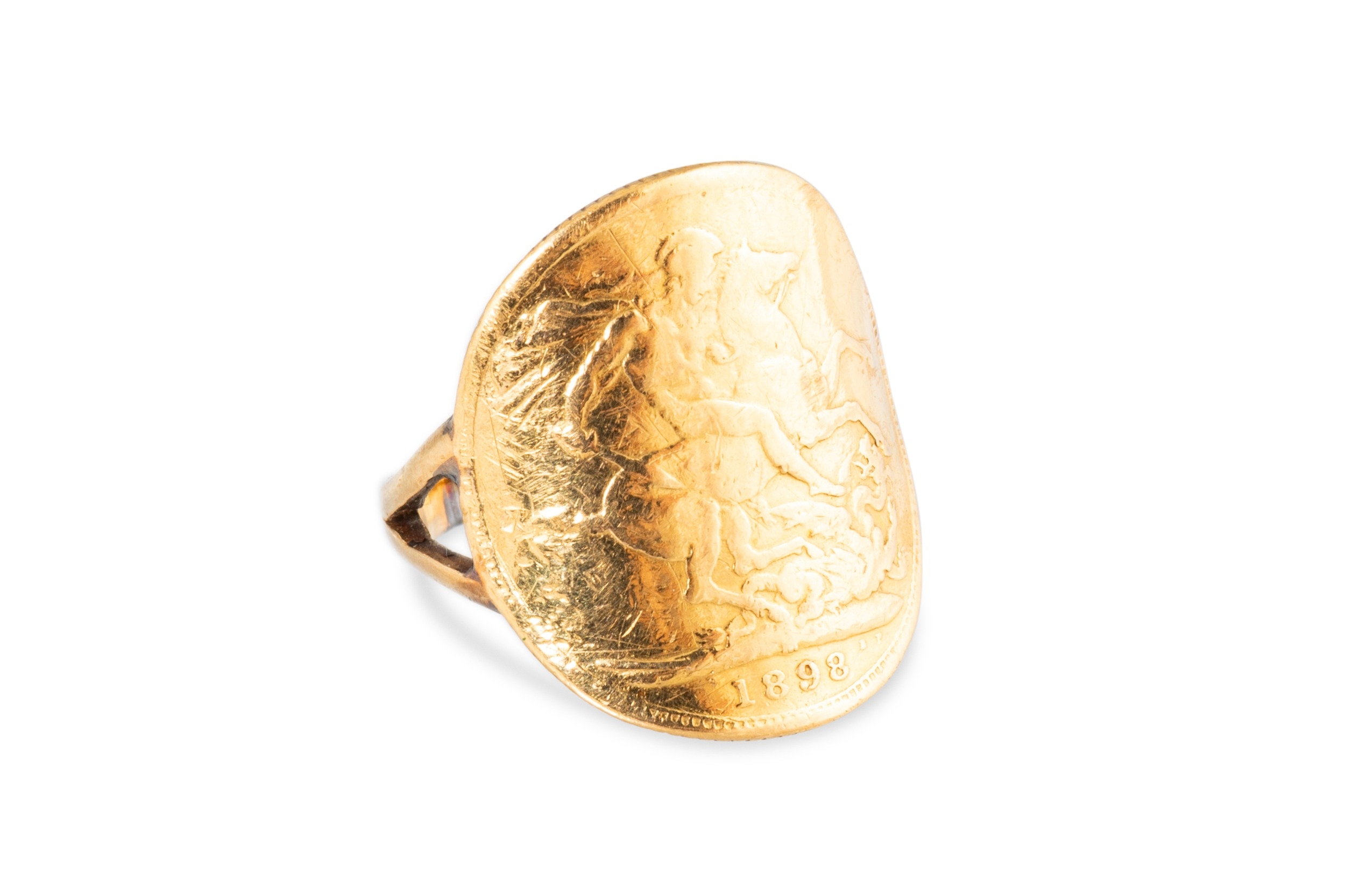 AN ANTIQUE SOVEREIGN RING, the Victorian full 22ct gold sovereign coin 1898, fashioned to form a ring with an 18ct gold ring shank, size N gross weight 10 g., 8 g. x 22 ct., 2 g. x 18 ct.