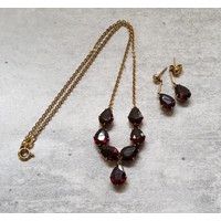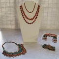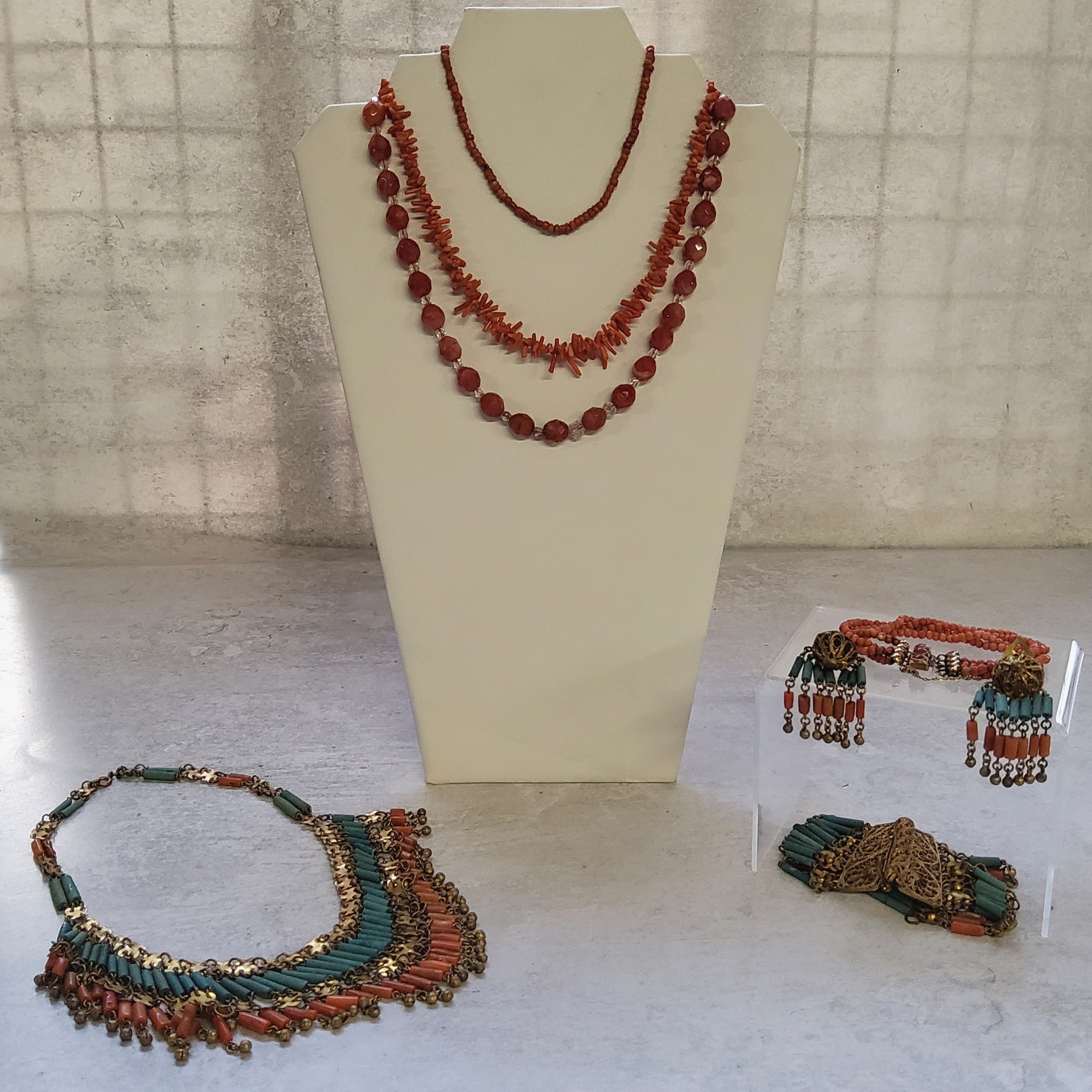 An unusual Tibetan coral necklace, bracelet & earing set, yellow metal mount, etc.