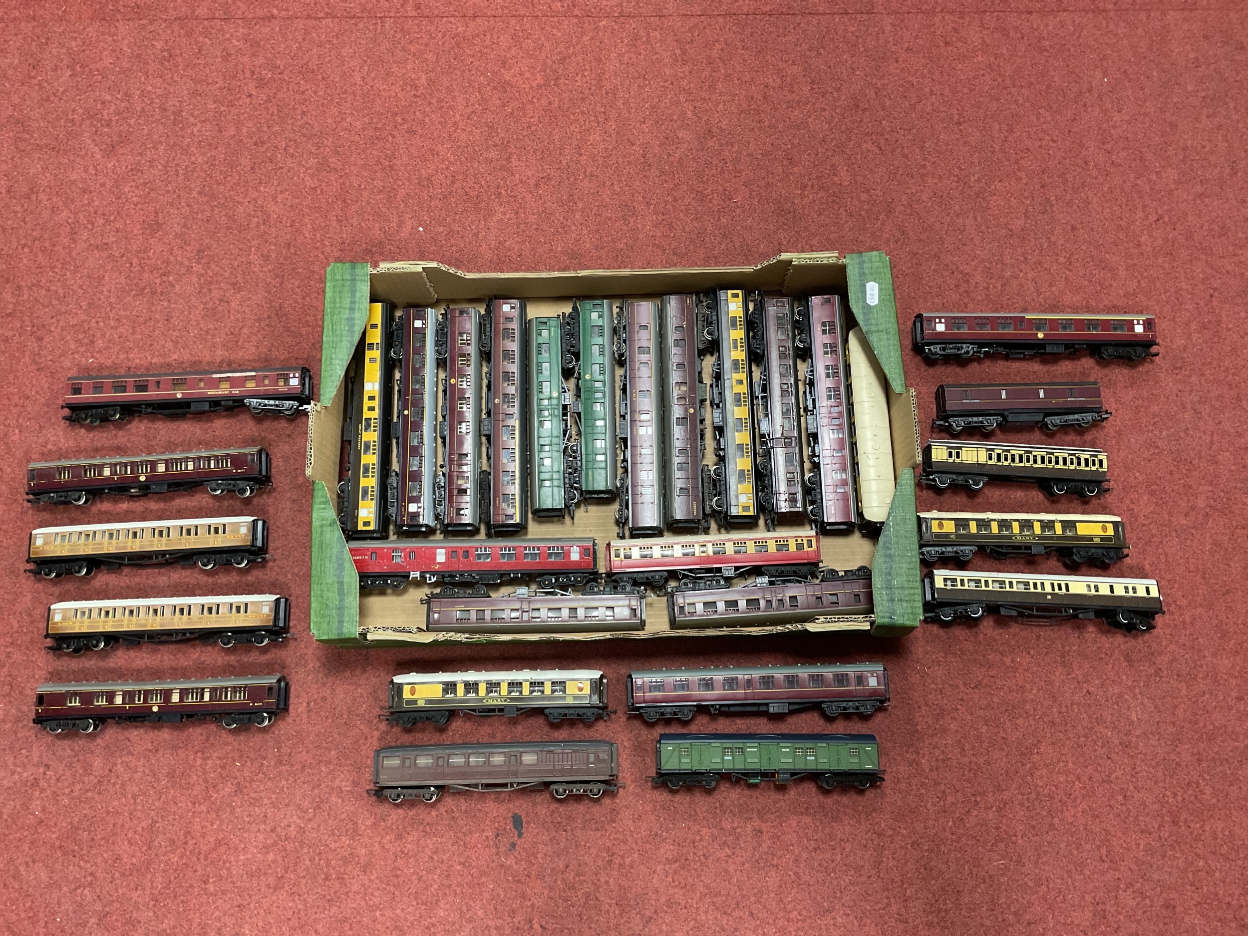 Approximately thirty 00 gauge coaches by Triang, Hornby and others, including a Southern Railway Utility van and a Lima Parcels Van, all playworn.