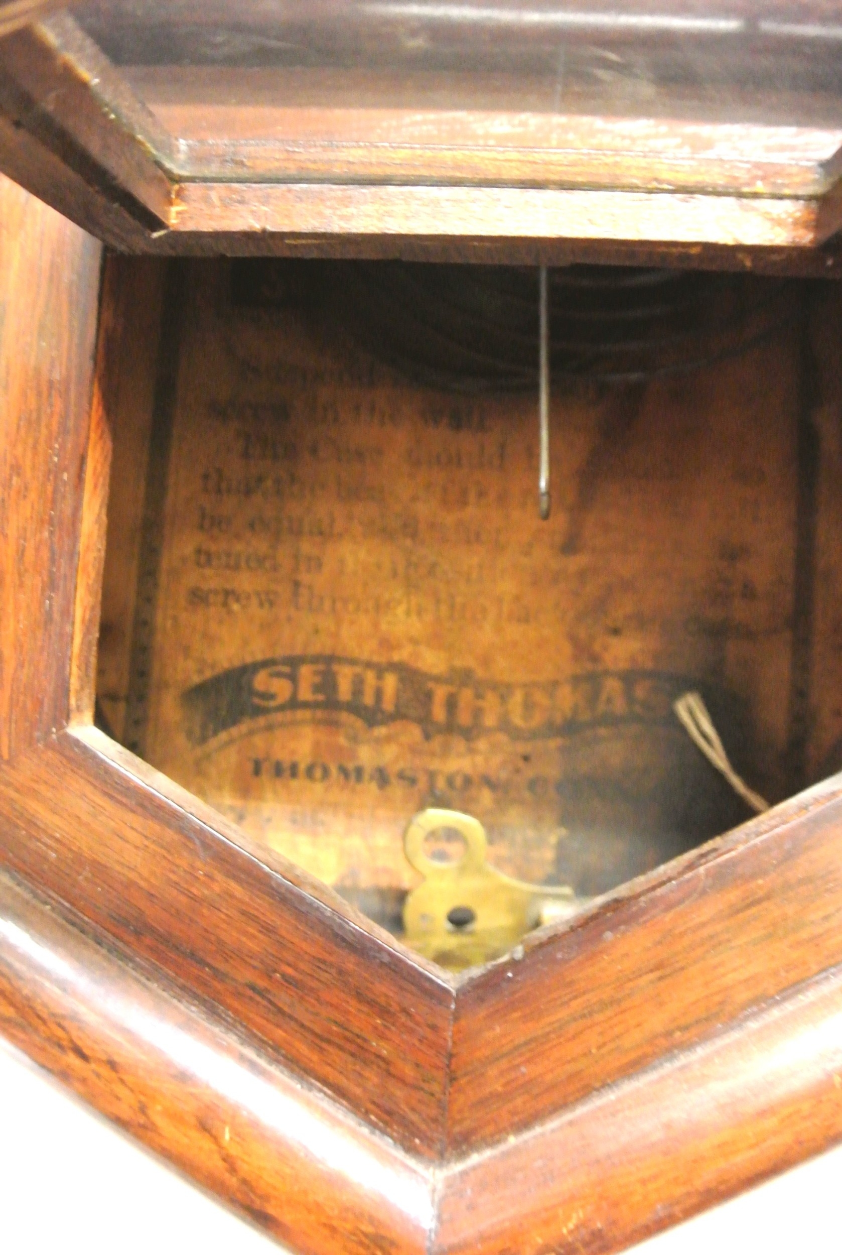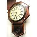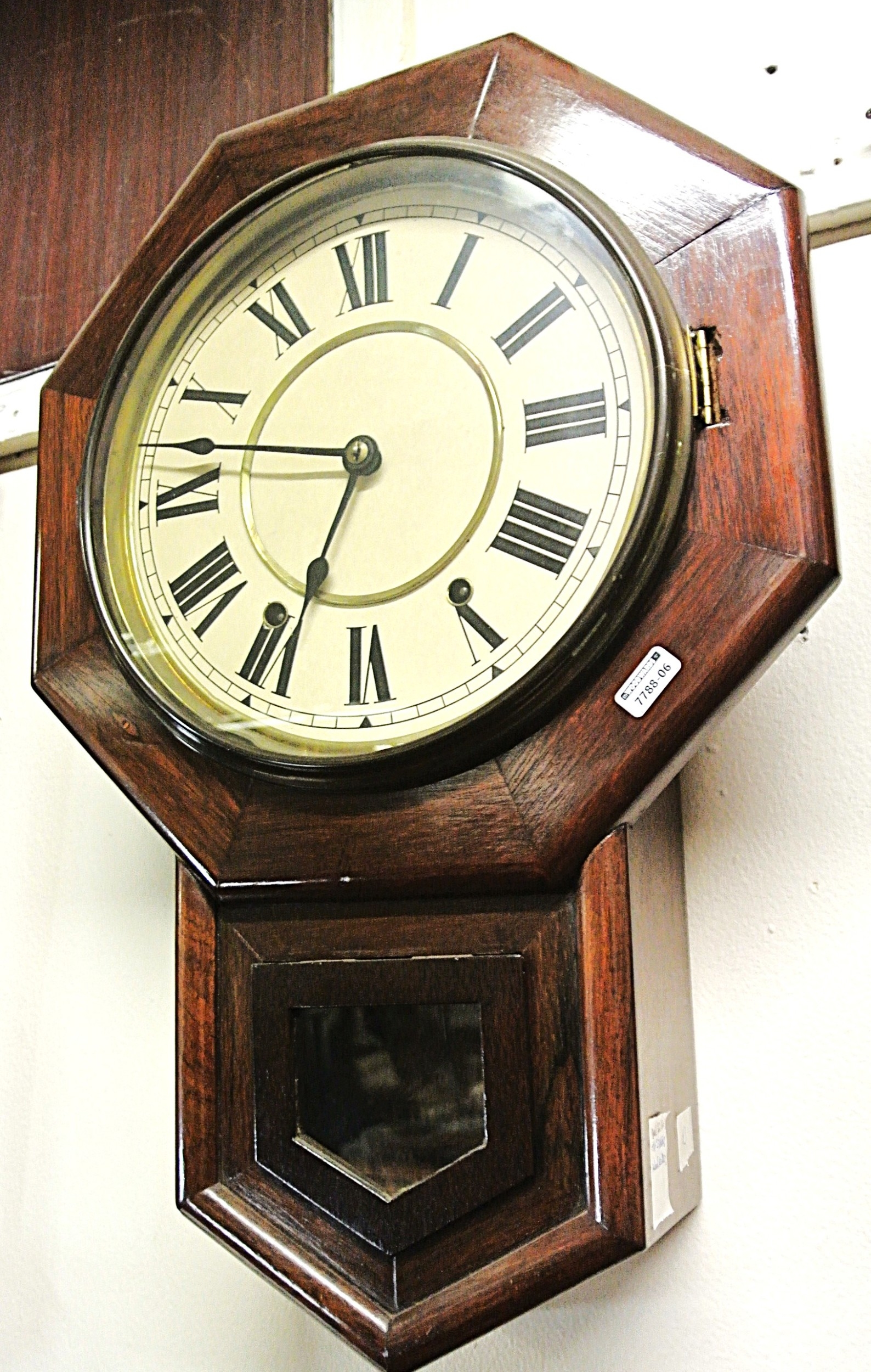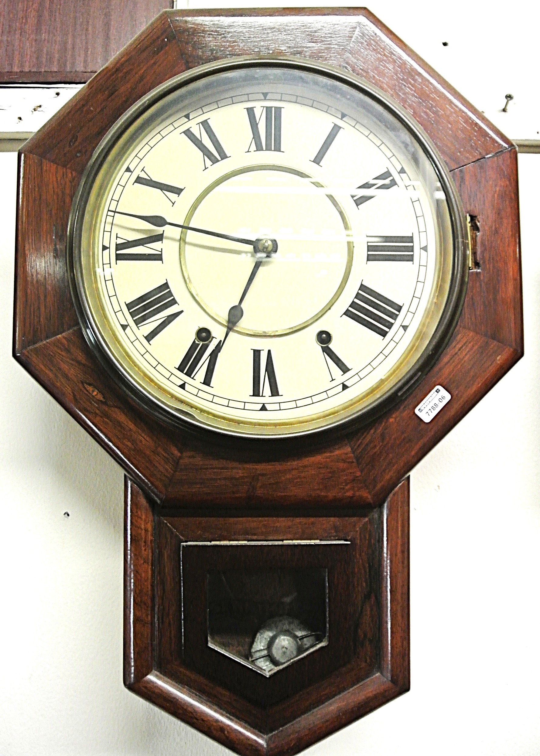 Edwardian small regulator wall clock with brass framed round dial and pendulum