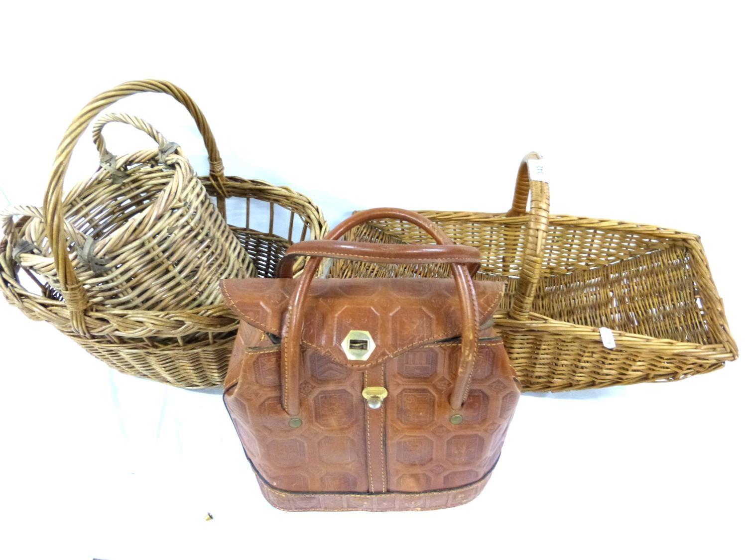 Three vintage wicker baskets and leather bag.