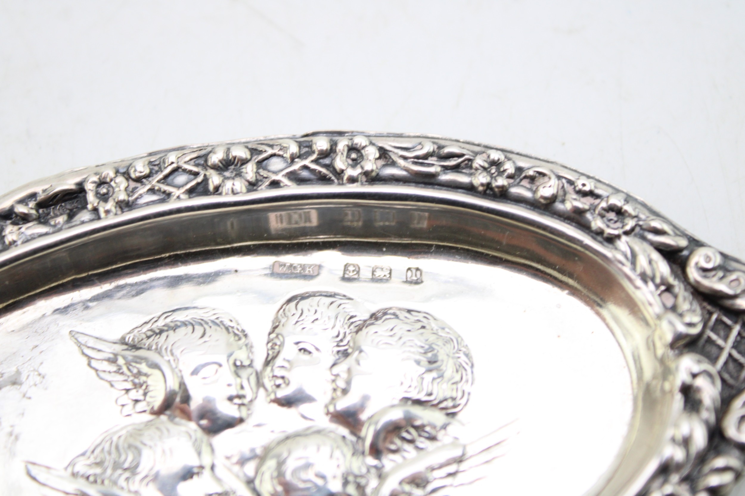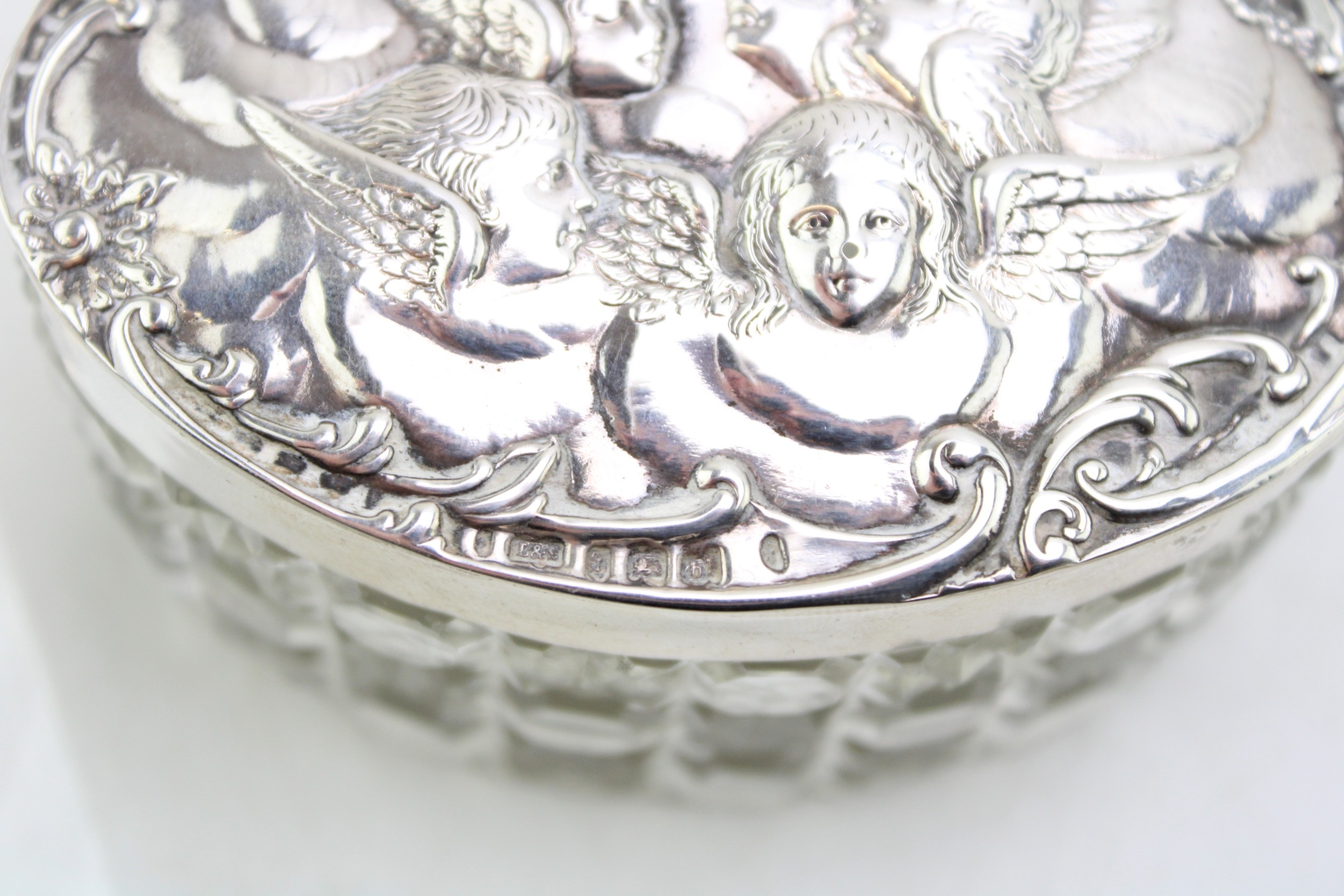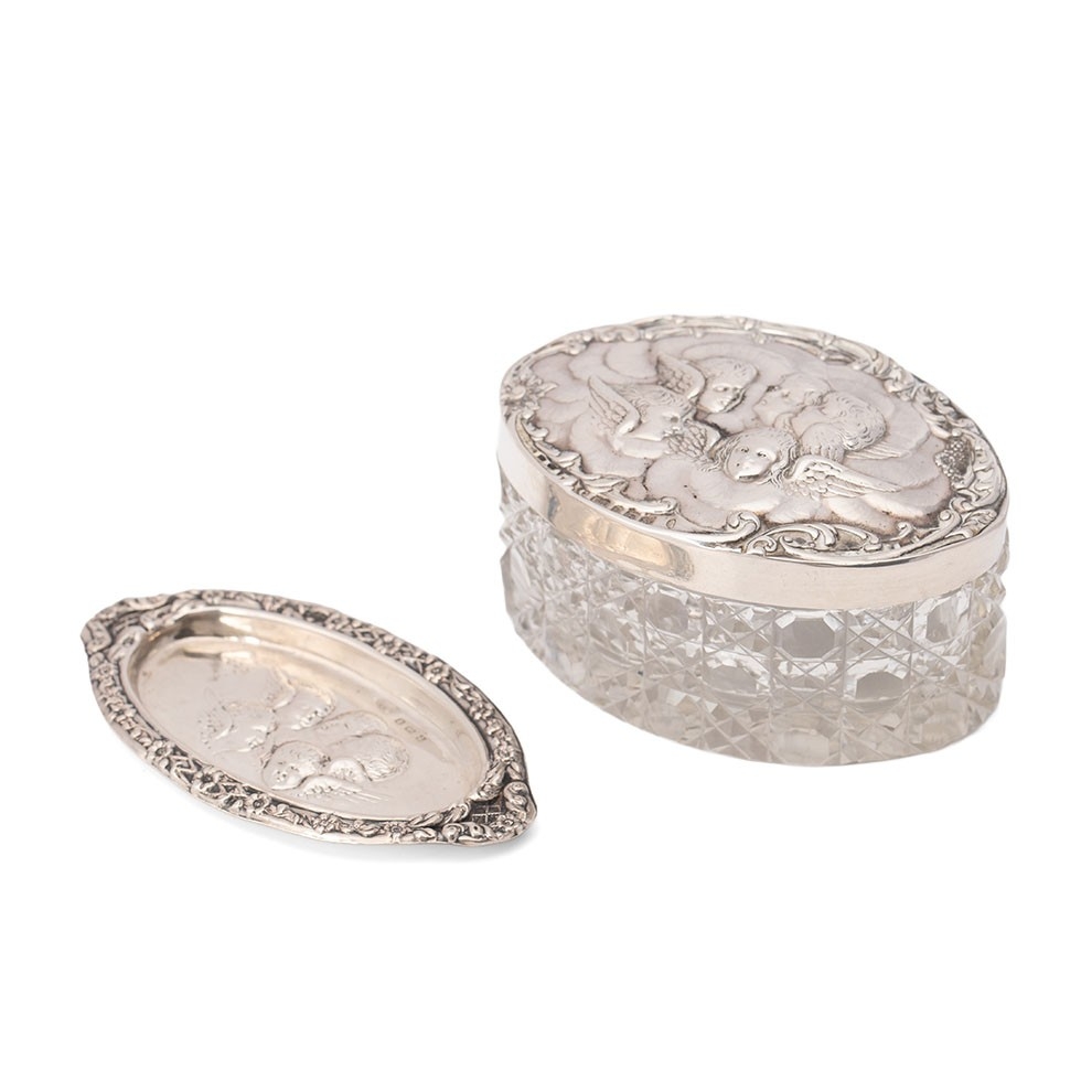 Two Silver Reynold's Angels design items to include a trinket box, Birmingham 1907, 9.5cm diameter, with a pin tray, Birmingham 1910, 10cm diameter, silver weight 38.9g.