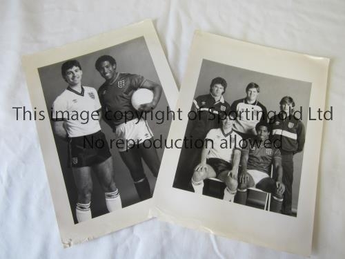 PRESS PHOTOS / ENGLAND Seven B/W photos, two 12" X 9.5" with notation sheets on the reverse from the 1980's showing the new kit and 5 wirephotos including action v Scotland and Finland. Good