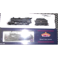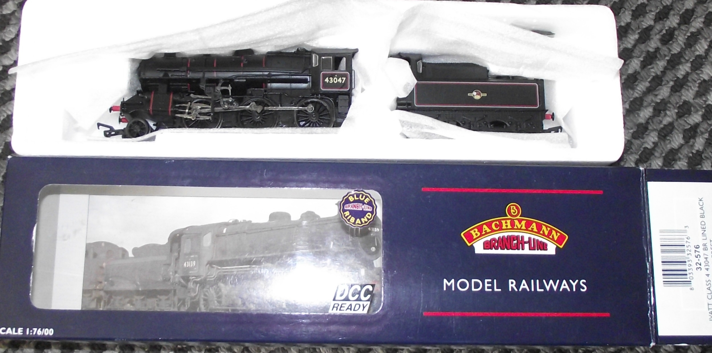 A Bachmann Branch-Line 00 Gauge model railway locomotive, model number 32-576, depicting a 2-6-0 Ivatt Class 4 steam locomotive, numbered 43047, in BR Lined Black livery, DCC Ready. Constructed from plastic and metal, the locomotive is accompanied by its matching tender. It is presented within its original cardboard display box, which features a clear viewing window and protective foam inserts. The packaging is marked with "MODEL RAILWAYS, " "SCALE 1:76/00," and a "BLUE RIBAND" emblem.