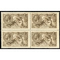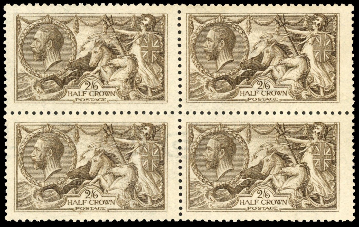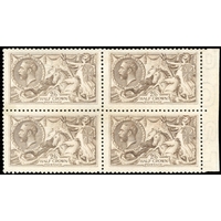 1915 2s6d sepia (seal-brown), DLR printing with watermark inverted, block of 4 with the lower pair showing â??POSâ?? of â??POSTAGEâ??, mint o.g., the lower left stamp with a couple of minor gum wrinkles otherwise fine and very scarce. SG 408wi, ca