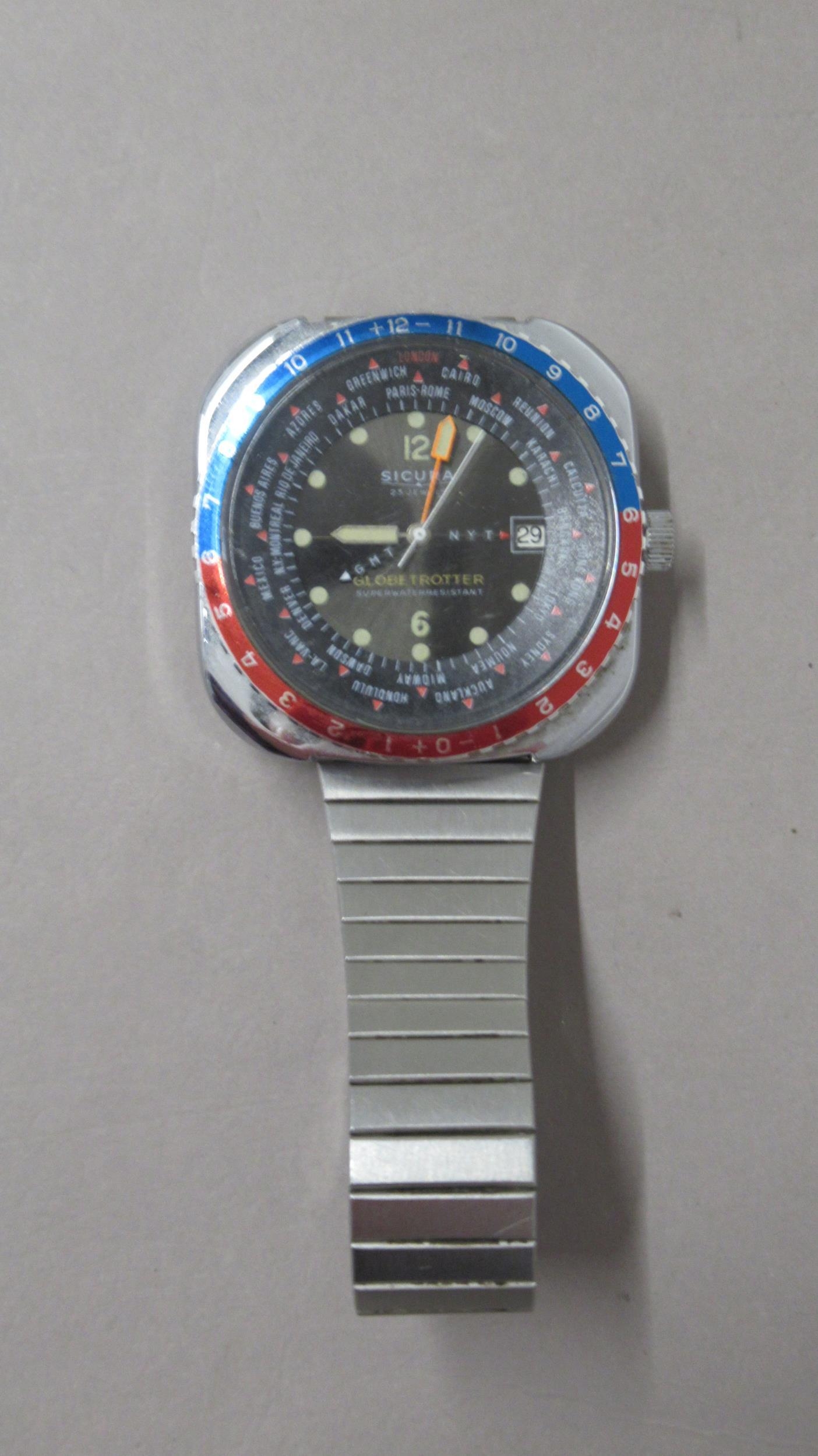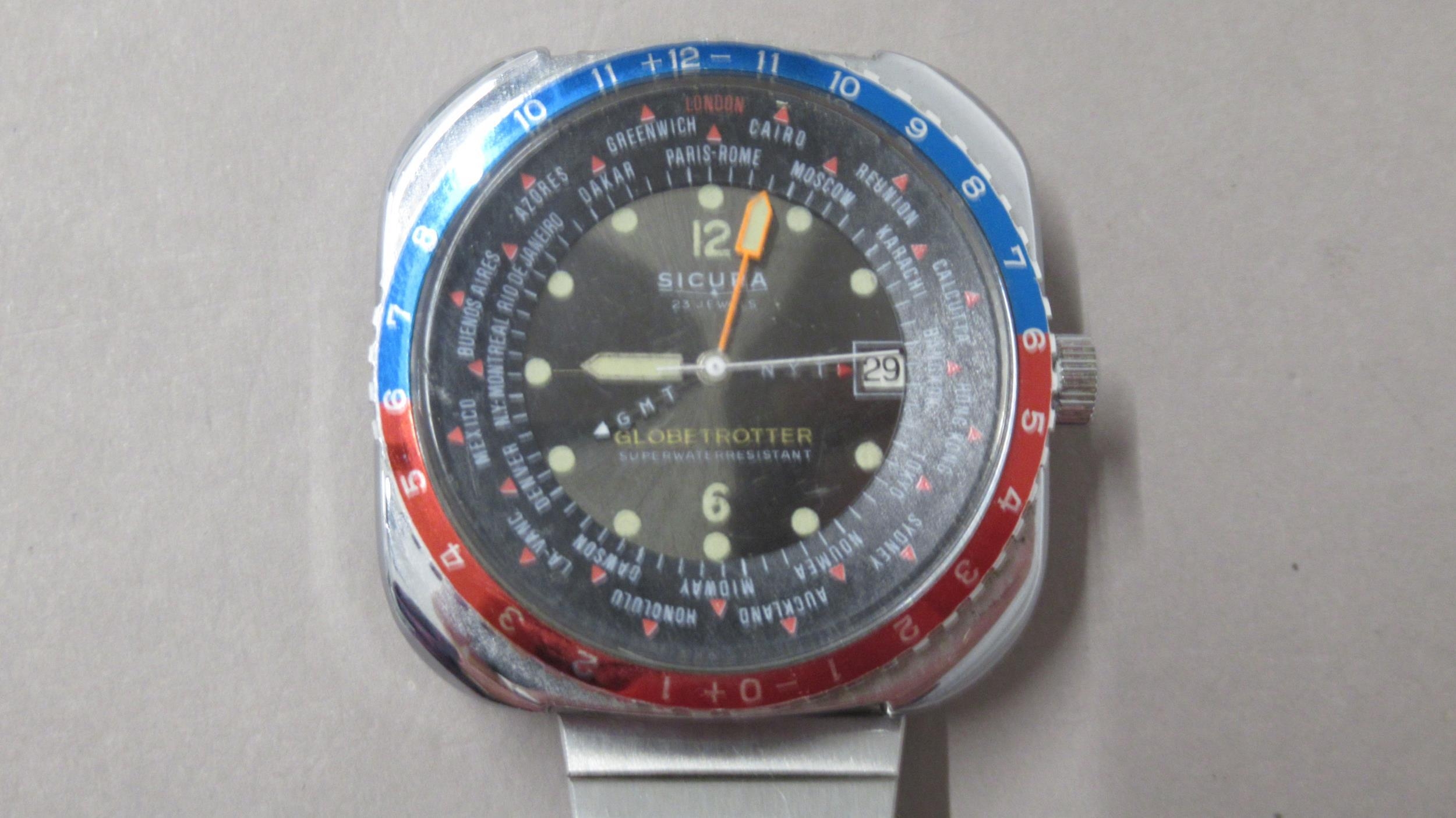 SICURA. Globetrotter 70's world timer. Manual 4 hands and sweep seconds. 40mm. Outer numbered bi direct bezel. Working