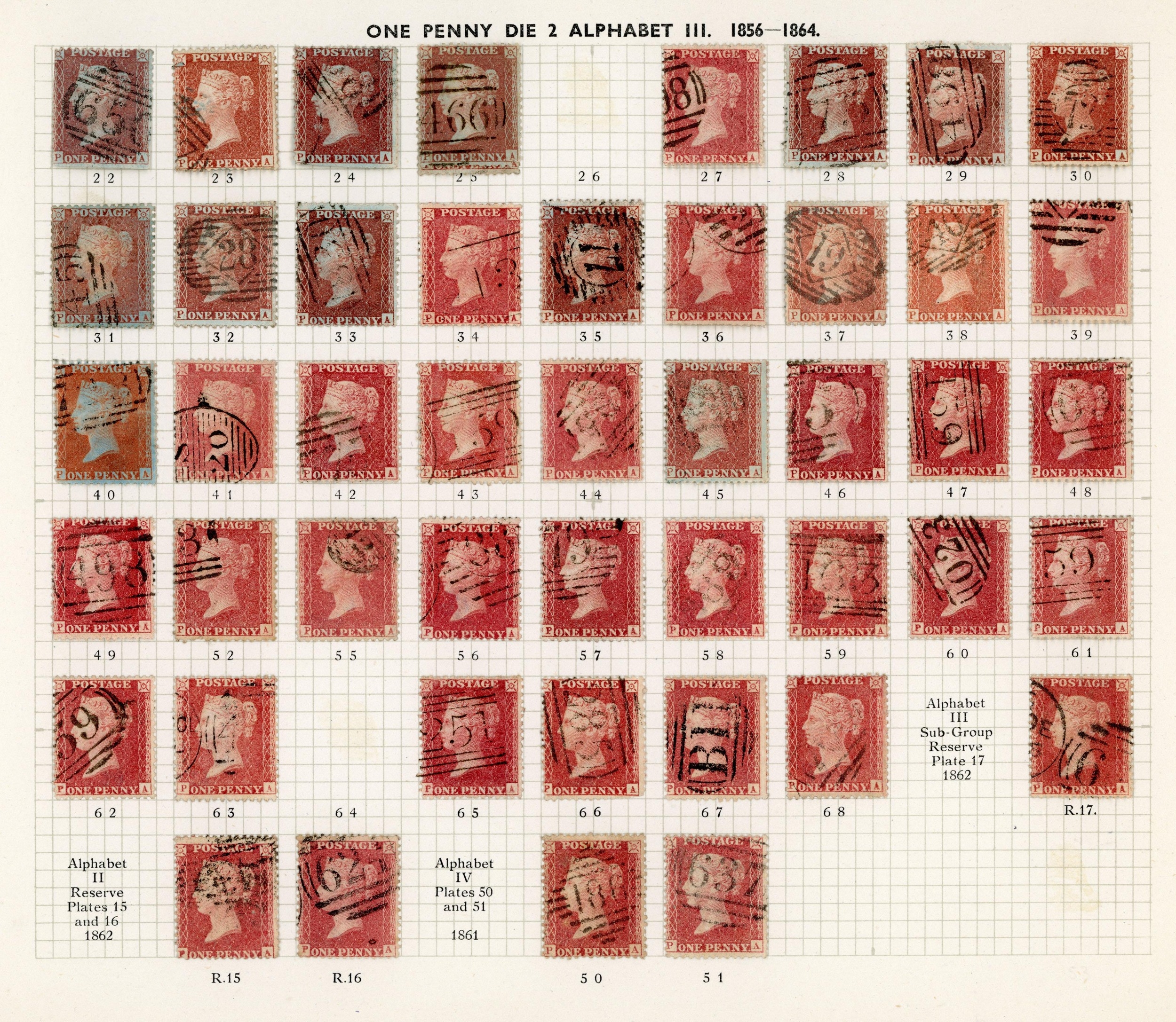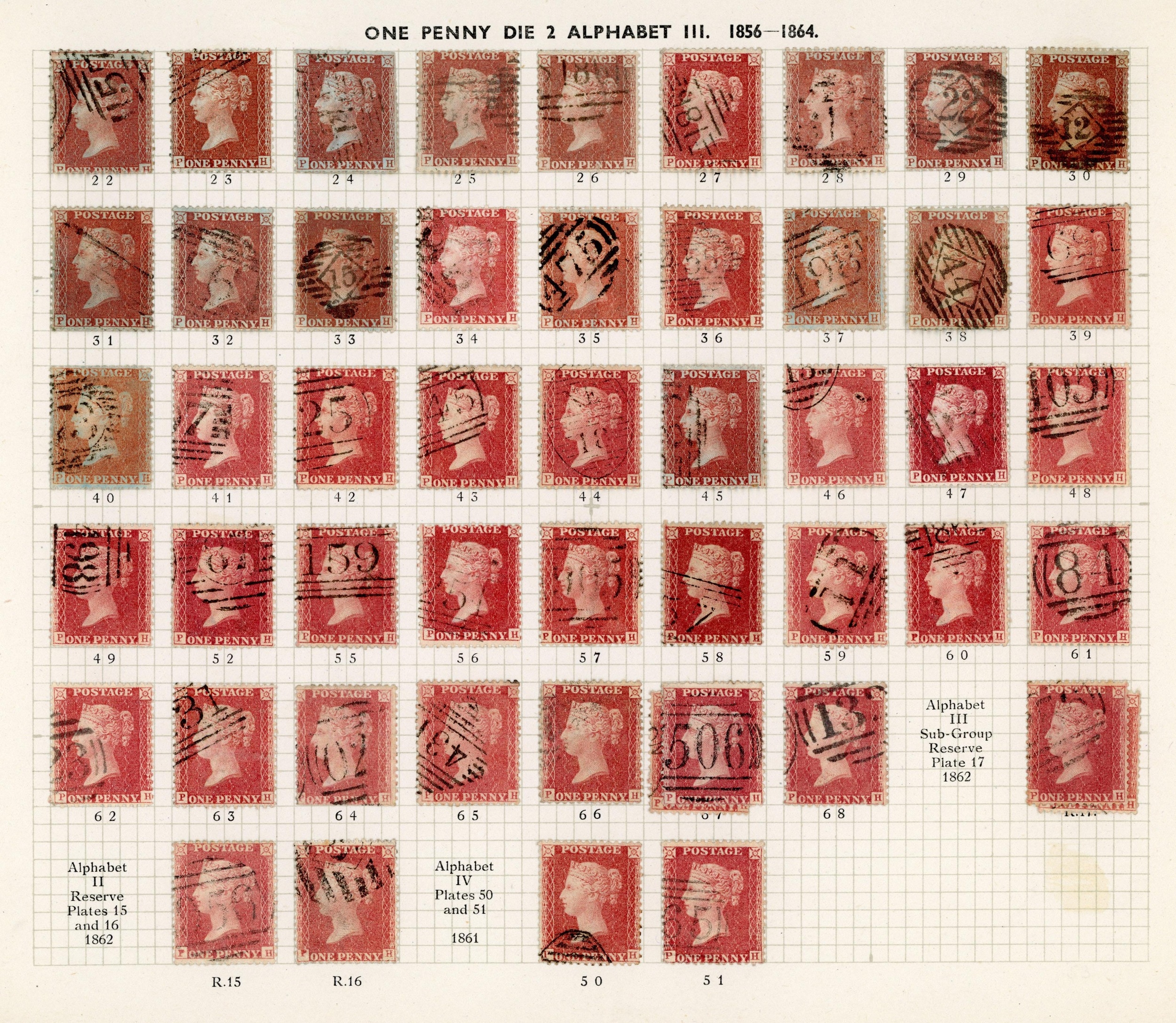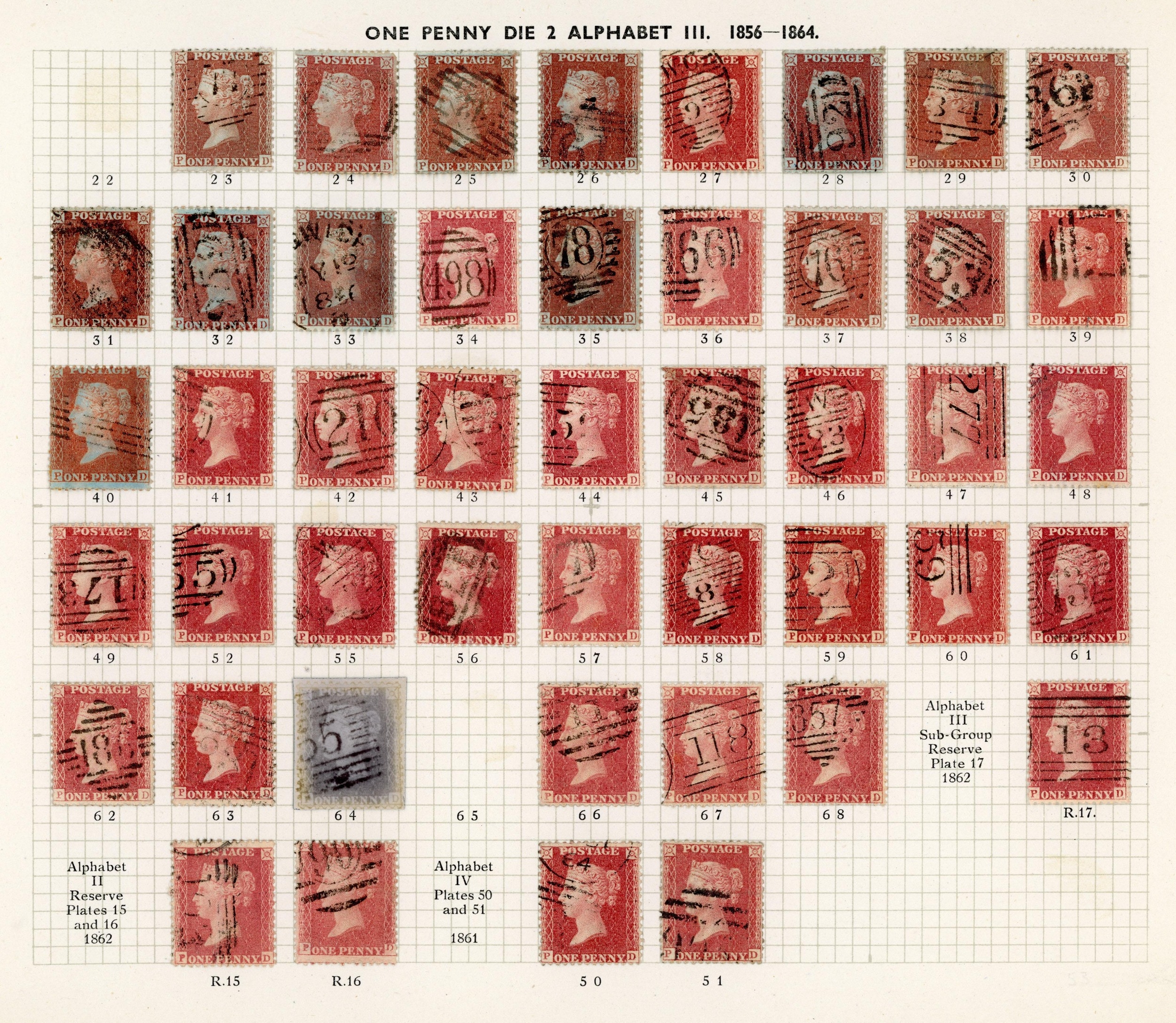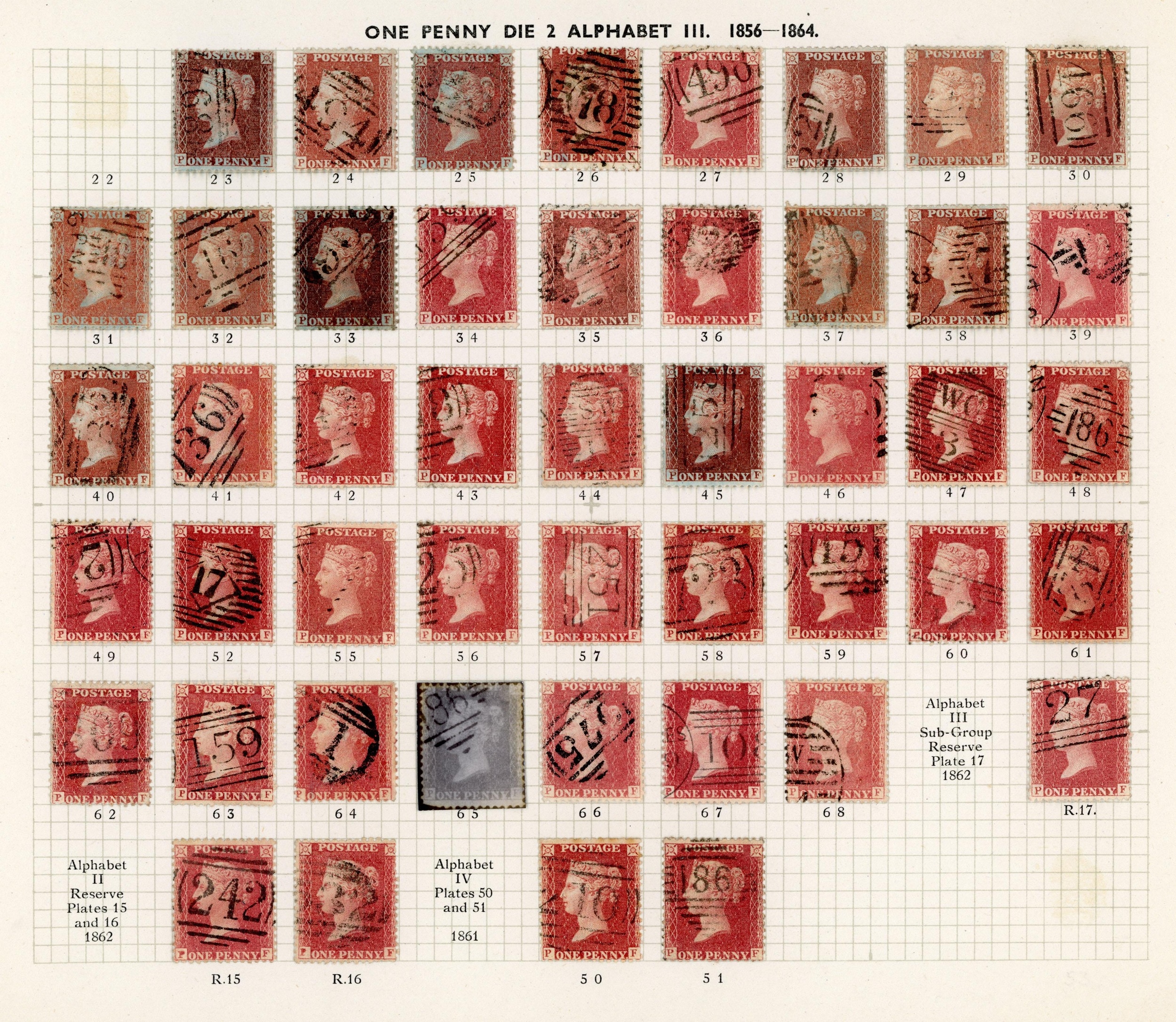 GB 1856-64 1d reds from Plate 22 - R17, the P Row