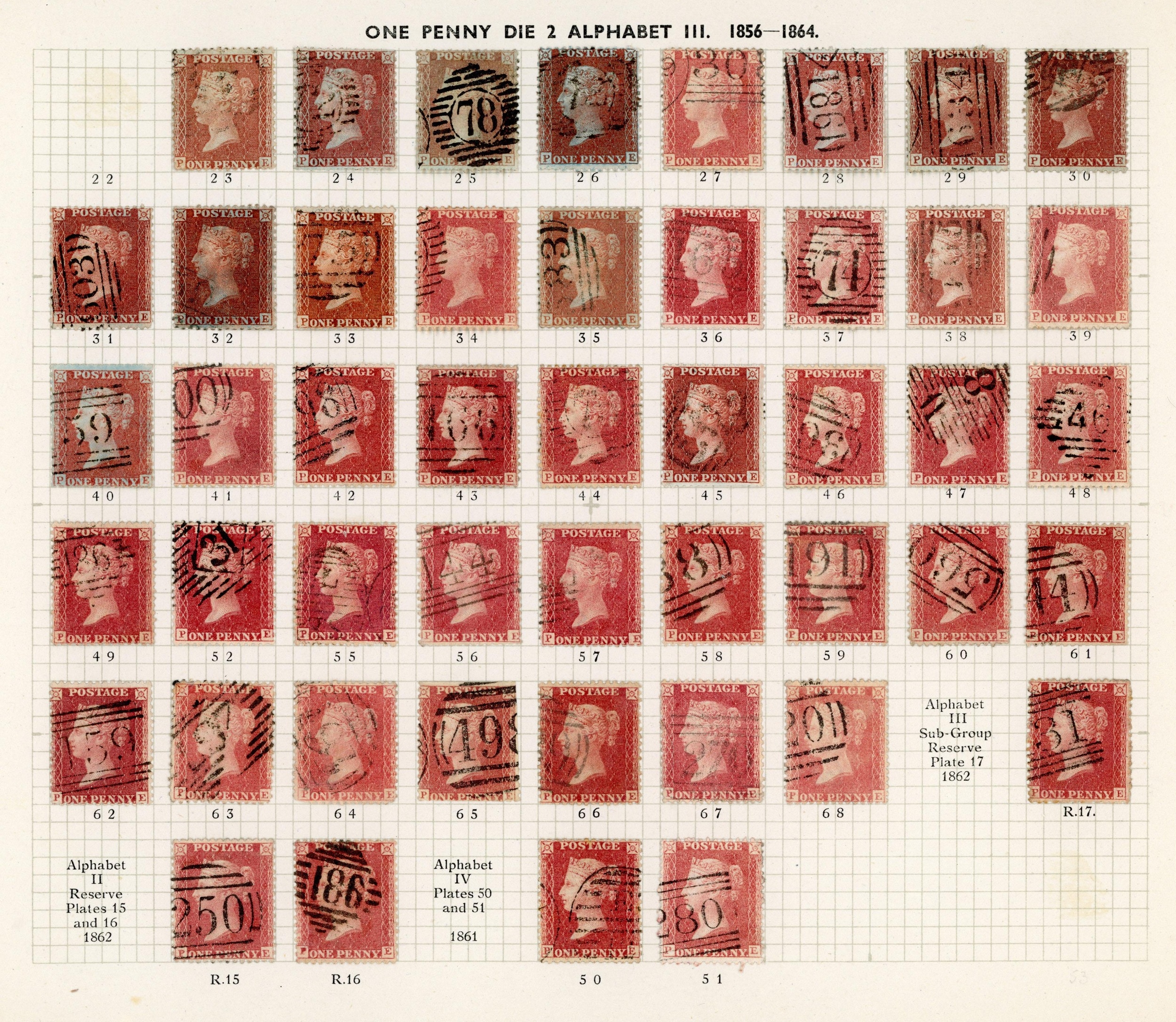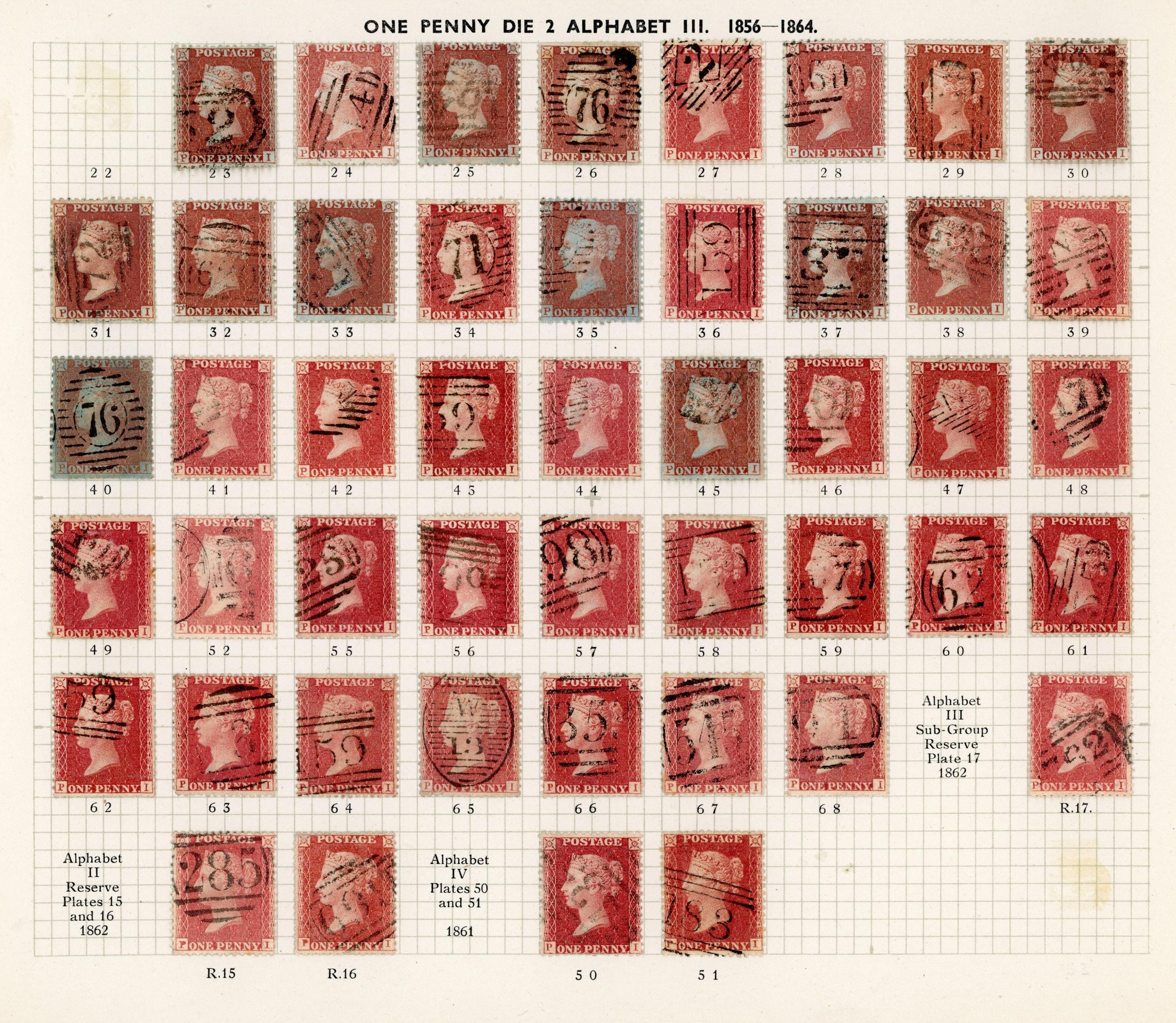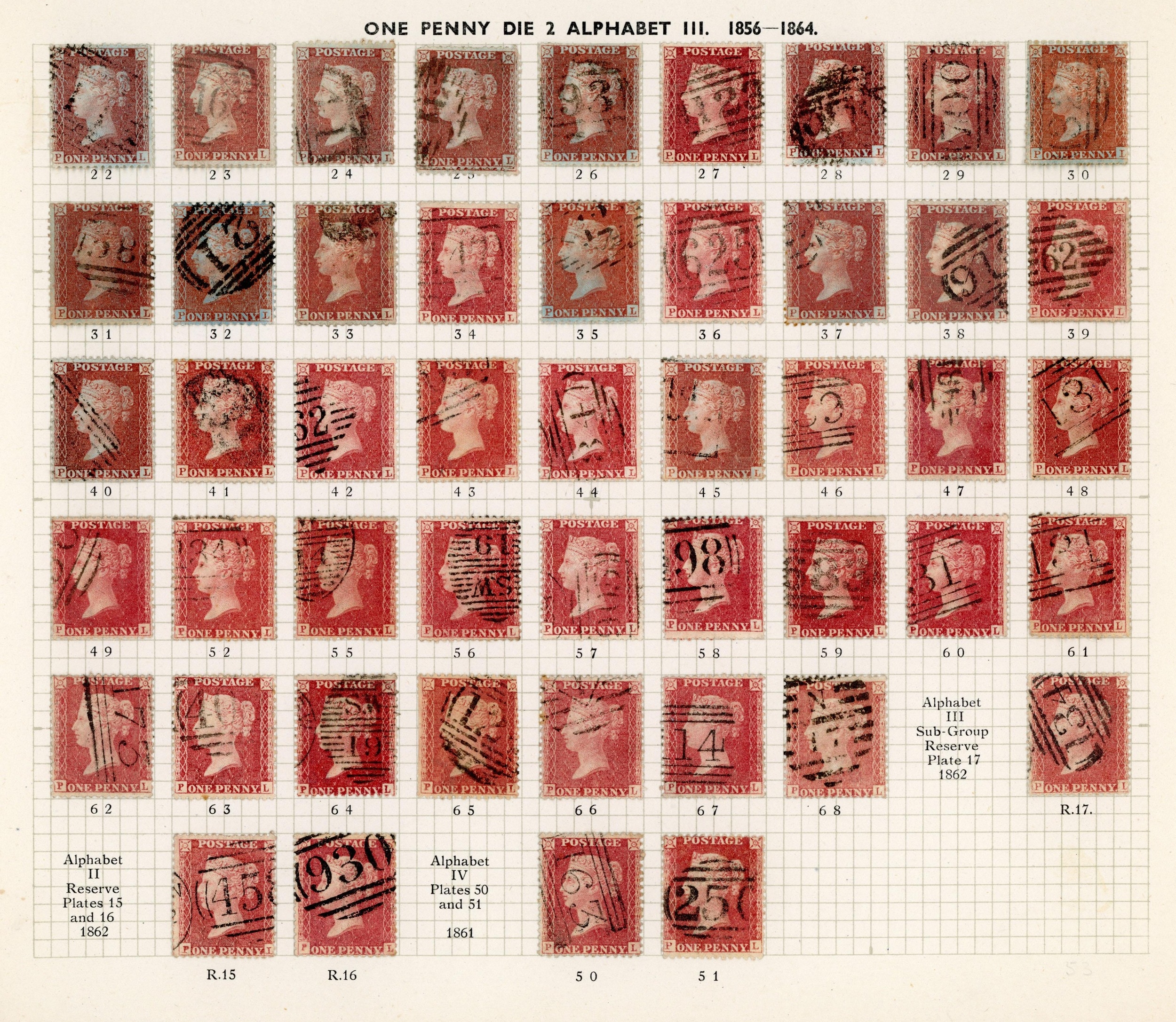 GB 1856-64 1d reds from Plate 22 - R17, the P Row