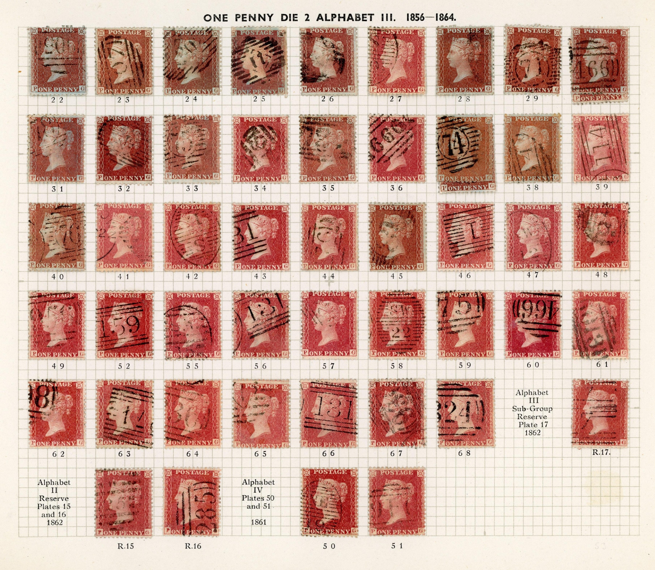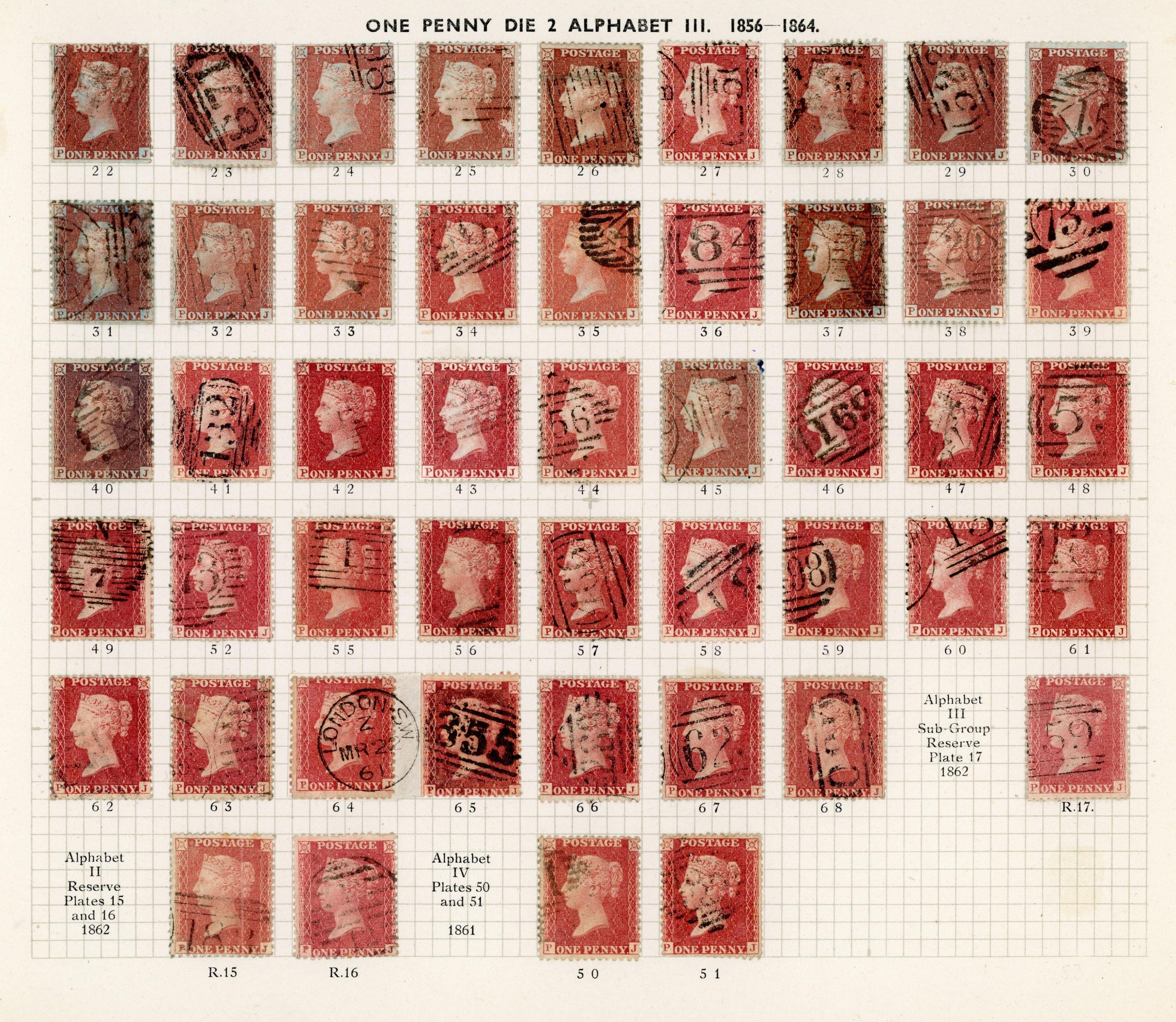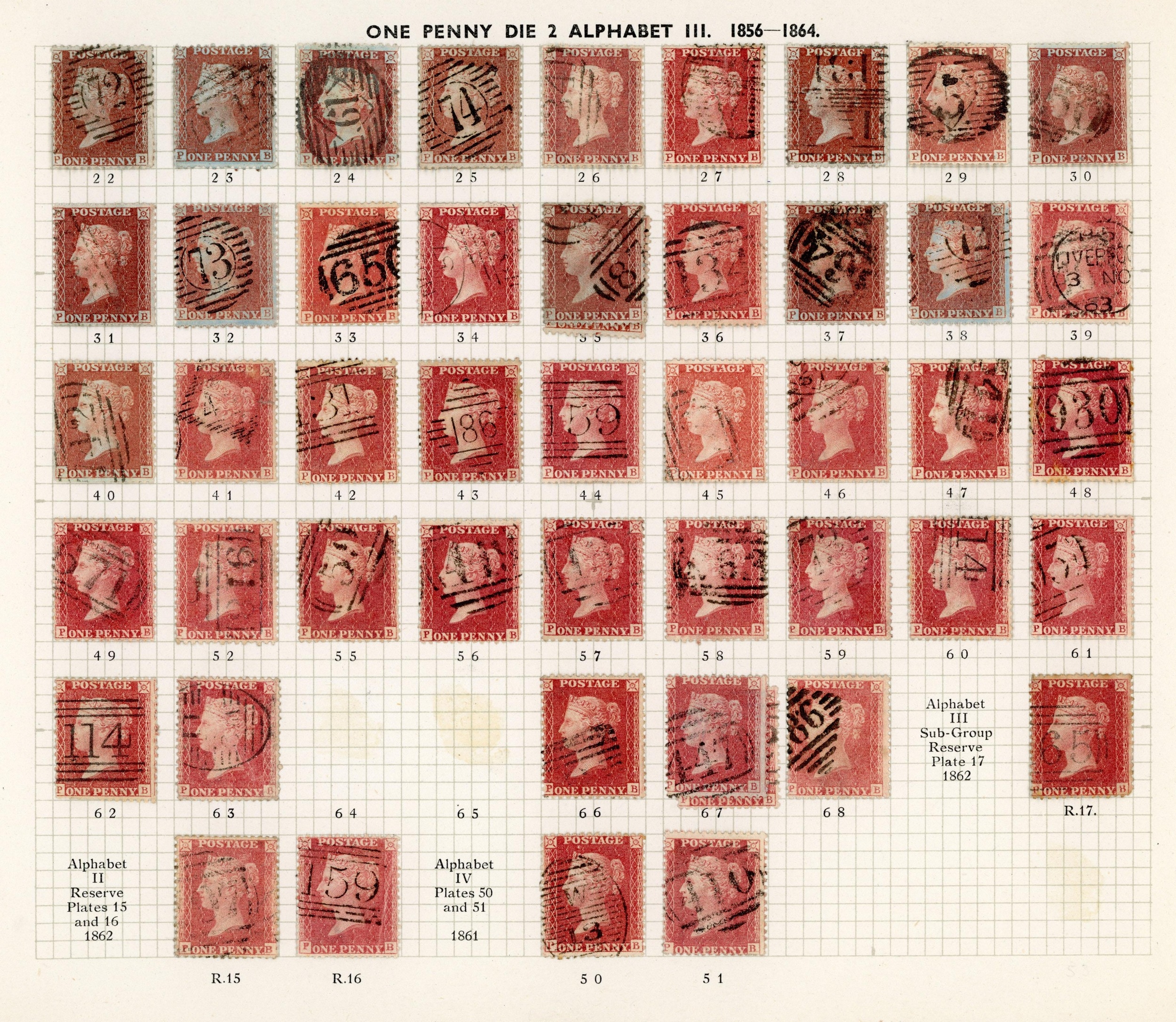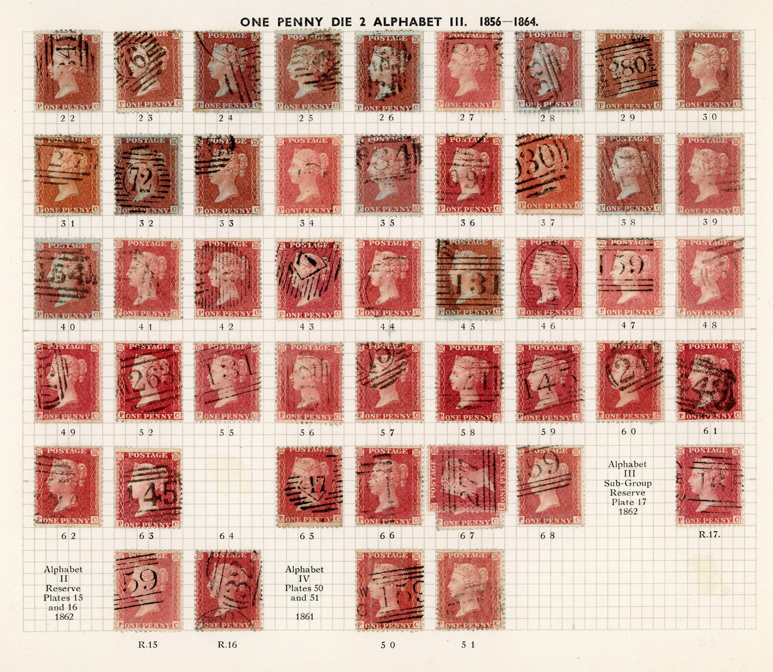 GB 1856-64 1d reds from Plate 22 - R17, the P Row