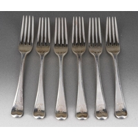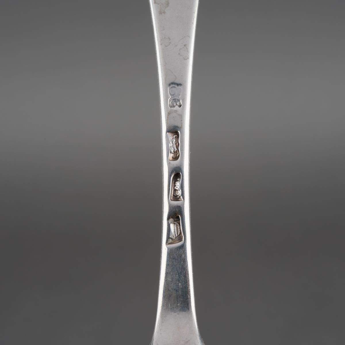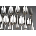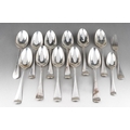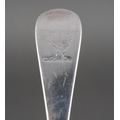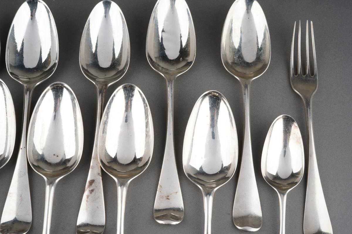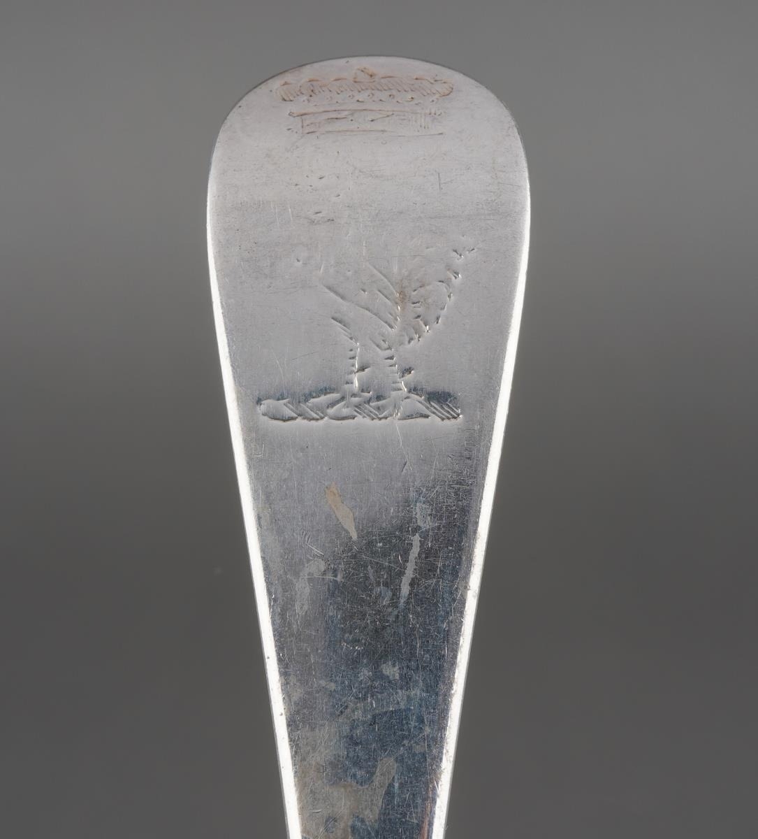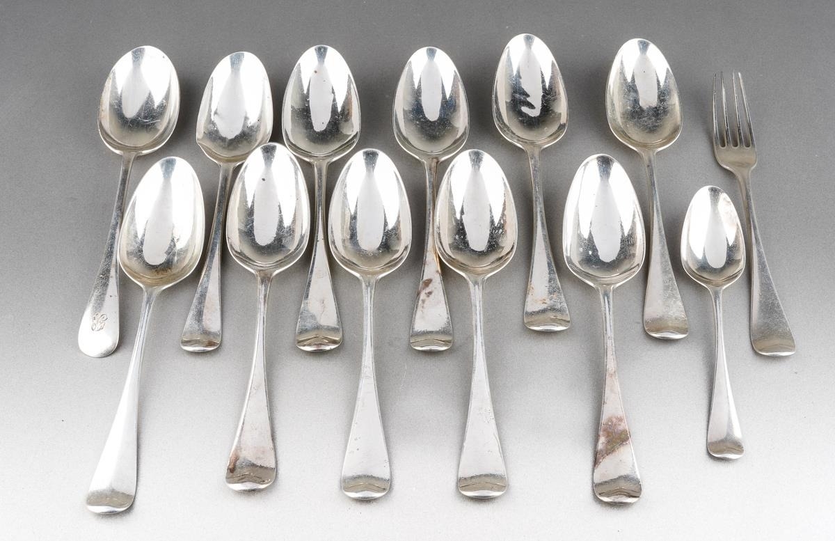 A set of nine George II Hanoverian pattern table spoons, each reverse terminal engraved with a crest beneath coronet., by Ebenezer Coker, London, 1759 together with a Georgian table spoon, a table fork and a dessert spoon, various makers, crest en suite and a Walker & Hall table spoon, with initials, Sheffield, 1933, gross approx weight 940.6 grams [1 bag]