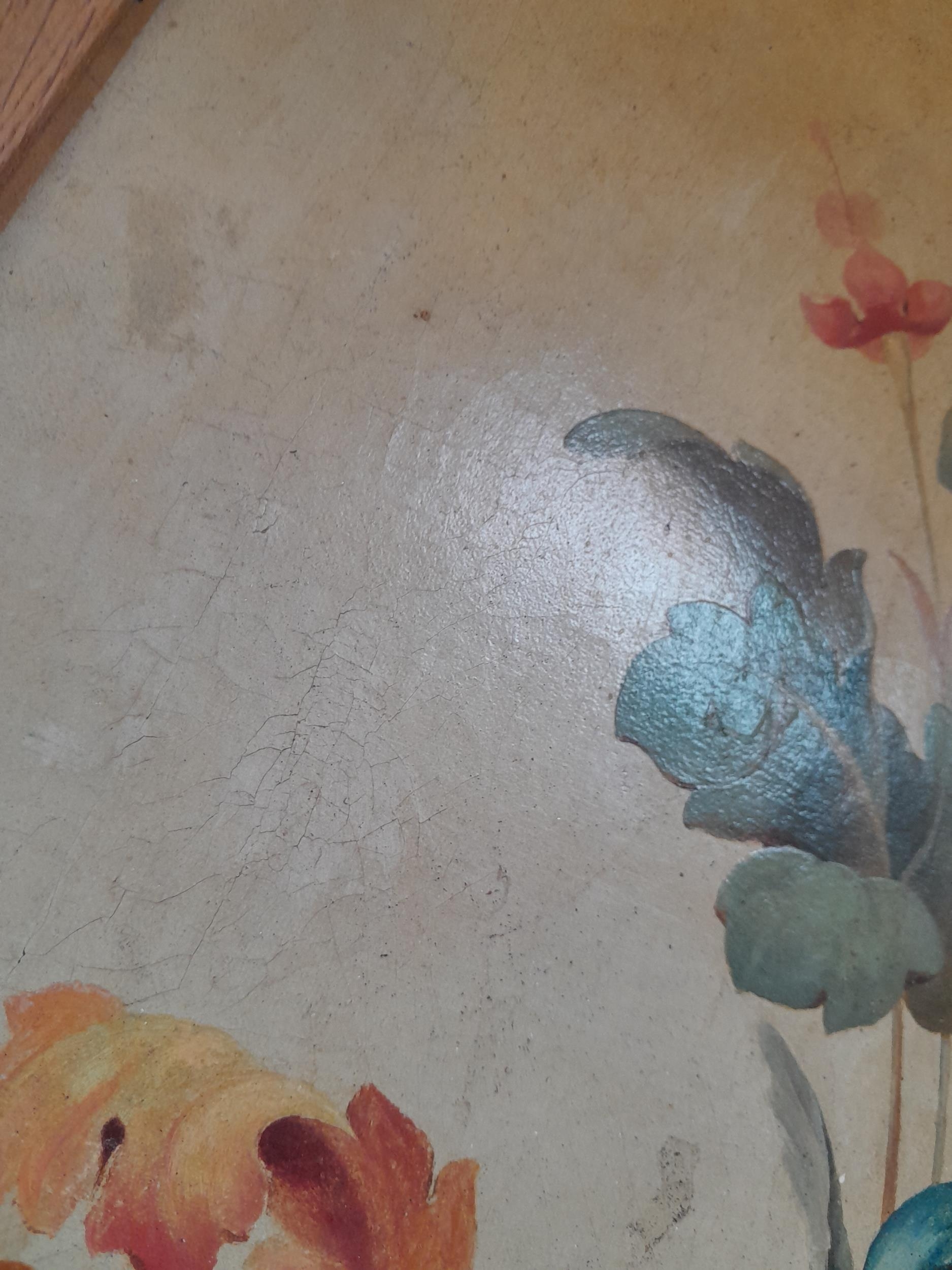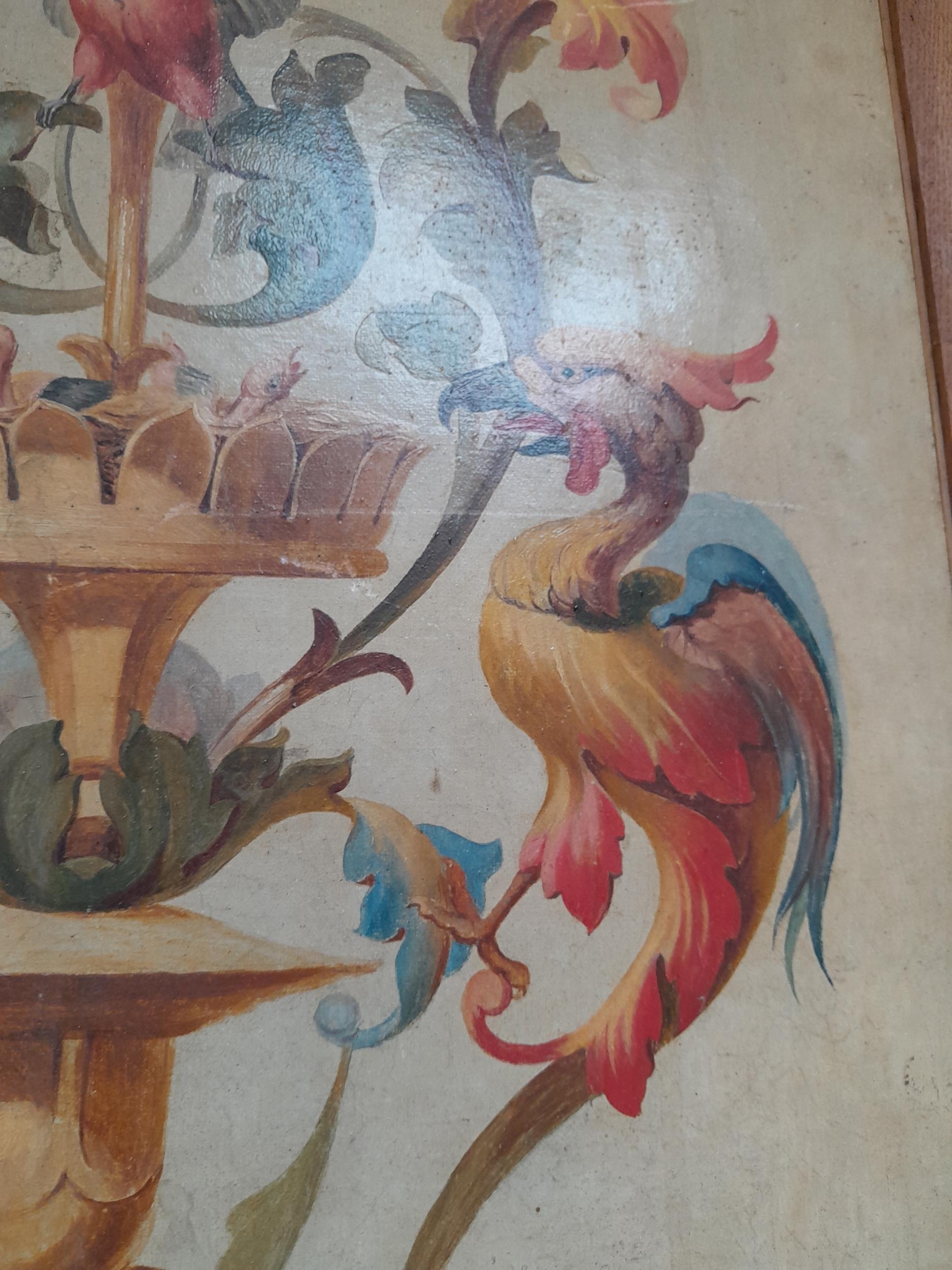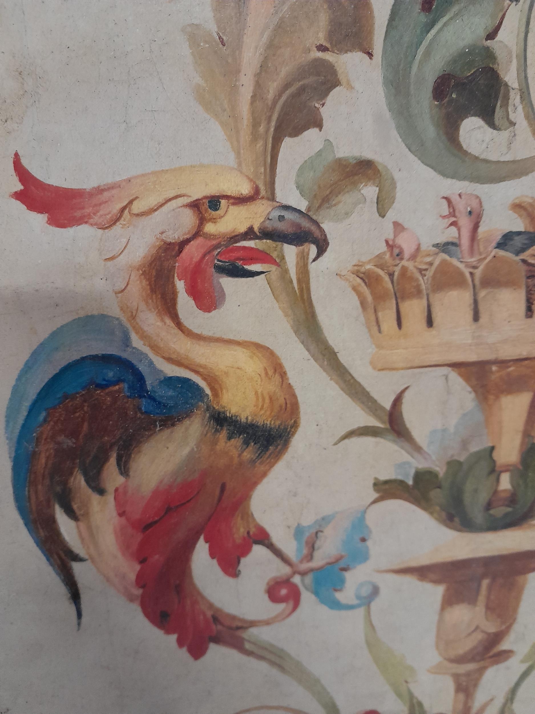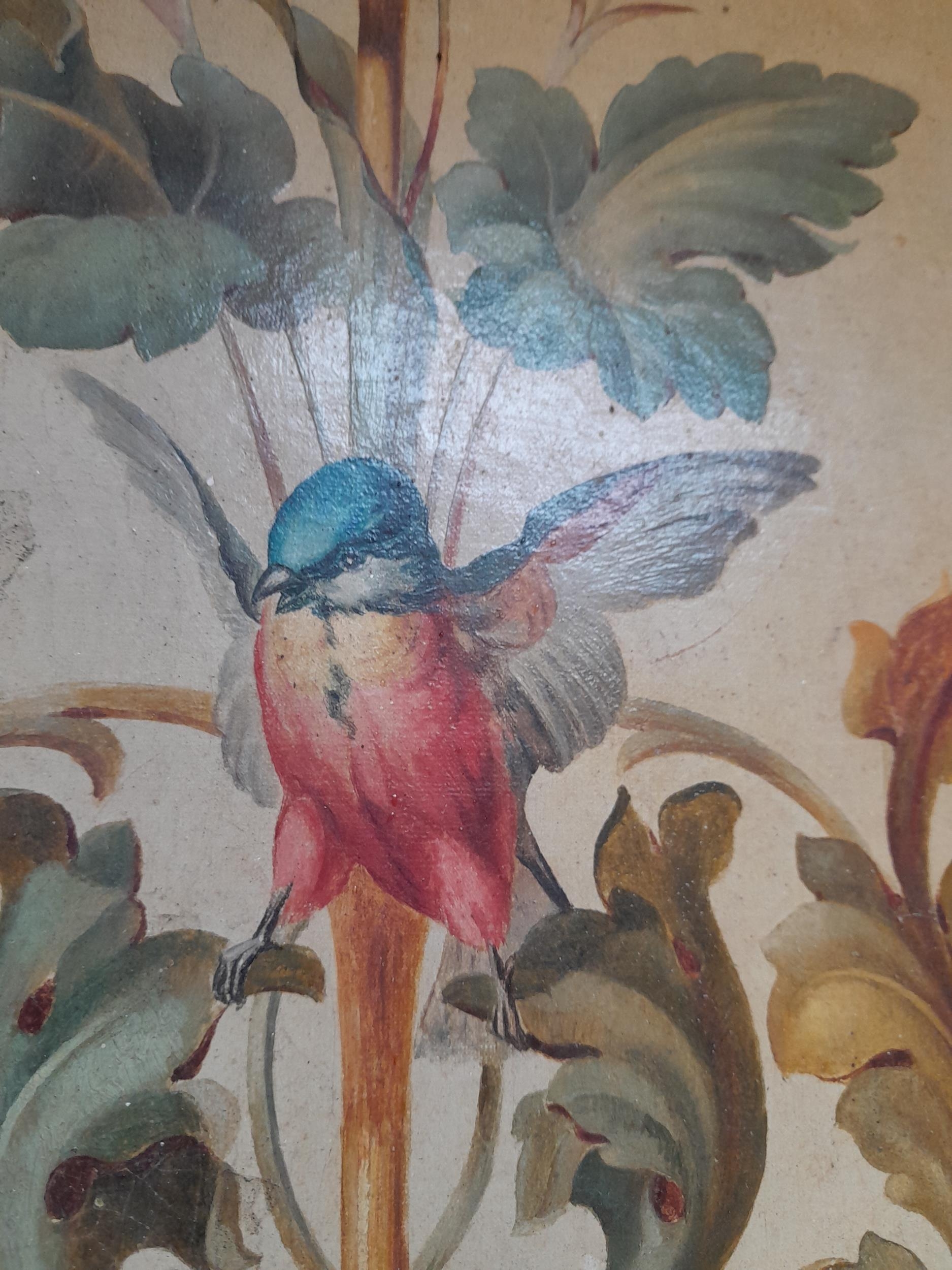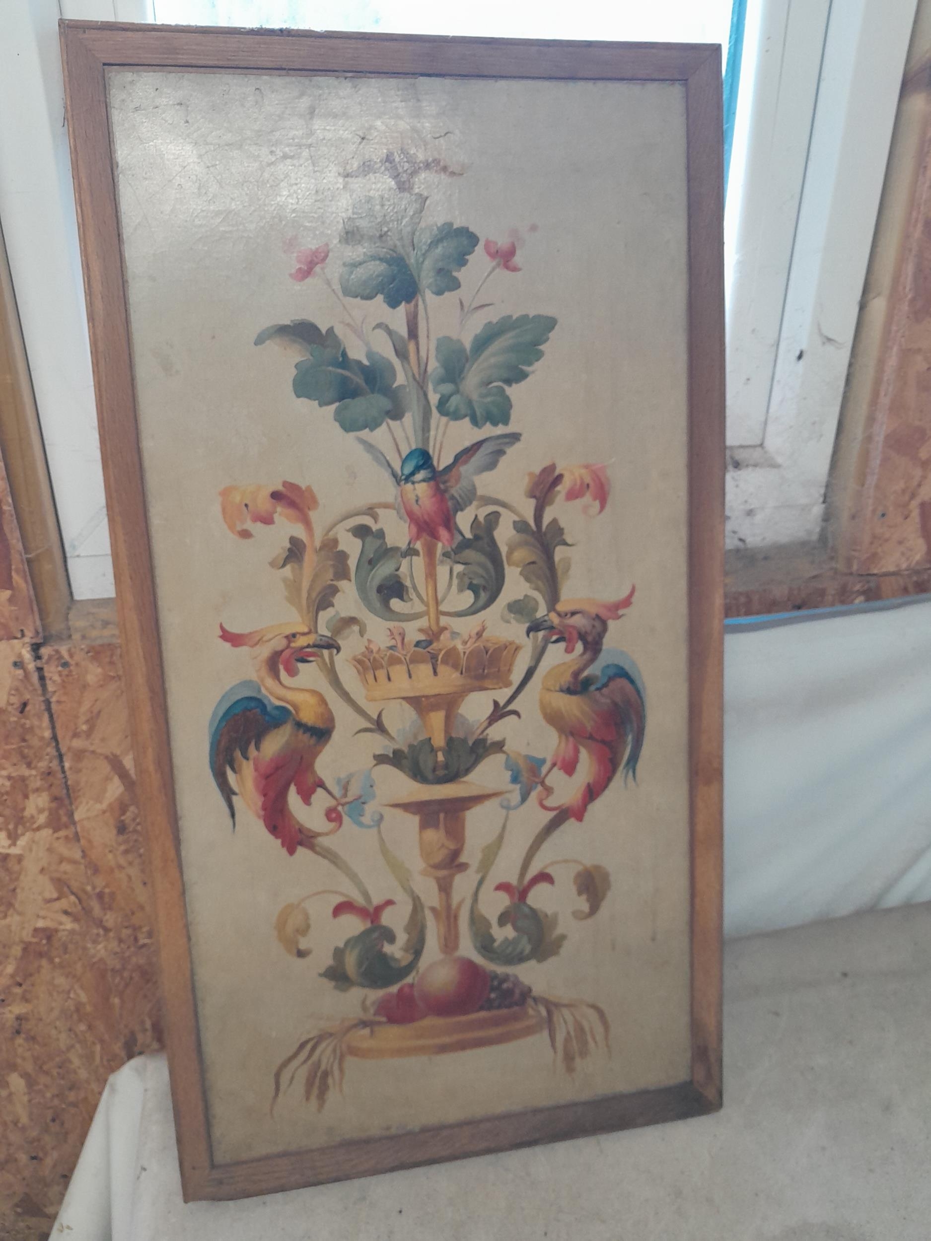 Interesting 19th century Continental school, Mythical Birds and Flowers oil on canvas and later backed by hardboard with Charles & Co. label in 20th century frame