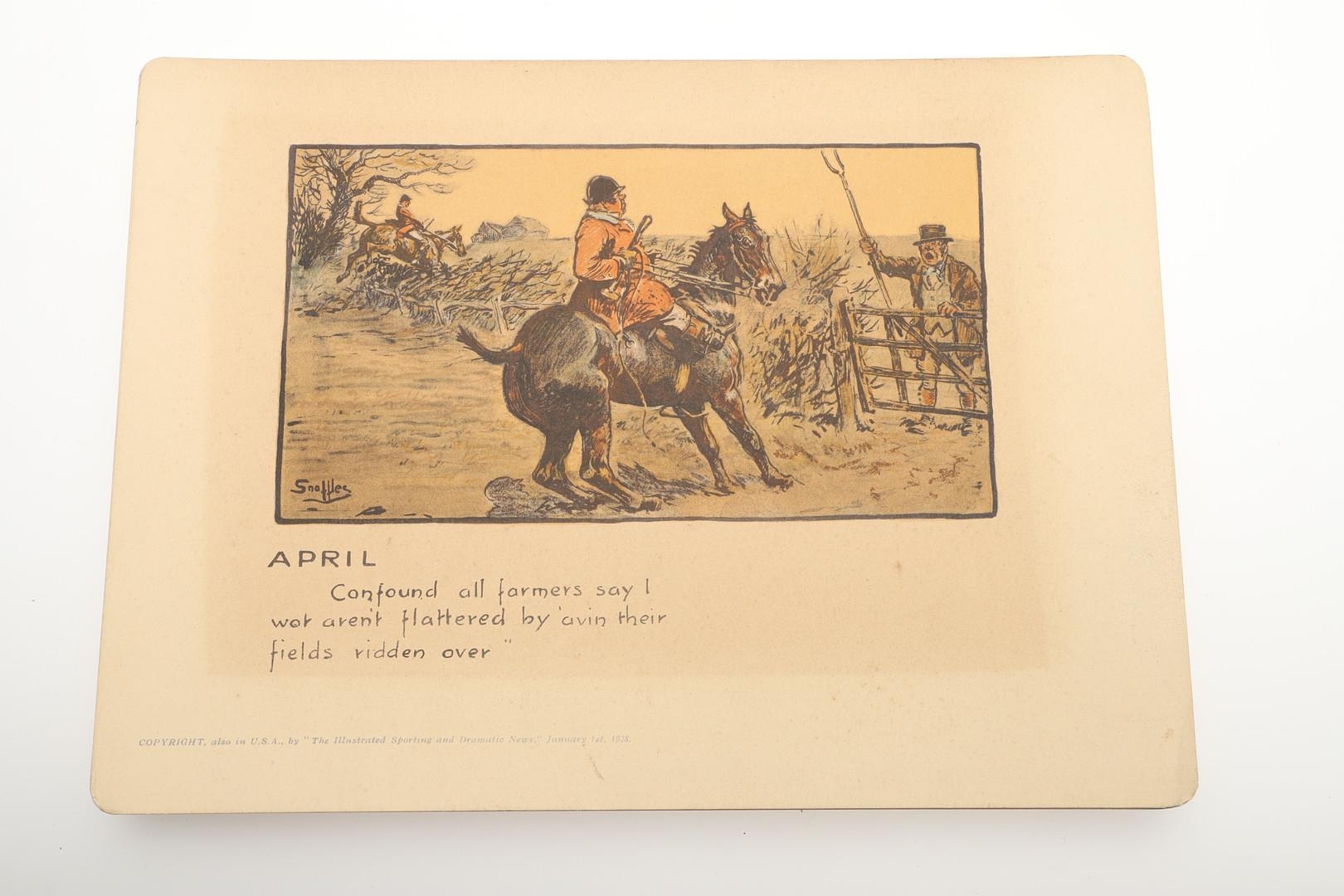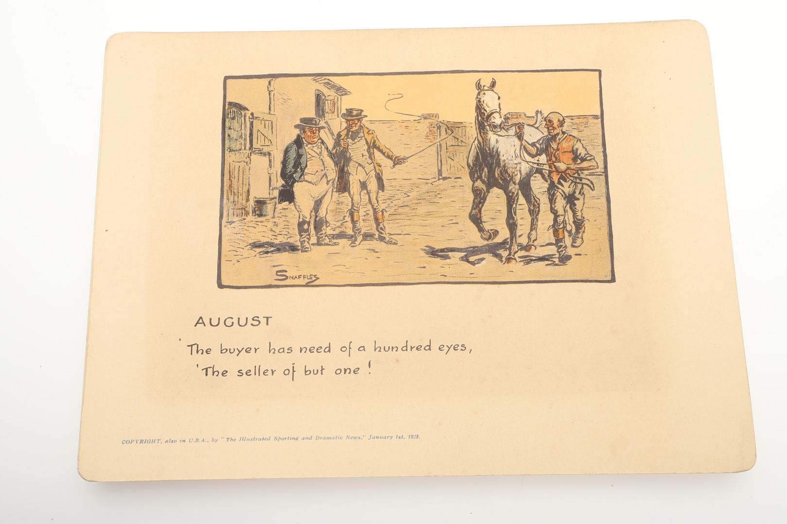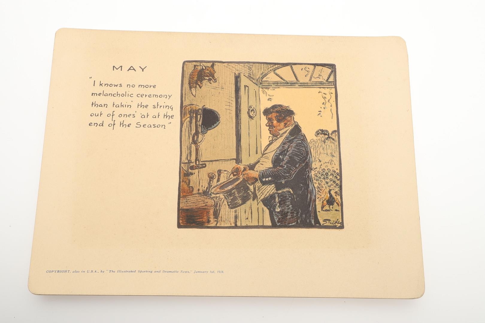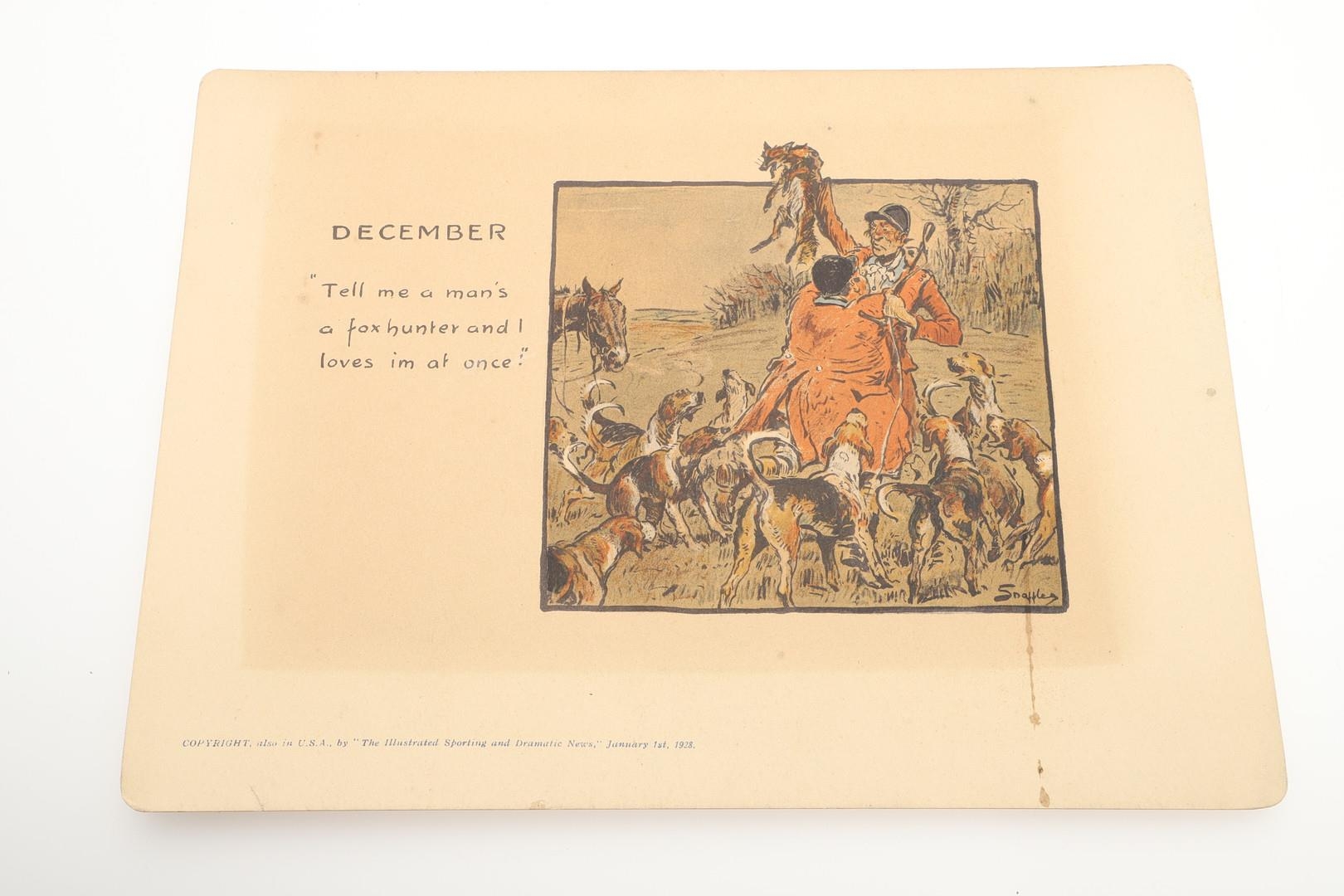SNAFFLES - SET OF SPORTING ANECDOTES OF THE YEAR. An unsual set of calendar prints, with one for each month and with differing titles and scenes. Marked 'Copyright, also in the USA by 'The Illustrated Sporting and Dramatic News, January 1st 1928', and in it's original case. Prints 27cms by 20cms. *CR Some foxing and discolouration of the paper over time. Case with some wear and 'browning' to the surface in places.