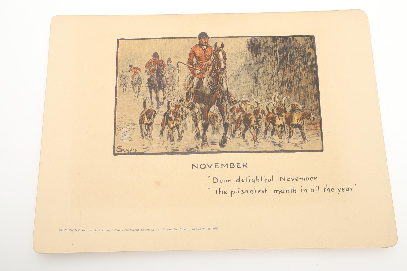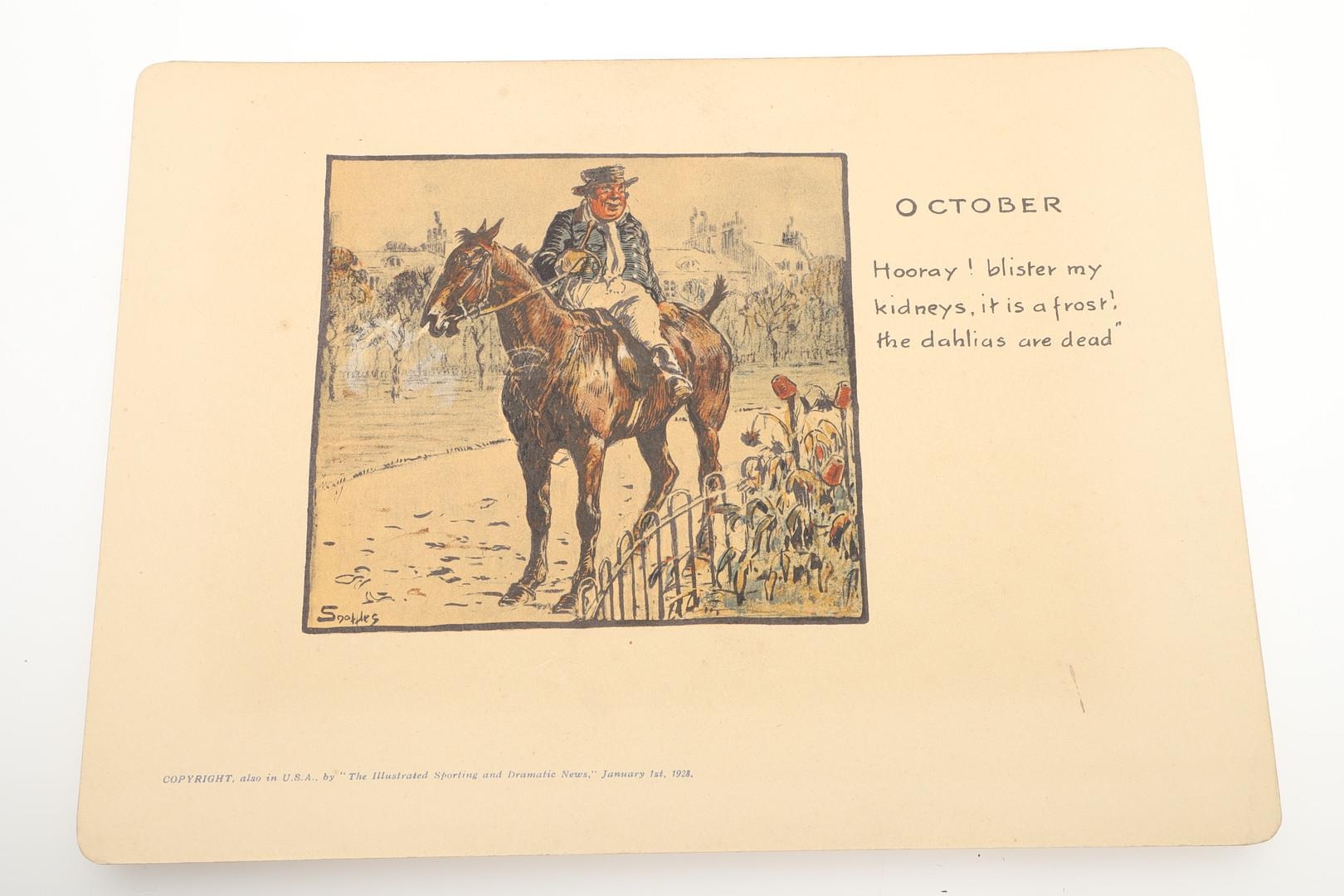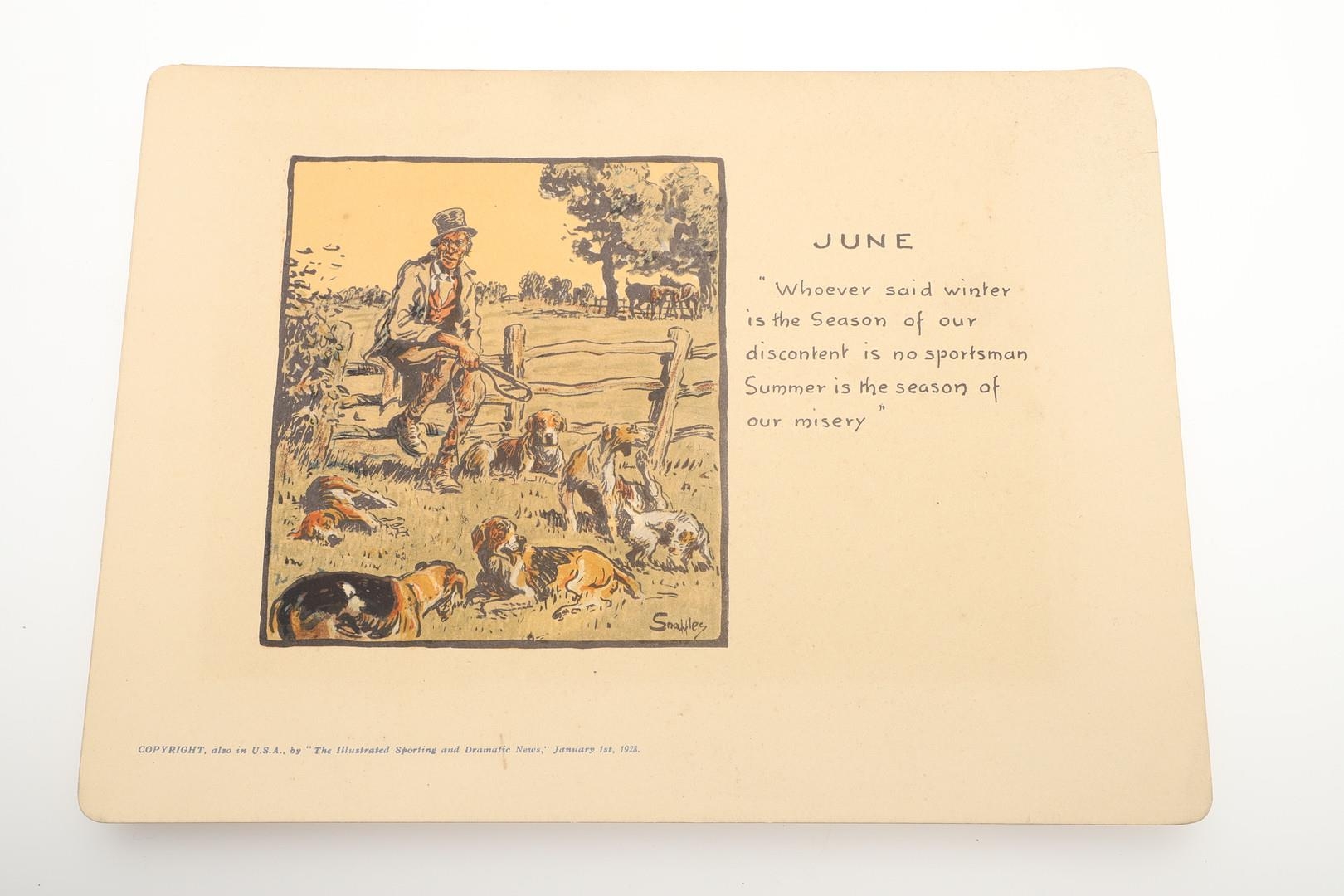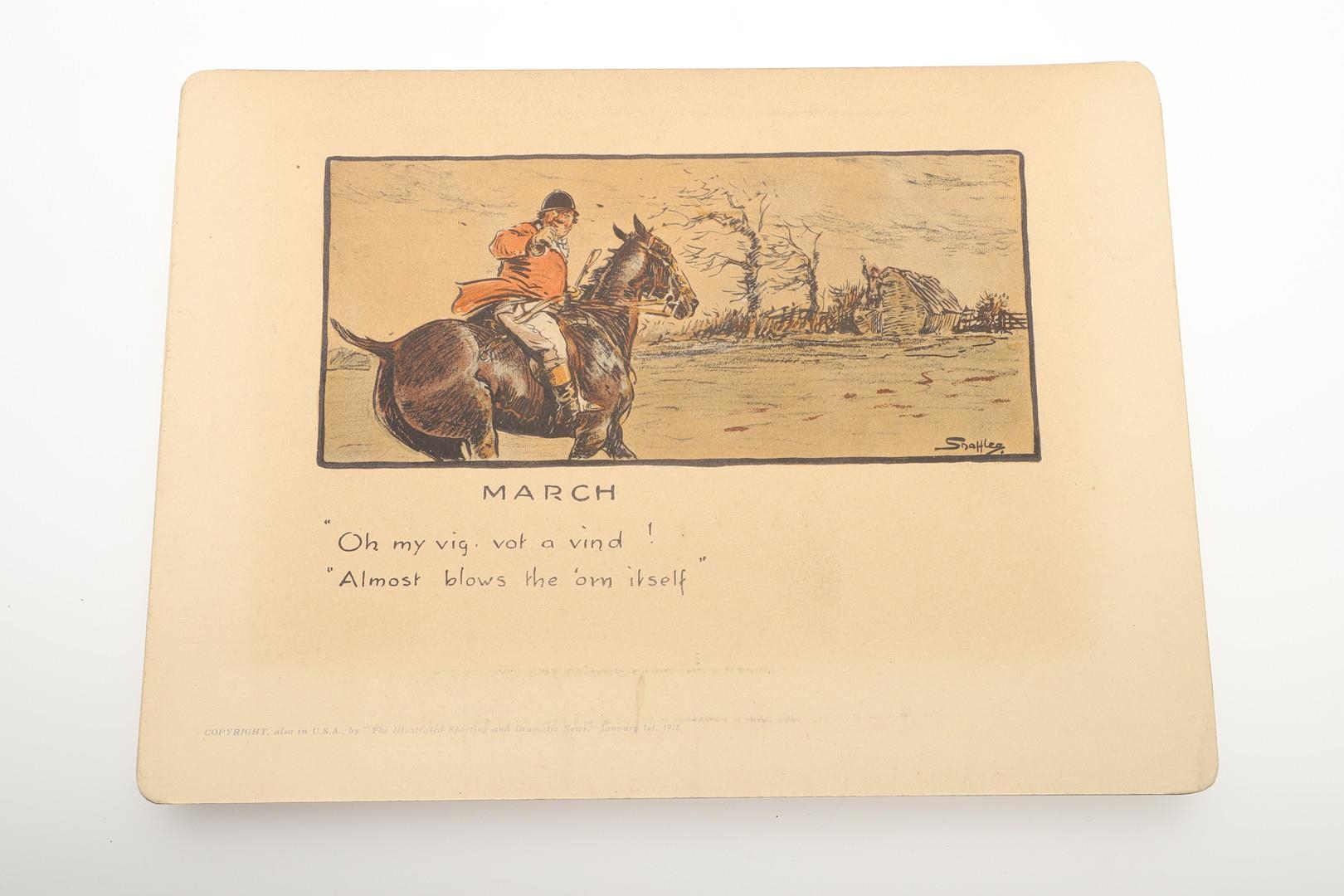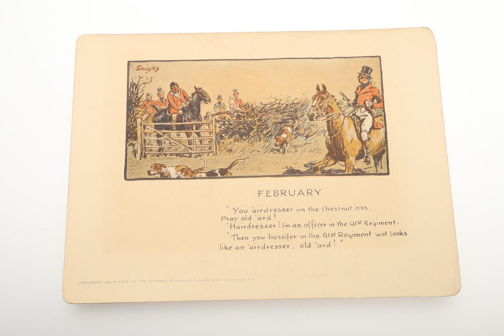 SNAFFLES - SET OF SPORTING ANECDOTES OF THE YEAR. An unsual set of calendar prints, with one for each month and with differing titles and scenes. Marked 'Copyright, also in the USA by 'The Illustrated Sporting and Dramatic News, January 1st 1928', and in it's original case. Prints 27cms by 20cms. *CR Some foxing and discolouration of the paper over time. Case with some wear and 'browning' to the surface in places.