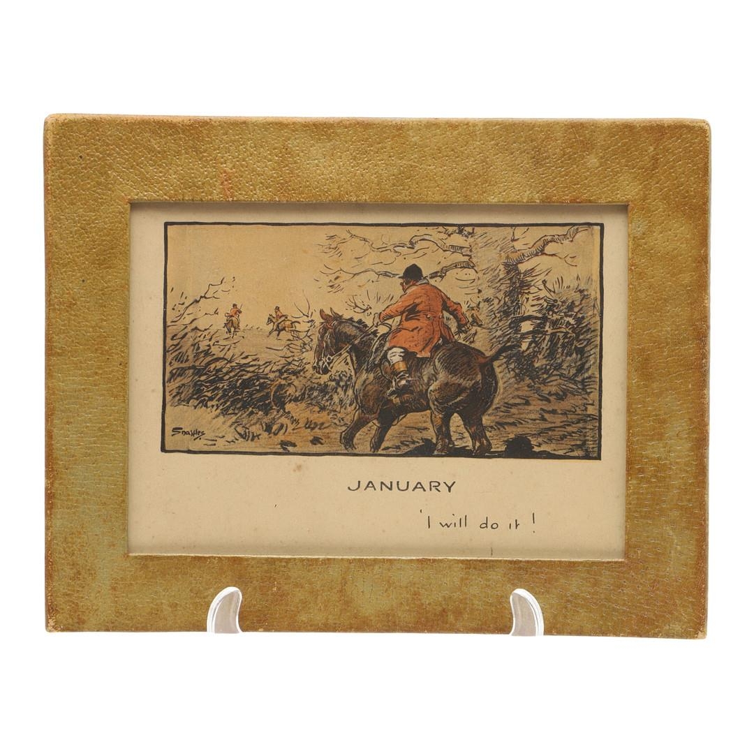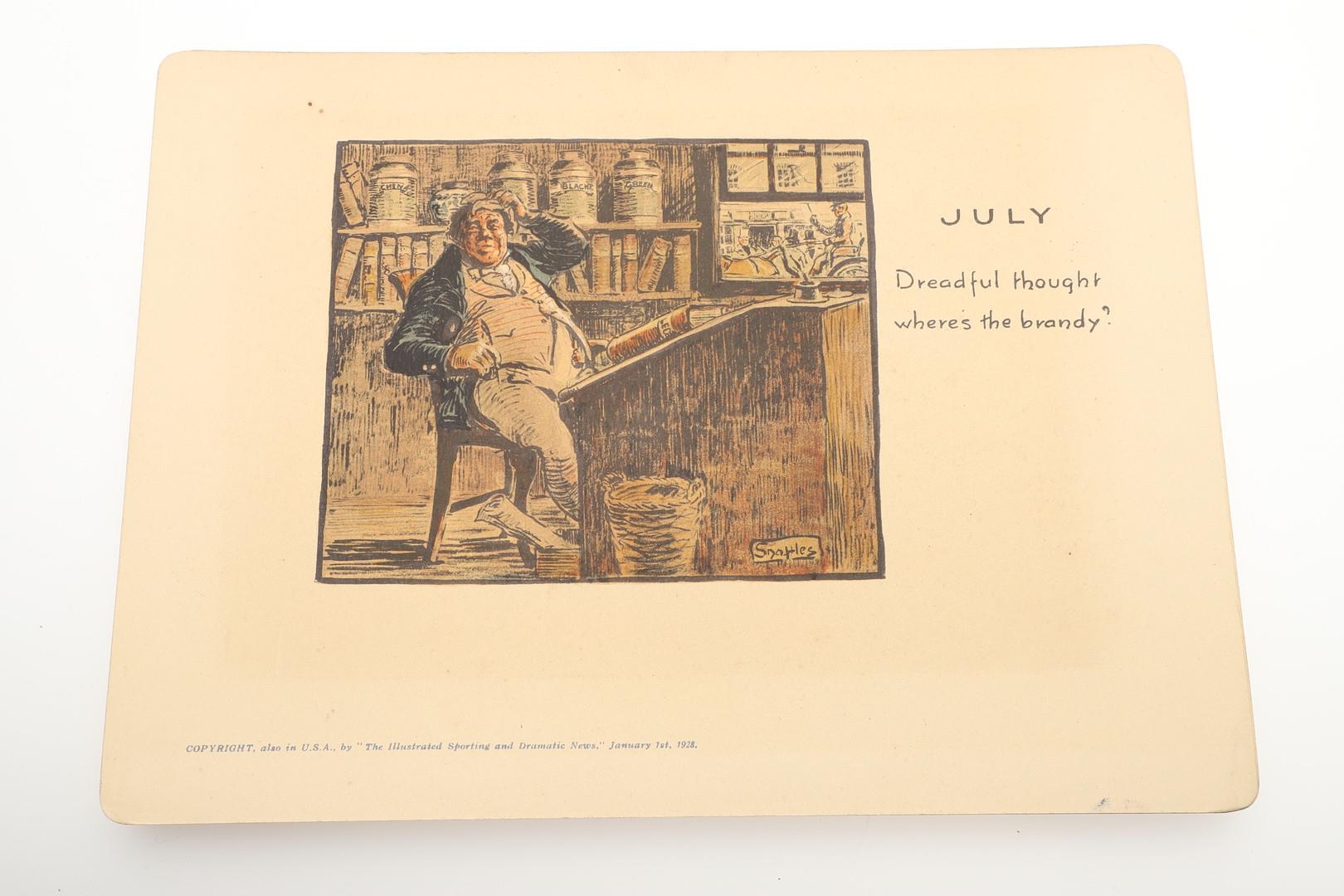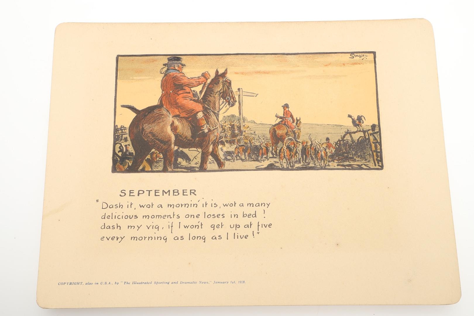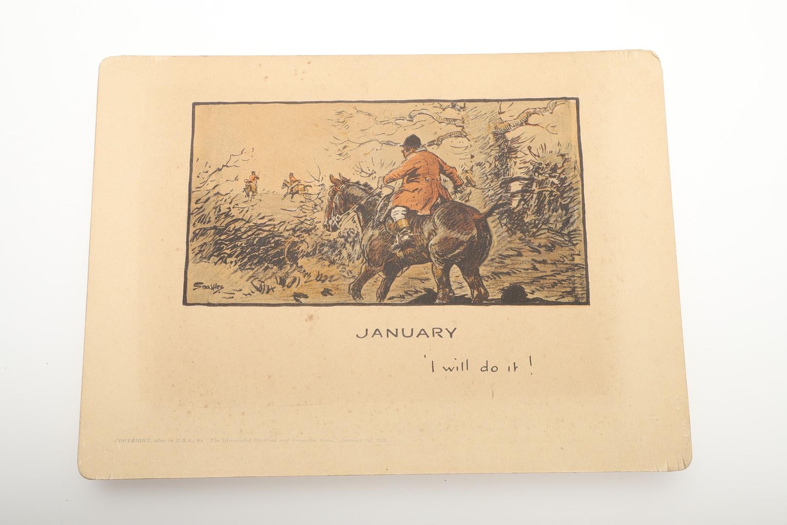 SNAFFLES - SET OF SPORTING ANECDOTES OF THE YEAR. An unsual set of calendar prints, with one for each month and with differing titles and scenes. Marked 'Copyright, also in the USA by 'The Illustrated Sporting and Dramatic News, January 1st 1928', and in it's original case. Prints 27cms by 20cms. *CR Some foxing and discolouration of the paper over time. Case with some wear and 'browning' to the surface in places.