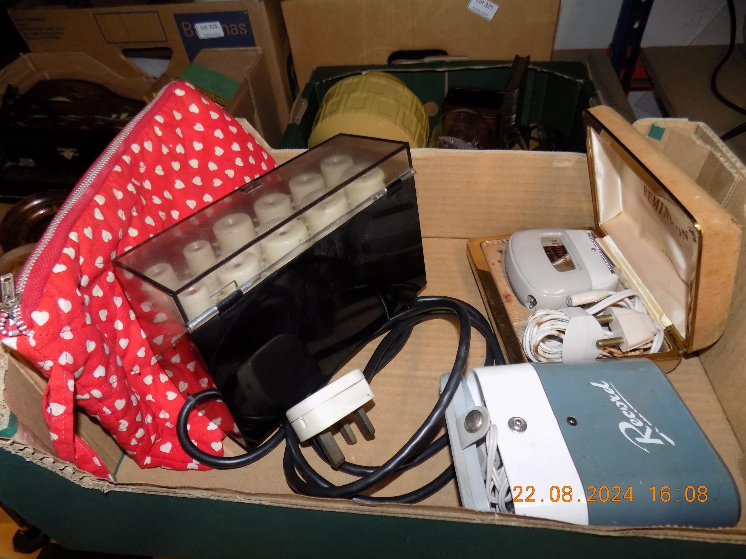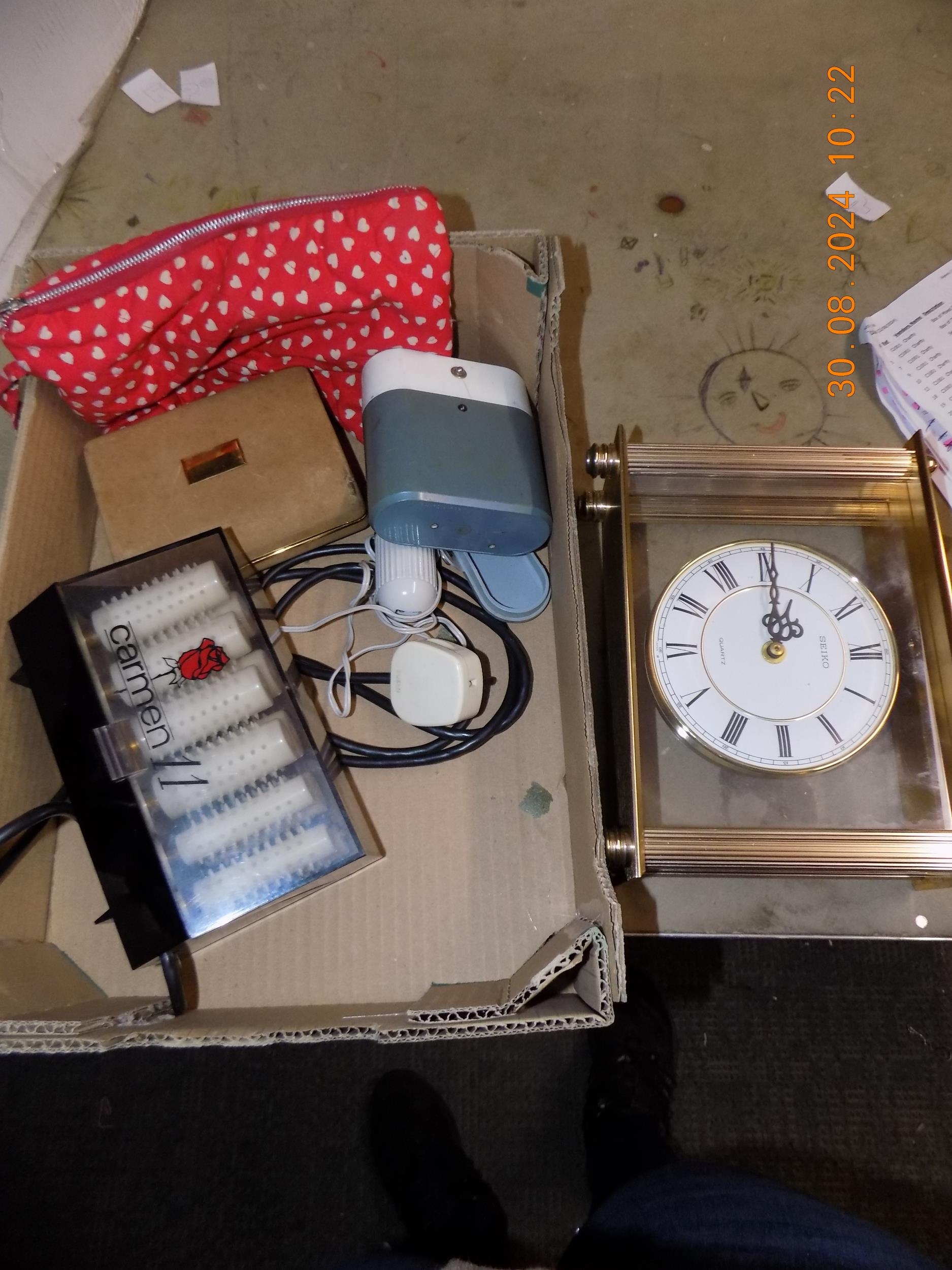 Box of Vintage Shavers and Mantle Clock w/o