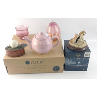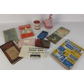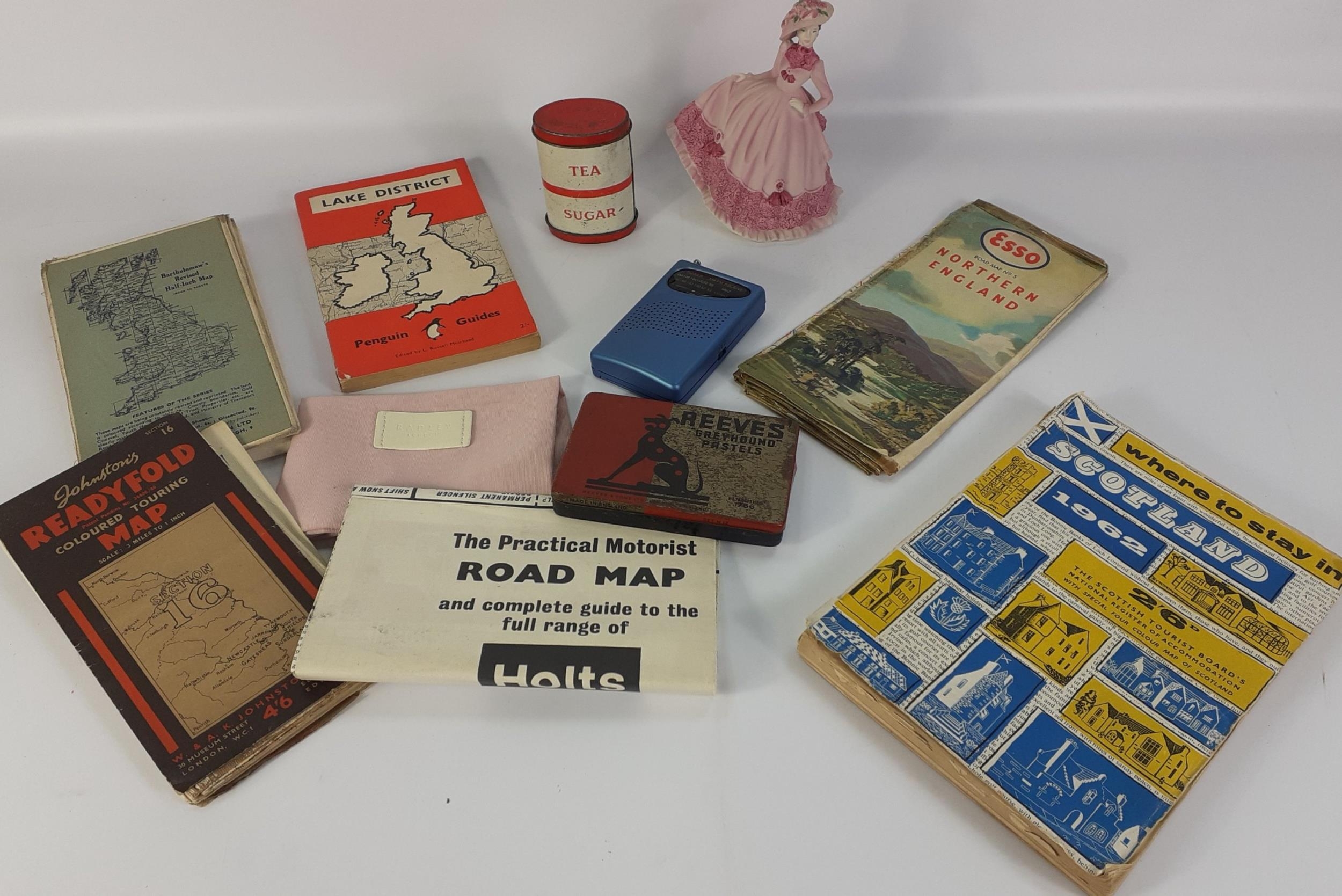 A small mixed lot to include a COALPORT Beau Monde Jill figurine (14cm high), vintage maps of Northern England, 'Where To Stay In Scotland 1962', a tin of Reeves greyhound pastels, a double-ended sugar/tea tin (8cm high), and a mini AM/FM radio