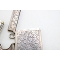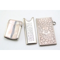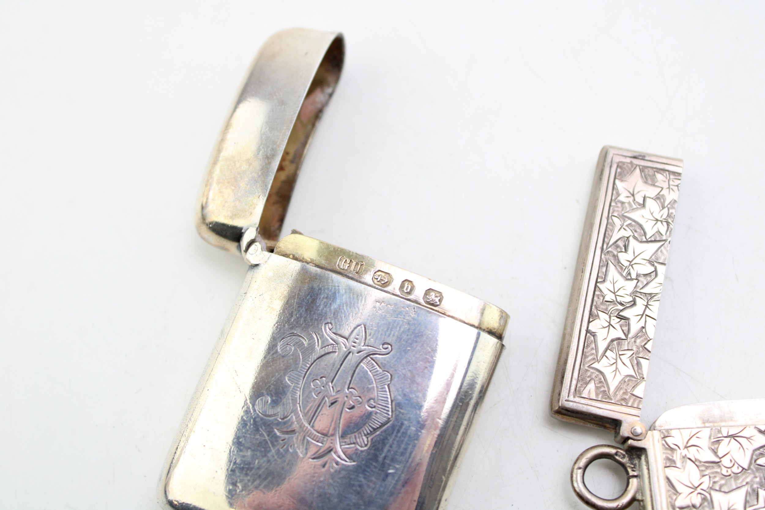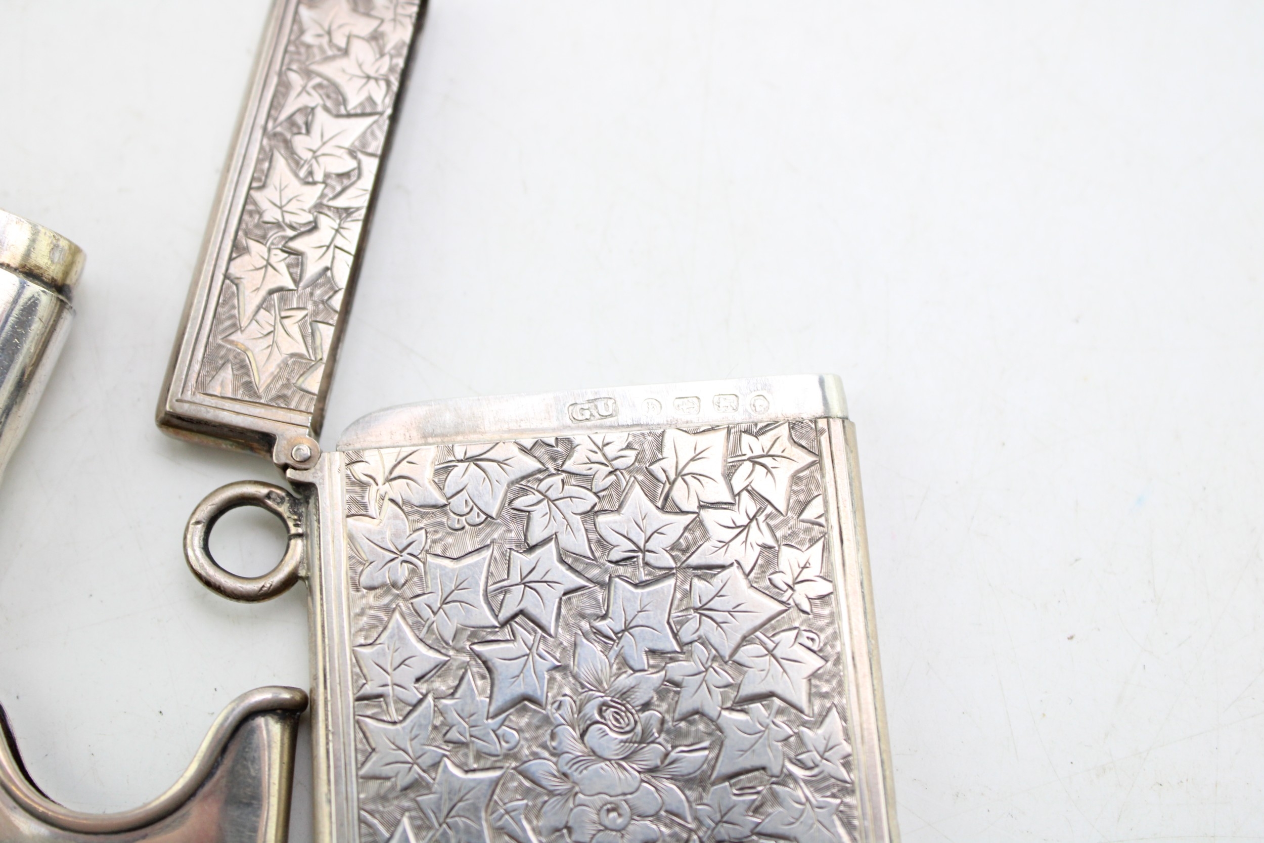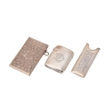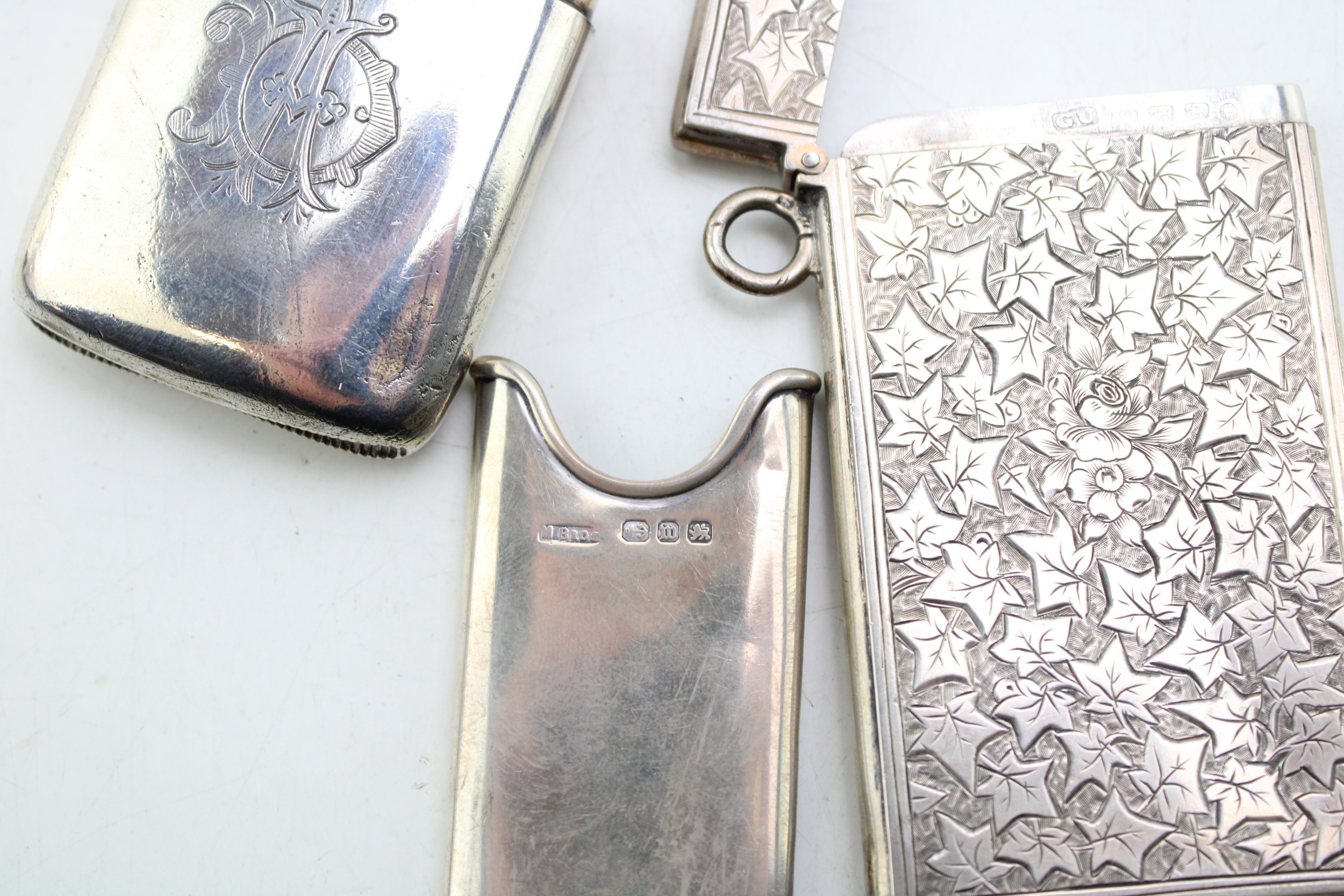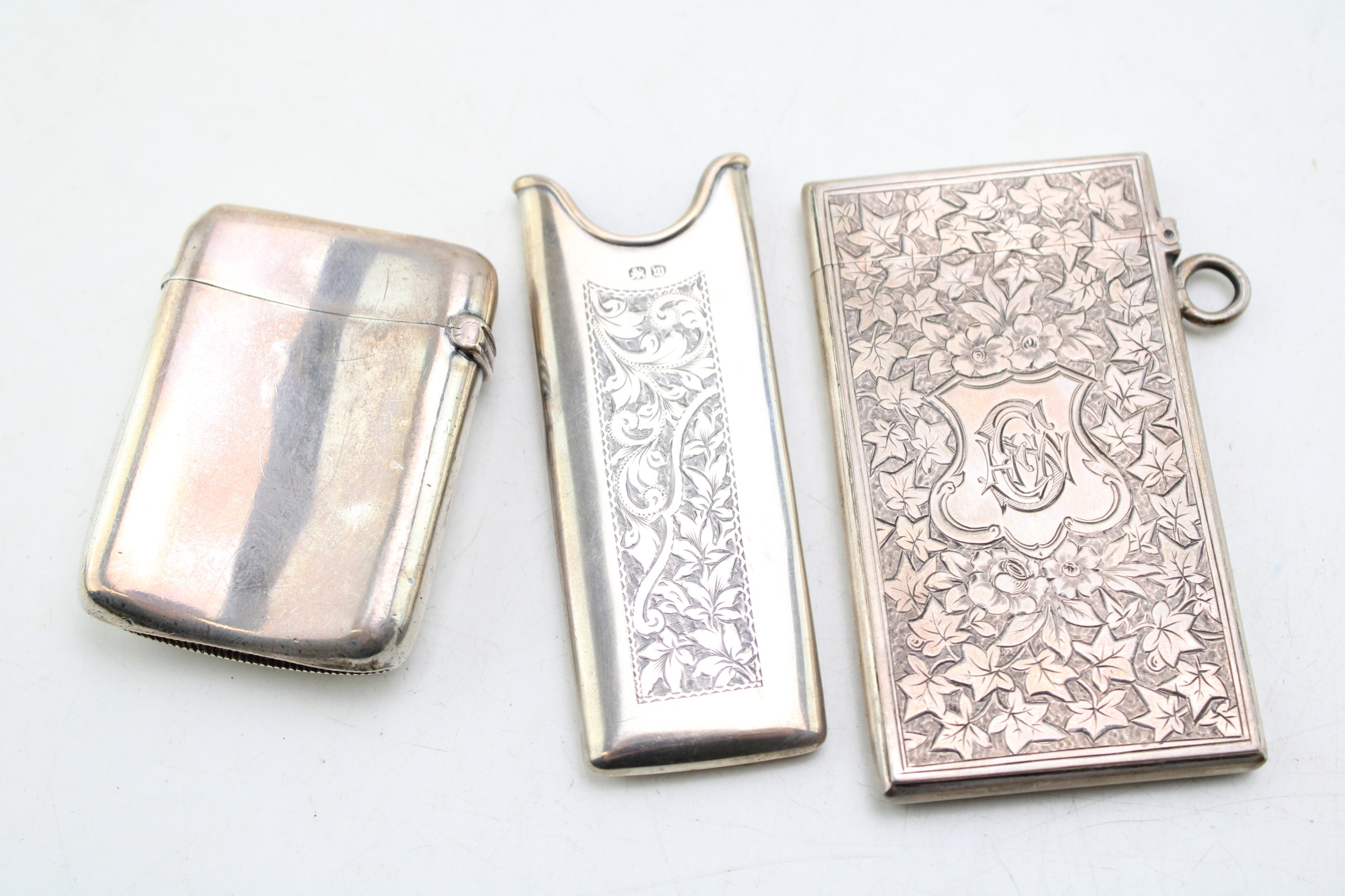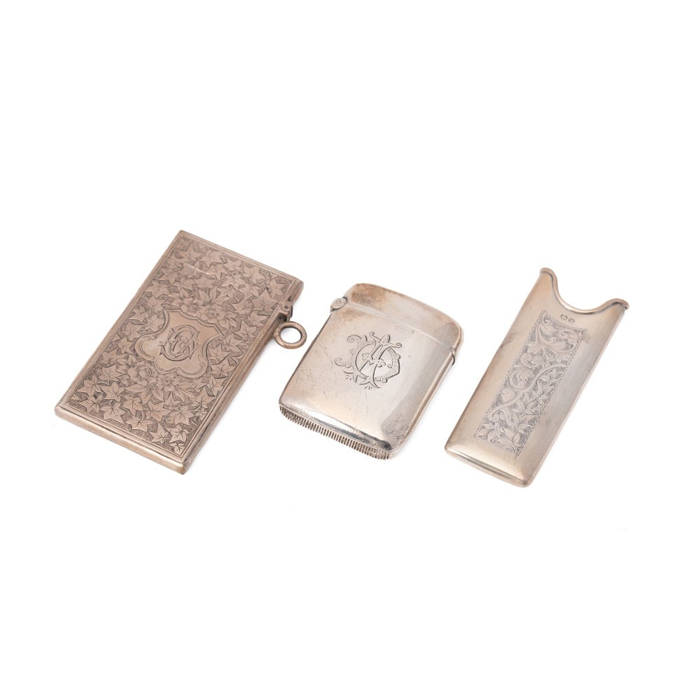 A Victorian silver card case of rectangular form, the whole engraved throughout with ivy leaves, with shield reserve, monogram engraved, Birmingham 1876, internal dimensions 40.7 by 75.5 by 3.7mm, a Victorian silver vesta case, of curved rectangular form, monogram engraved, Birmingham 1895, both pieces George Unite, and a Victorian silver comb holder, with acanthus scroll panel, Miller Bros, Birmingham 1896, total combined weight 91.7g, 2.95toz.