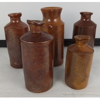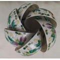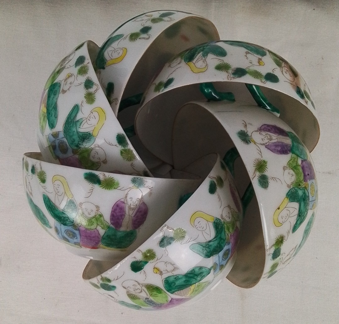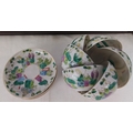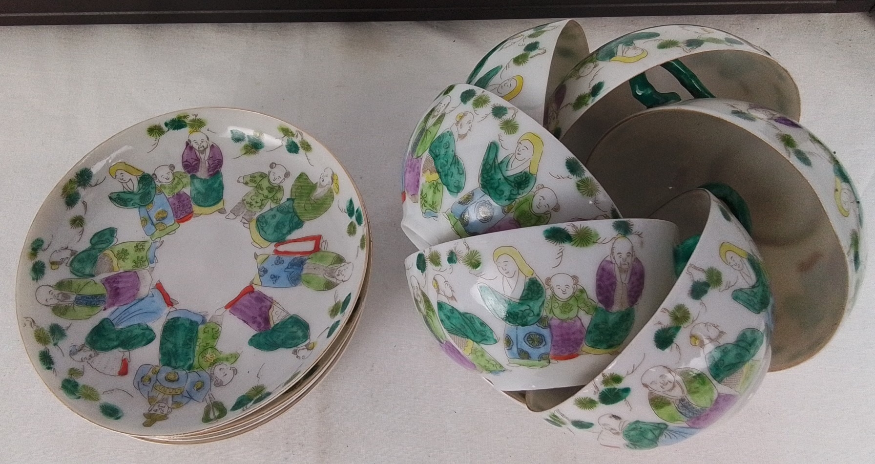 Set of 5 Chinese famille verte style porcelain tea bowls, each decorated with figures and iron-red details, with a set of 5 matching saucers; gilt rims throughout.