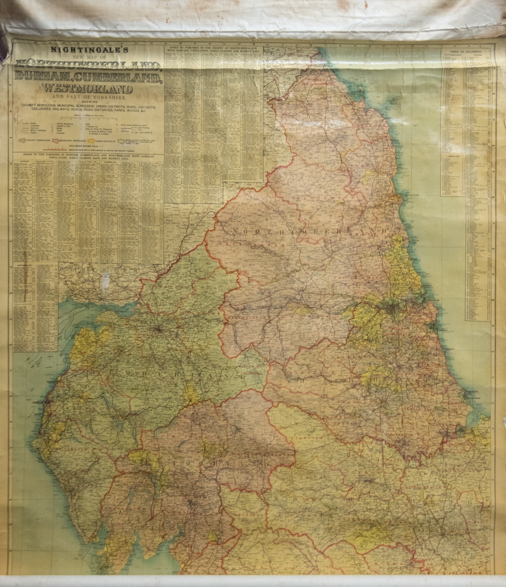 NIGHTINGALE'S NEW MAP OF NORTHUMBERLAND; DURHAM, CUMBERLAND AND WESTMORLAND and PART OF YORKSHIRE, scale 3 meter to the inch, printed on linen backed paper, 36" wide (89cm), rolled on a wooden pole with end finials