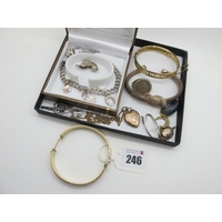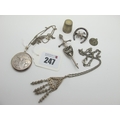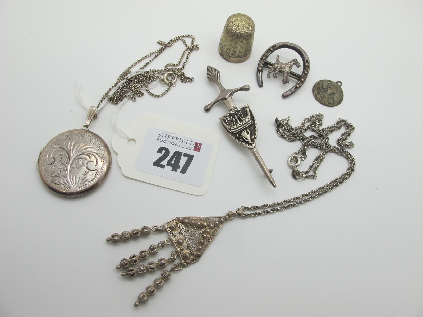 A Hallmarked Silver Circular Locket Pendant, a Scottish hallmarked silver sword brooch, a Dorcas thimble, filigree pendant, etc.