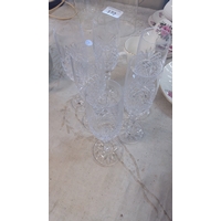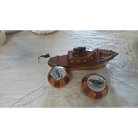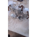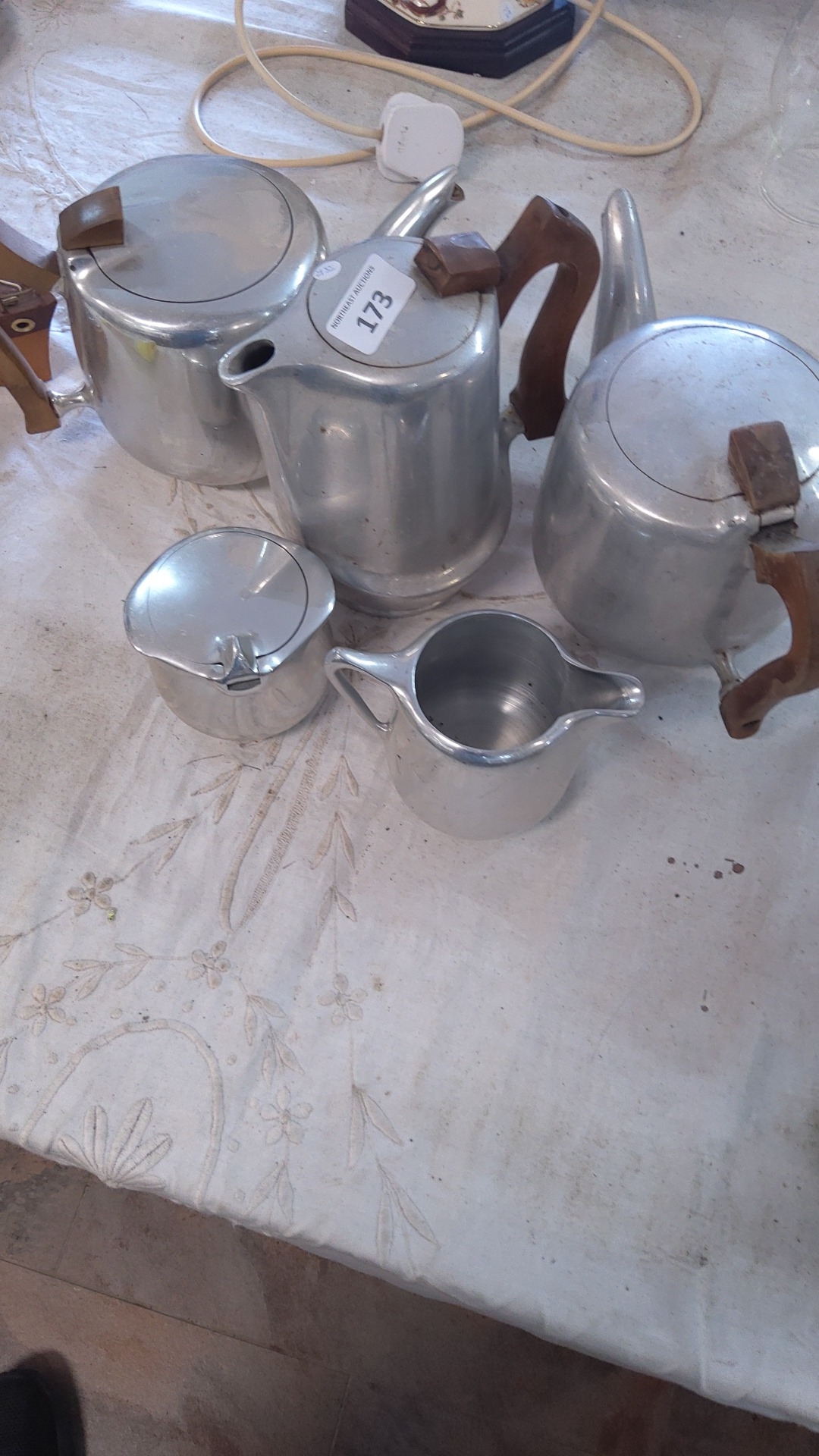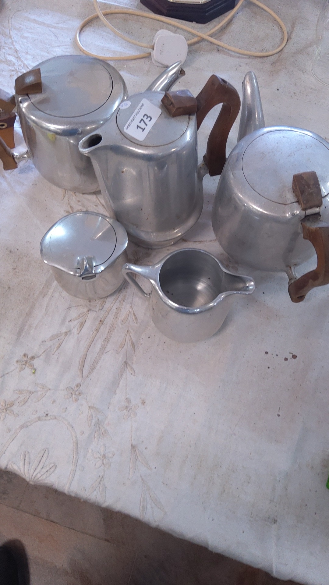 A group of mid-20th century aluminium tea wares comprising three lidded teapots with brown handles and finials, a lidded sugar bowl, and a milk jug, all of plain rounded form.