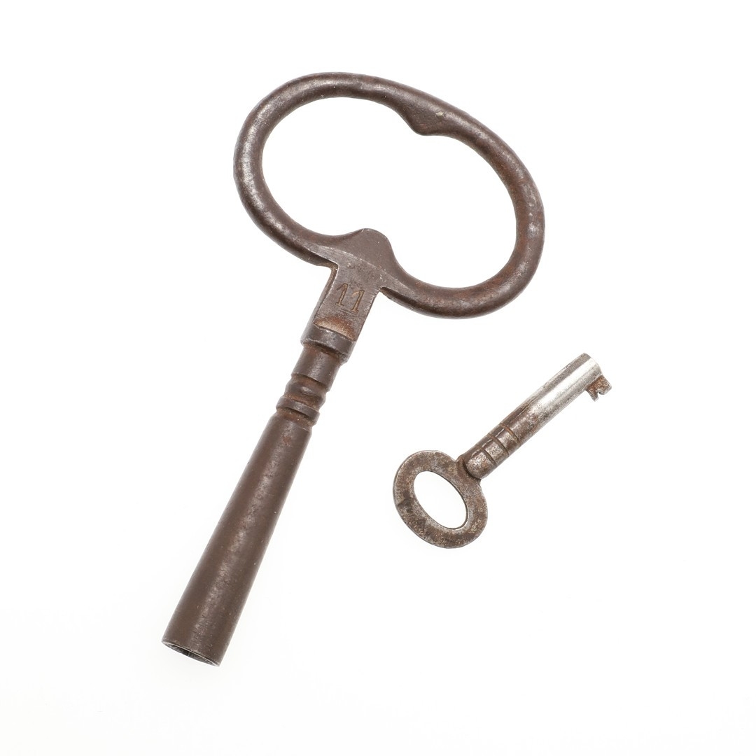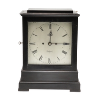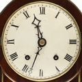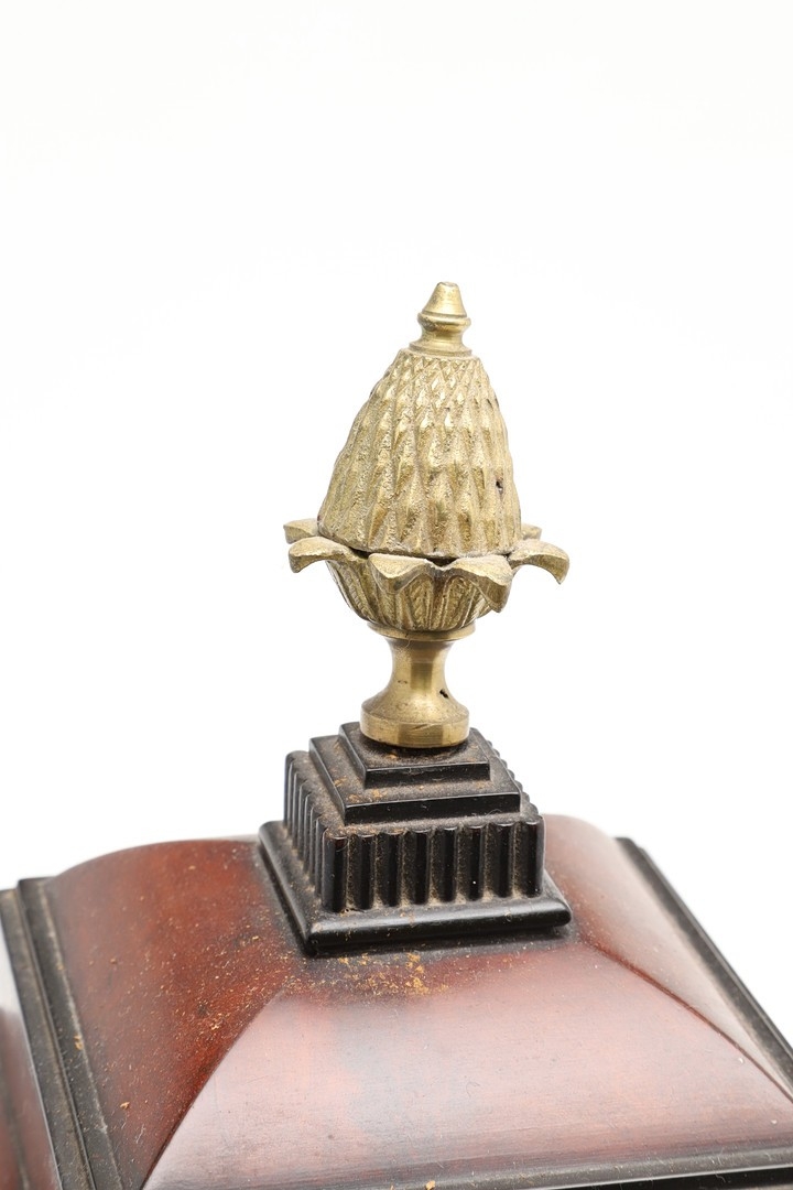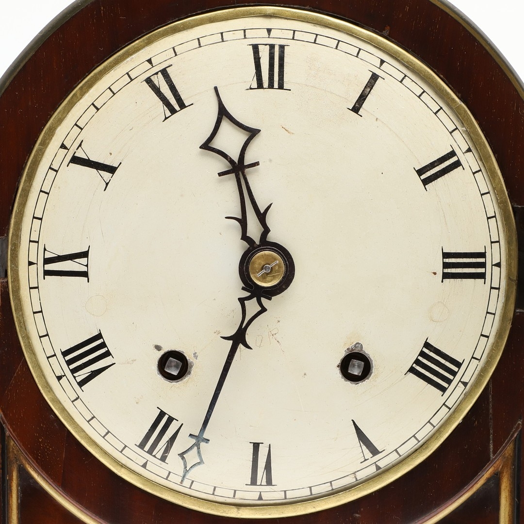 Finial bent, scratches to dial and minor chips to winding holes, repair to front of case, some cracking to veneer on front, crack to glass in back door. Currently fully wound, runs and strikes but functionality not guaranteed. Pendulum suspension spring secured with a pin.