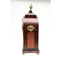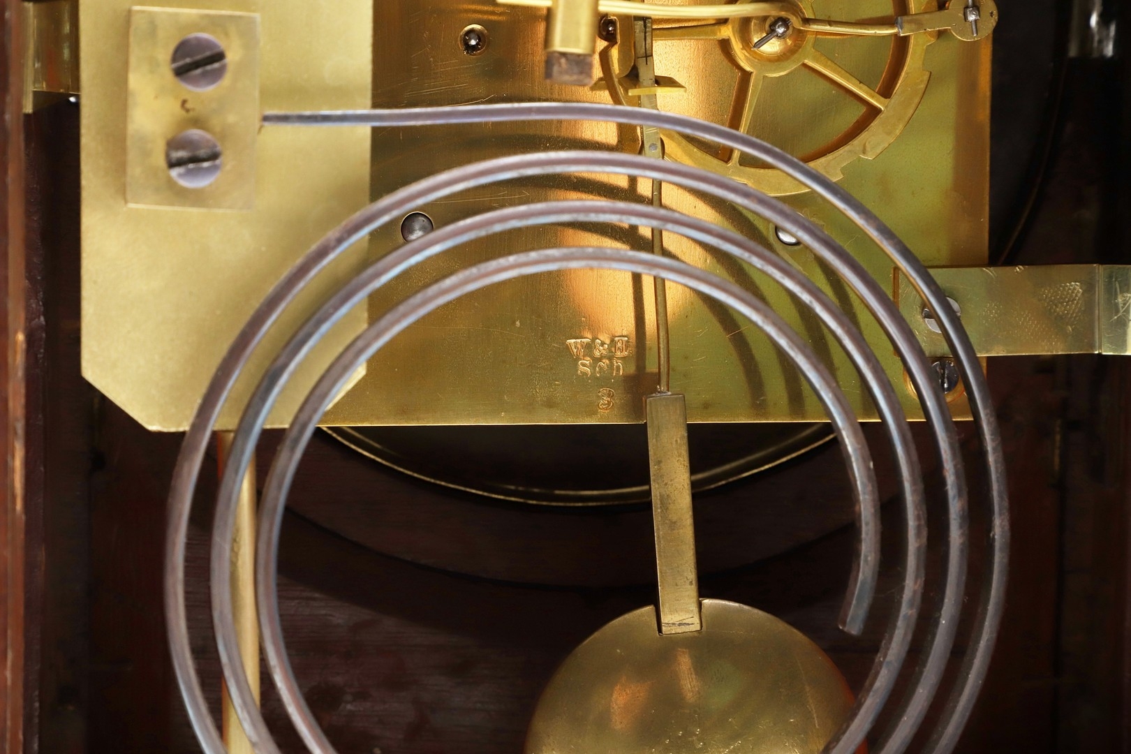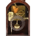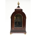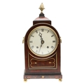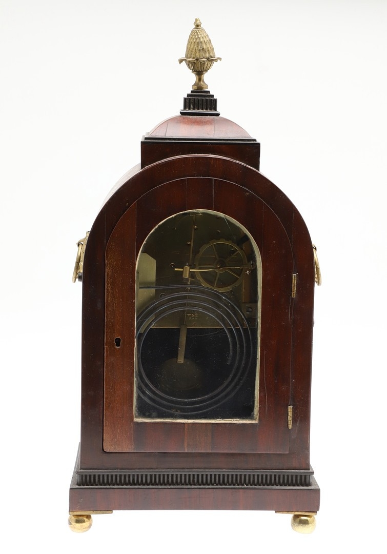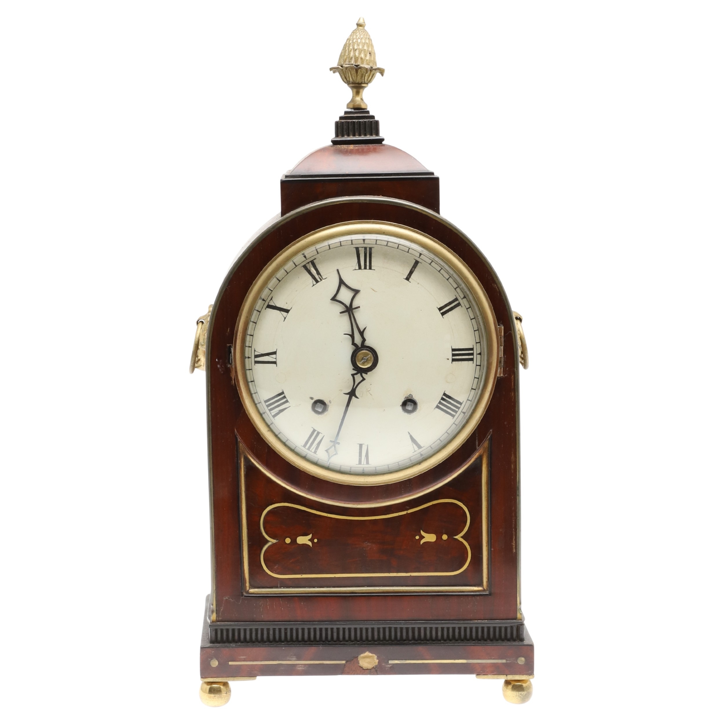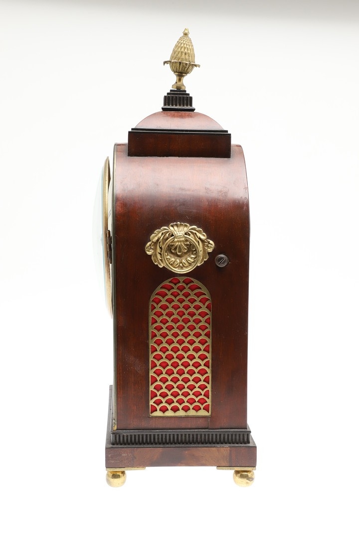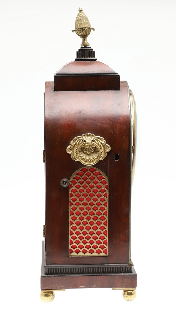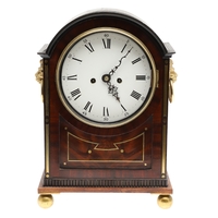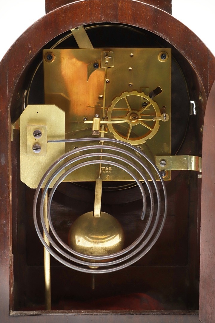 A LATE REGENCY BRASS INLAID MAHOGANY BRACKET CLOCK. the 6" painted dial with Roman numerals to a an eight day movement striking half hourly to a gong, the arched case with brass mounts, fishscale side grilles and ring handles, backplate stamped W & H SCH (Winterhalder & Hofmeier), pendulum and winder present, height 44cm, width 21cm, depth 15cm.