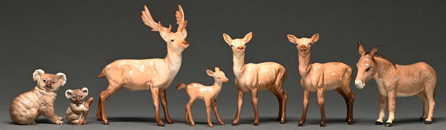 Seven Beswick models of animals, including deer and donkey, largest 19cm h, printed mark