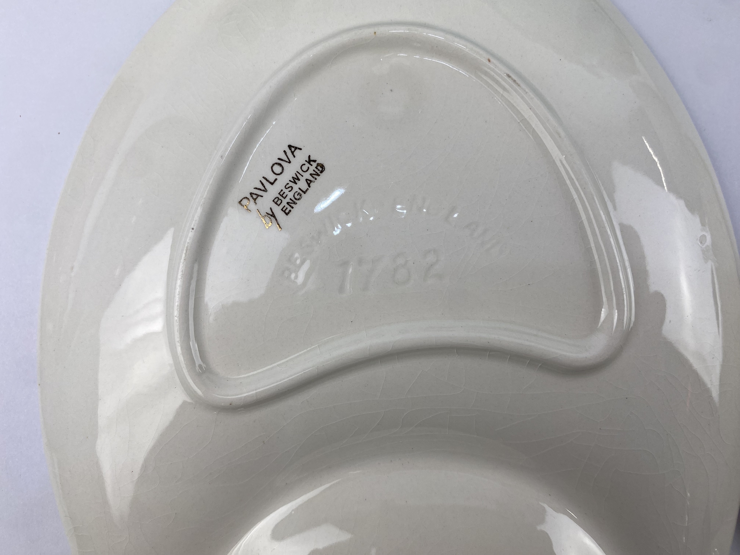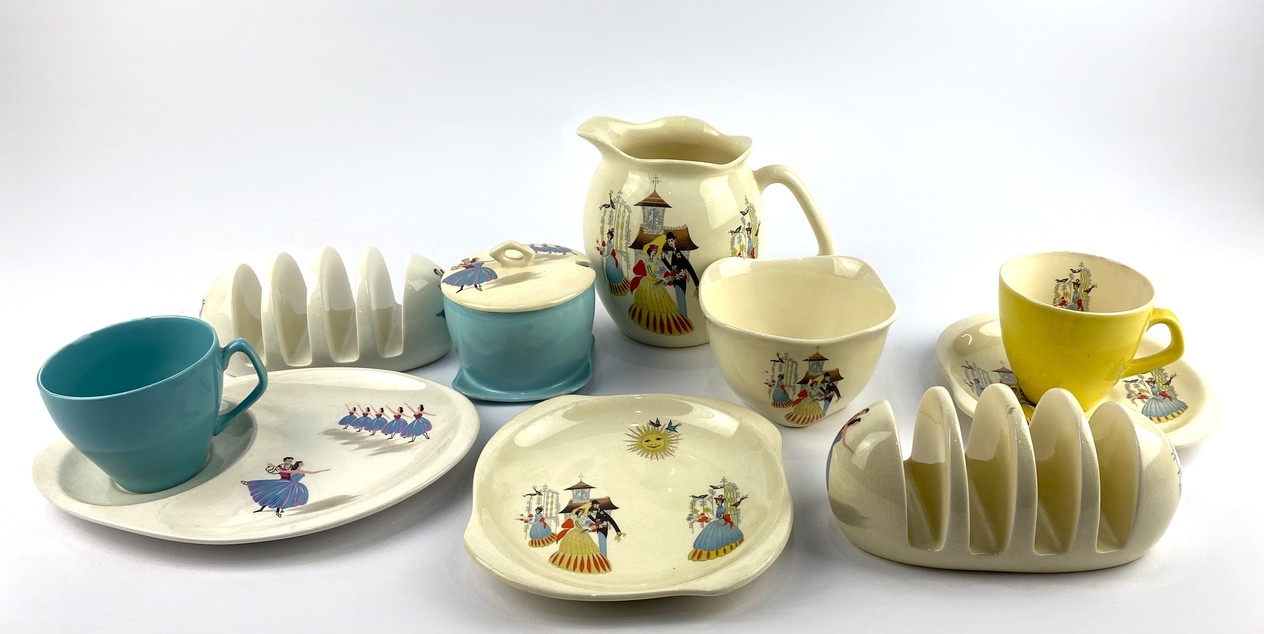 A collection of Beswick 'Happy Morn' tea ware comprising jug, sugar bowl, tea cup and saucer and small plate, together with a pair of Beswick 'Pavlova' ballet toast racks, condiment pot and cover, and teacup plate set
