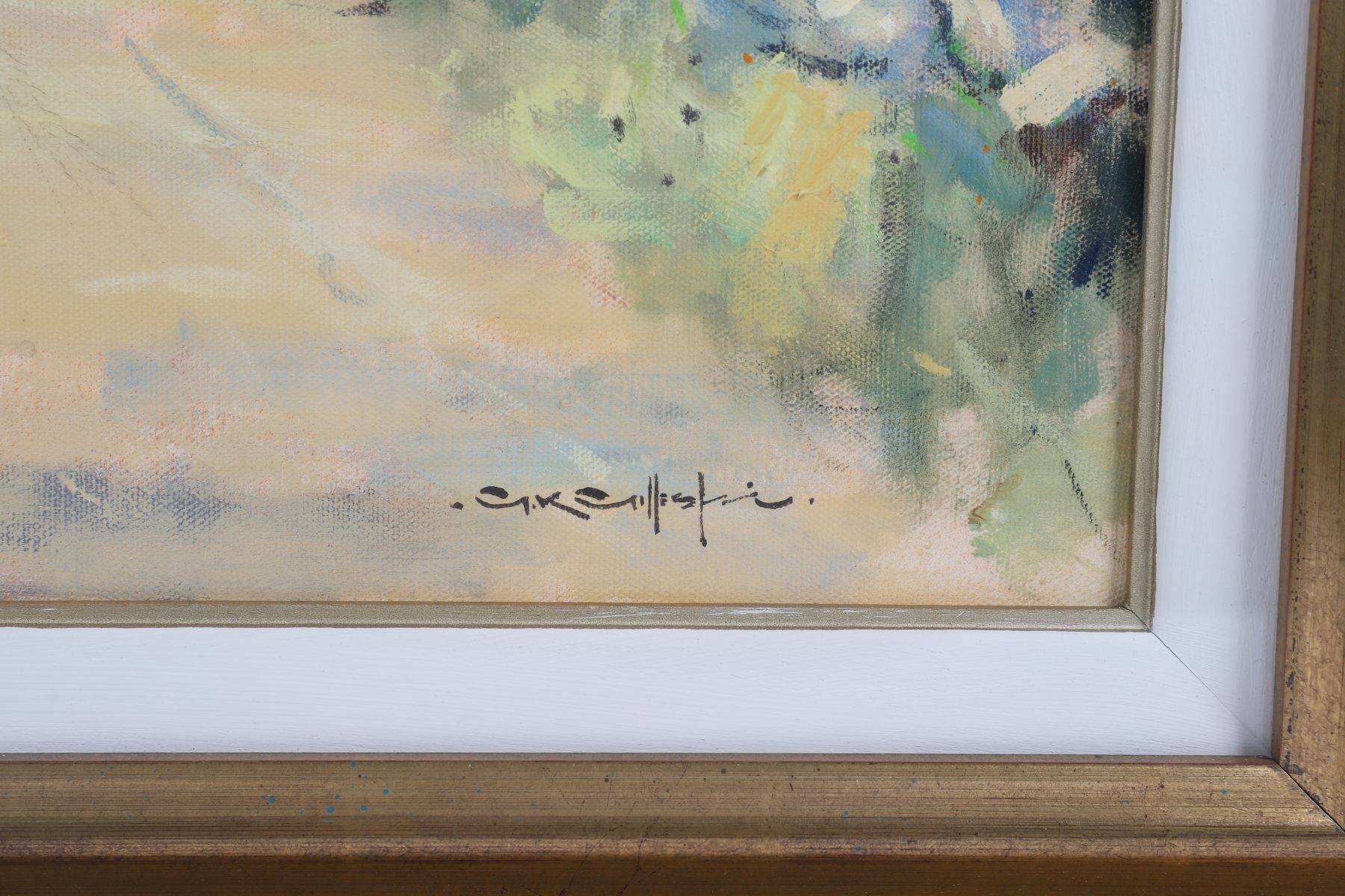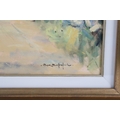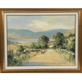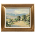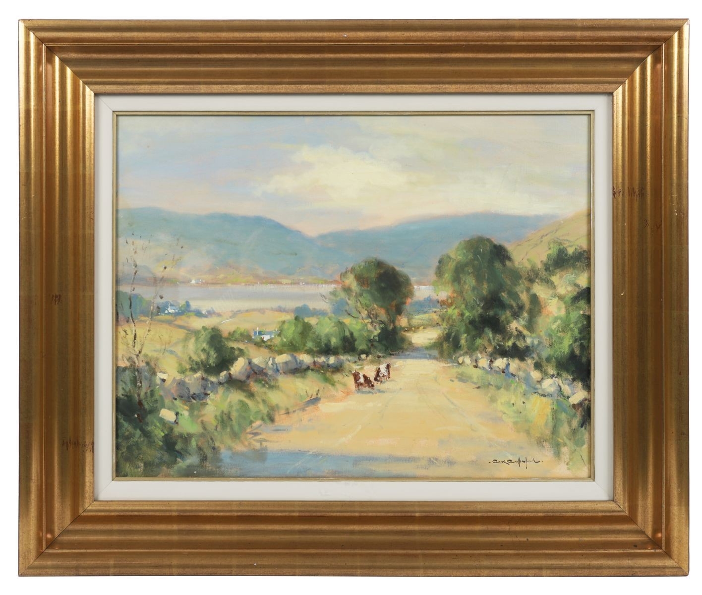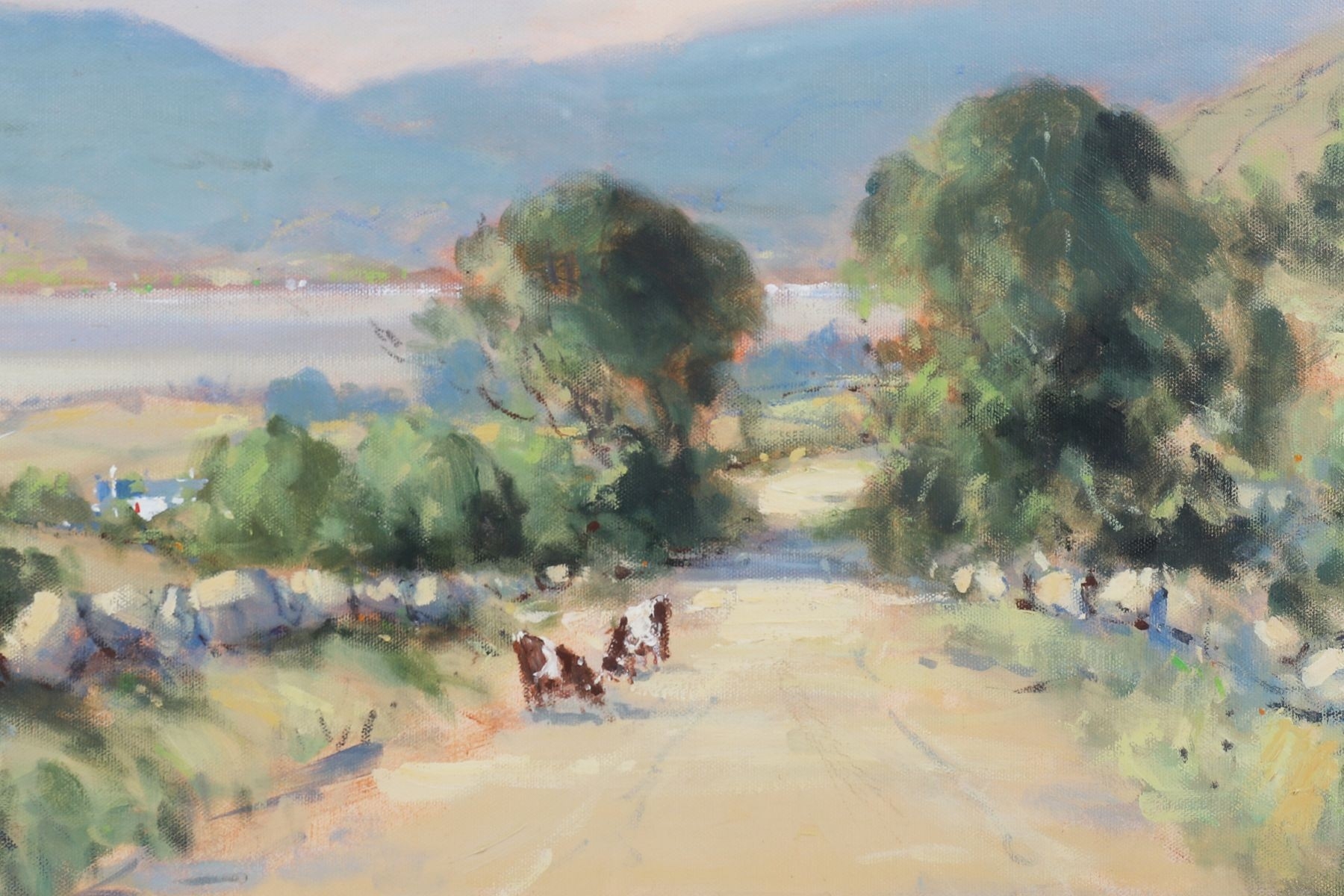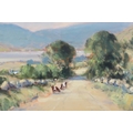 A richly painted rural landscape showing cattle and figures along a sunlit country road, framed by distant hills. Gillespie’s assured impressionist technique and sensitivity to light evoke the quiet charm of the Irish countryside. Image: 45.5 x 61cm