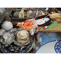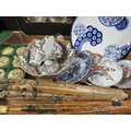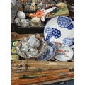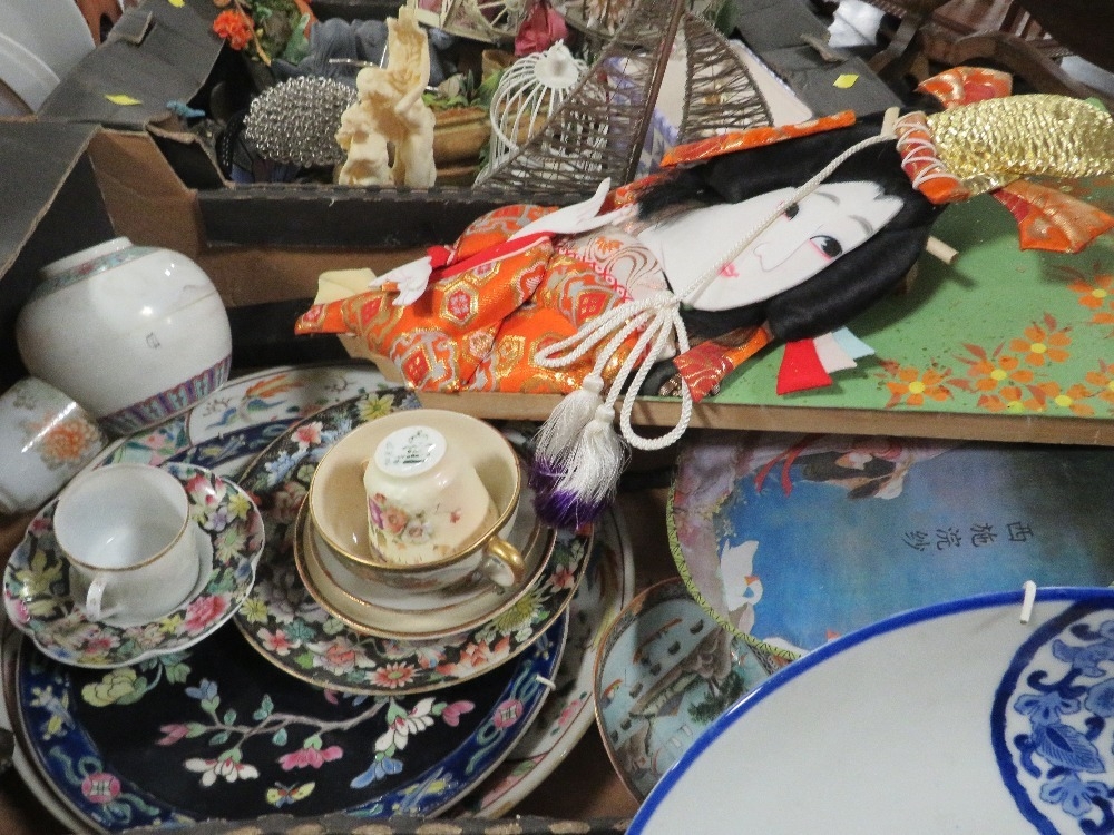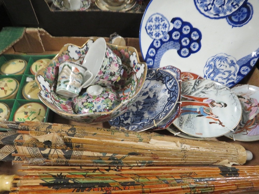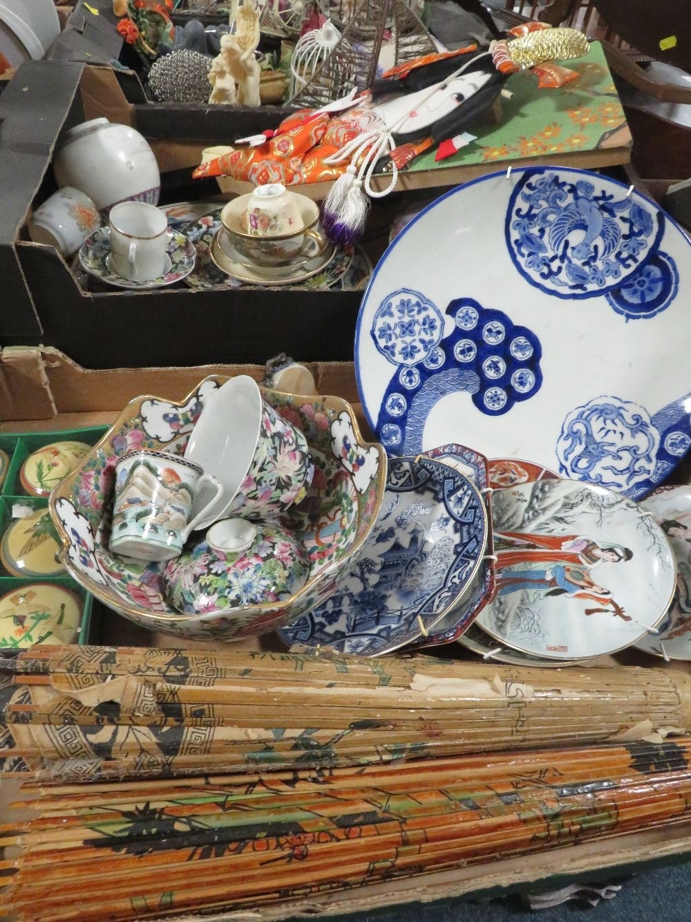 Two trays of Oriental style collectables etc to include a hand painted paddle fan