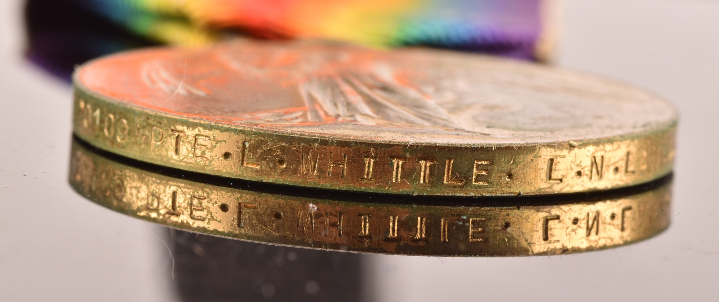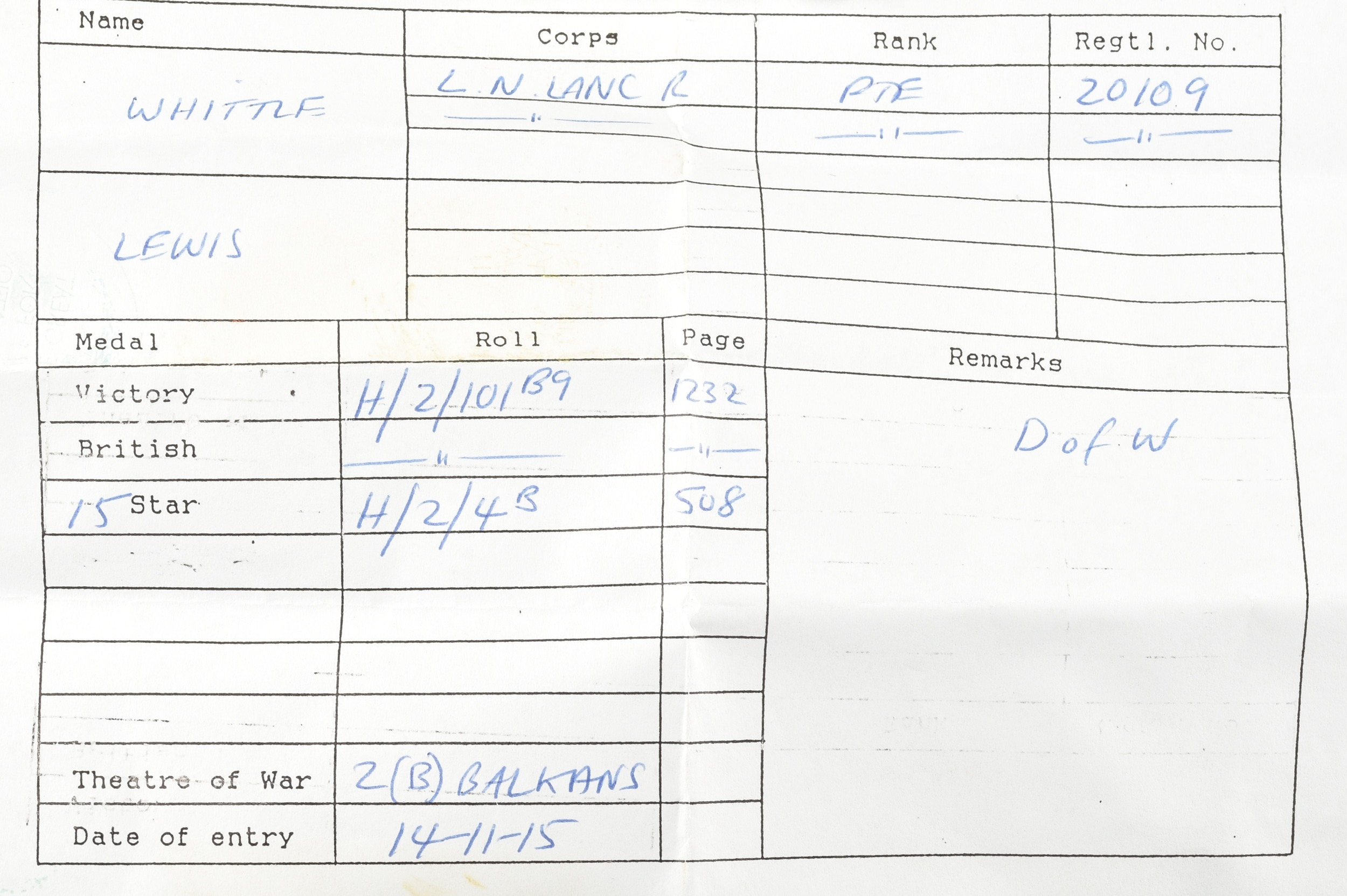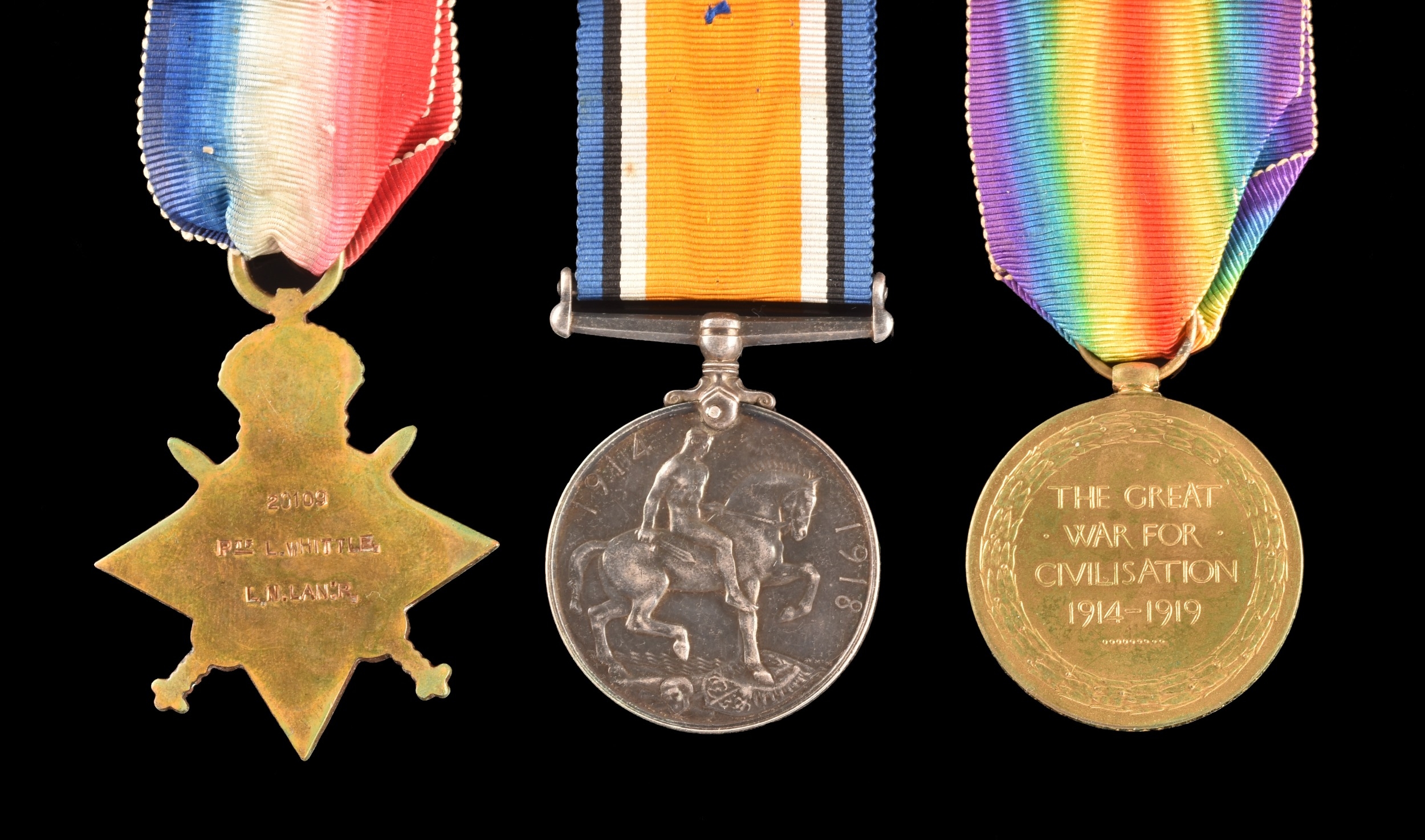 A Great War medal trio awarded to: 20109 Private. L. Whittle, Loyal North Lancashire Regiment. Comprising: a 1914-15 Star (20109 Pte. L. Whittle, L. N. Lan: R.); the British War Medal (20109 Pte. L. Whittle, L. N. Lan: R.); and the Victory Medal (20109 Pte. L. Whittle, L. N. Lan: R.), with medal card. Served in the Balkans, date of entry 14th November 1915, died of wounds.