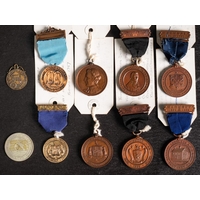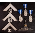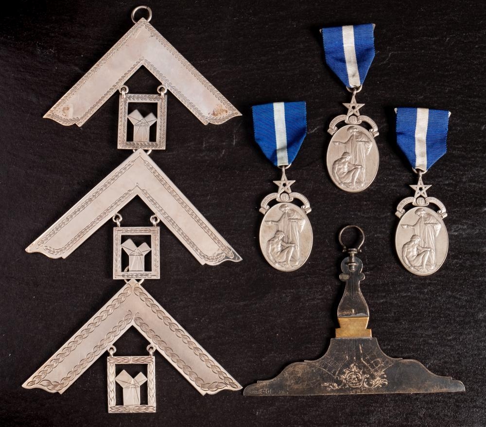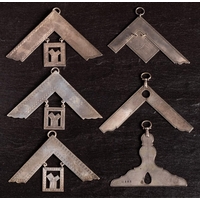 An Edwardian silver Masonic Senior member suspension, maker George Kenning & Sons, London, 1907: together with three Freemason's Hospital jewels , two silver Past Masters' jewels and a sterling silver Past Masters' jewel, various makers and dates