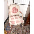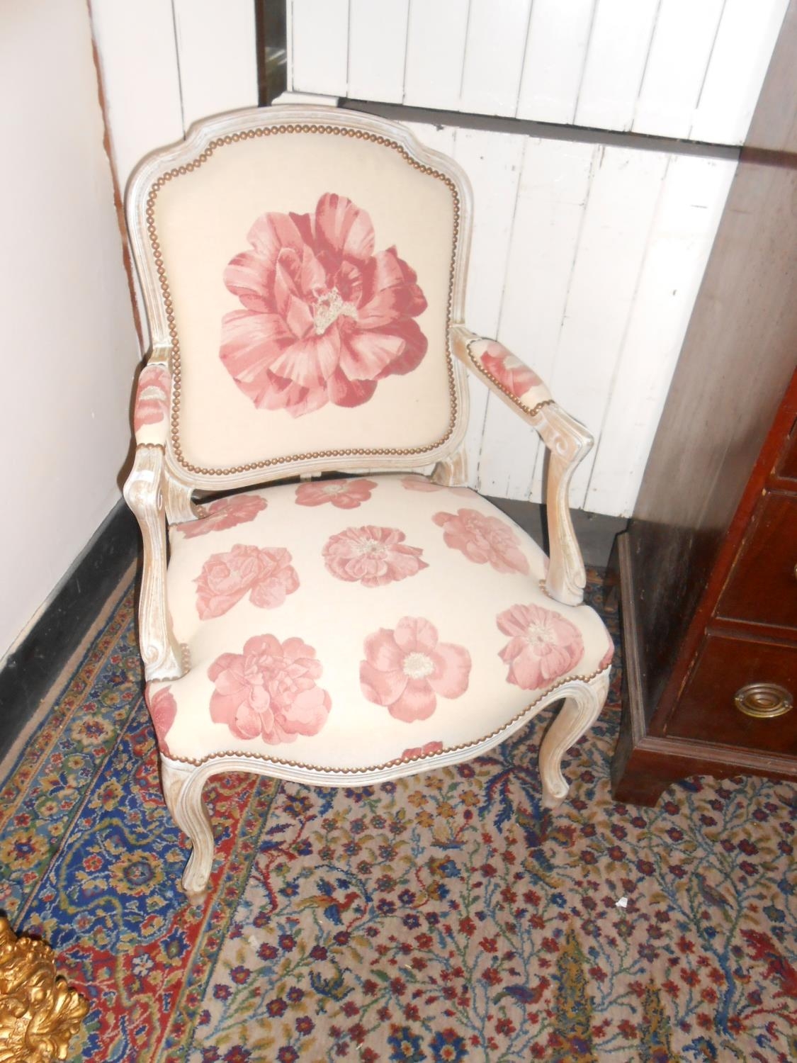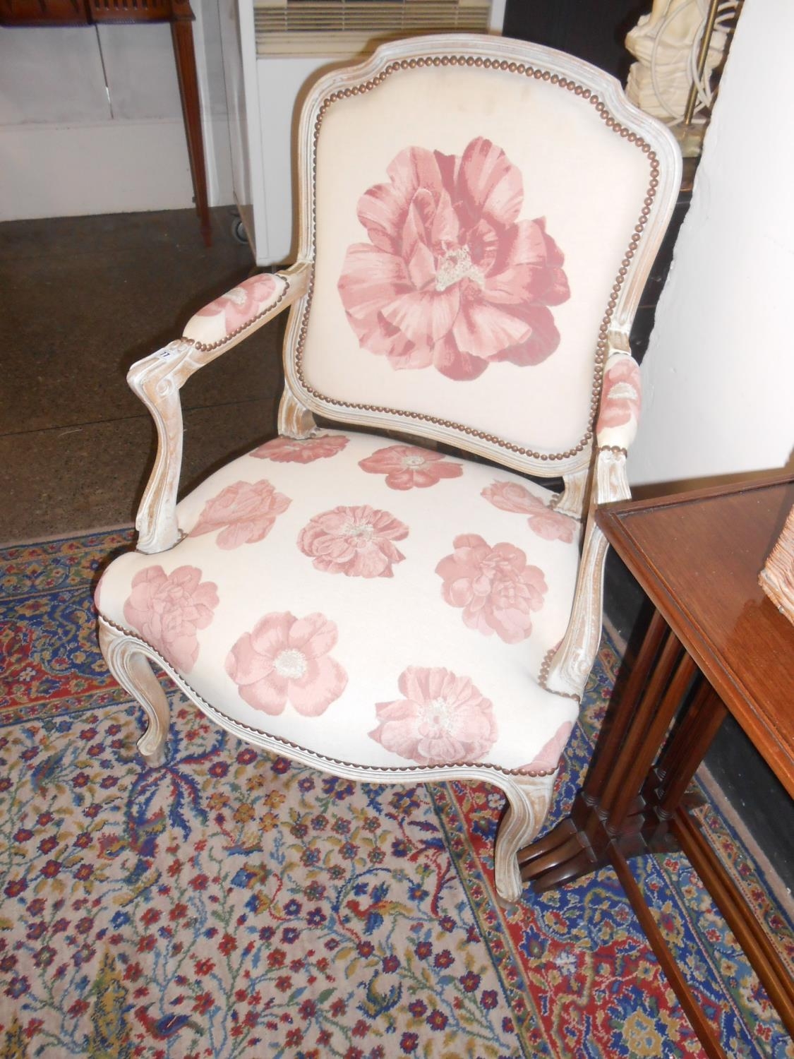 A pair of reproduction limed oak fauteuils upholstered in pink floral pattern material