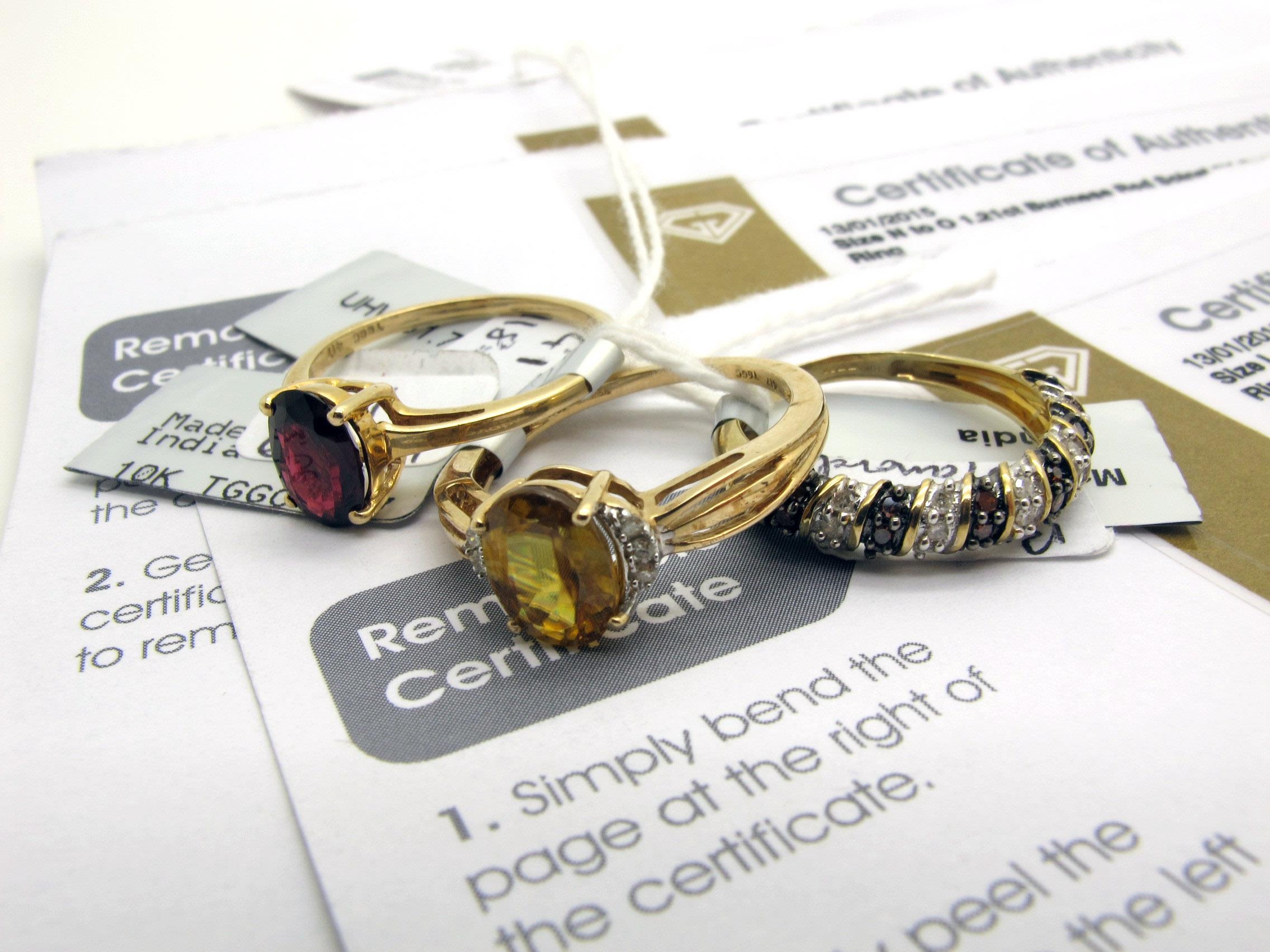 The Genuine Gemstone Company Ltd; A 9ct Gold 1.21ct Burmese Red Spinel Single Stone Ring, the oval stone claw set, between plain shoulders (finger size O), A 9ct Gold Morafeno Sphene and Diamond dress ring, oval claw set centre, between inset and trifurcated shoulders (finger size M), A 9ct Red and White Diamond ring, of alternate design (finger size M) (total weight 5 grams) (3).
