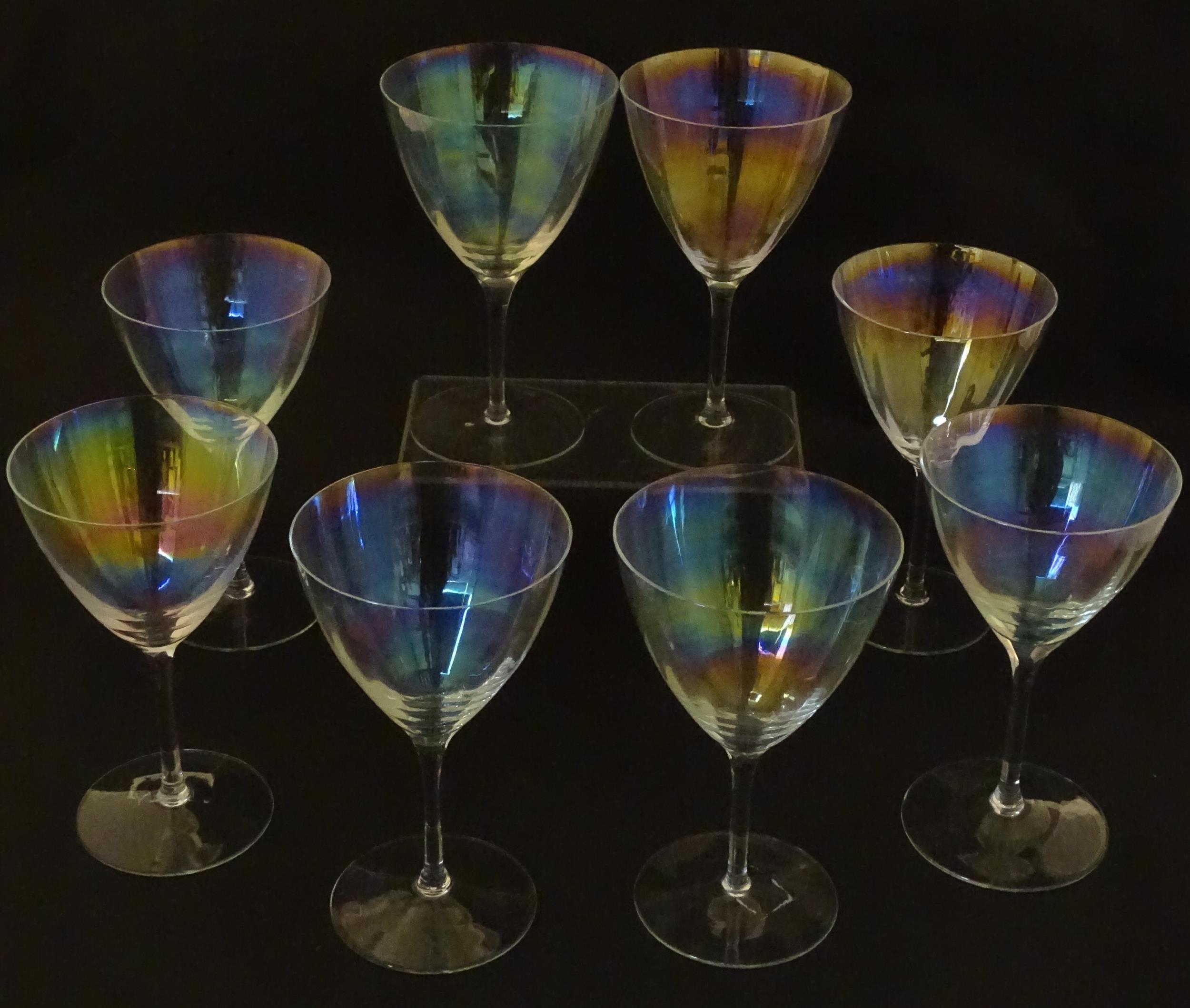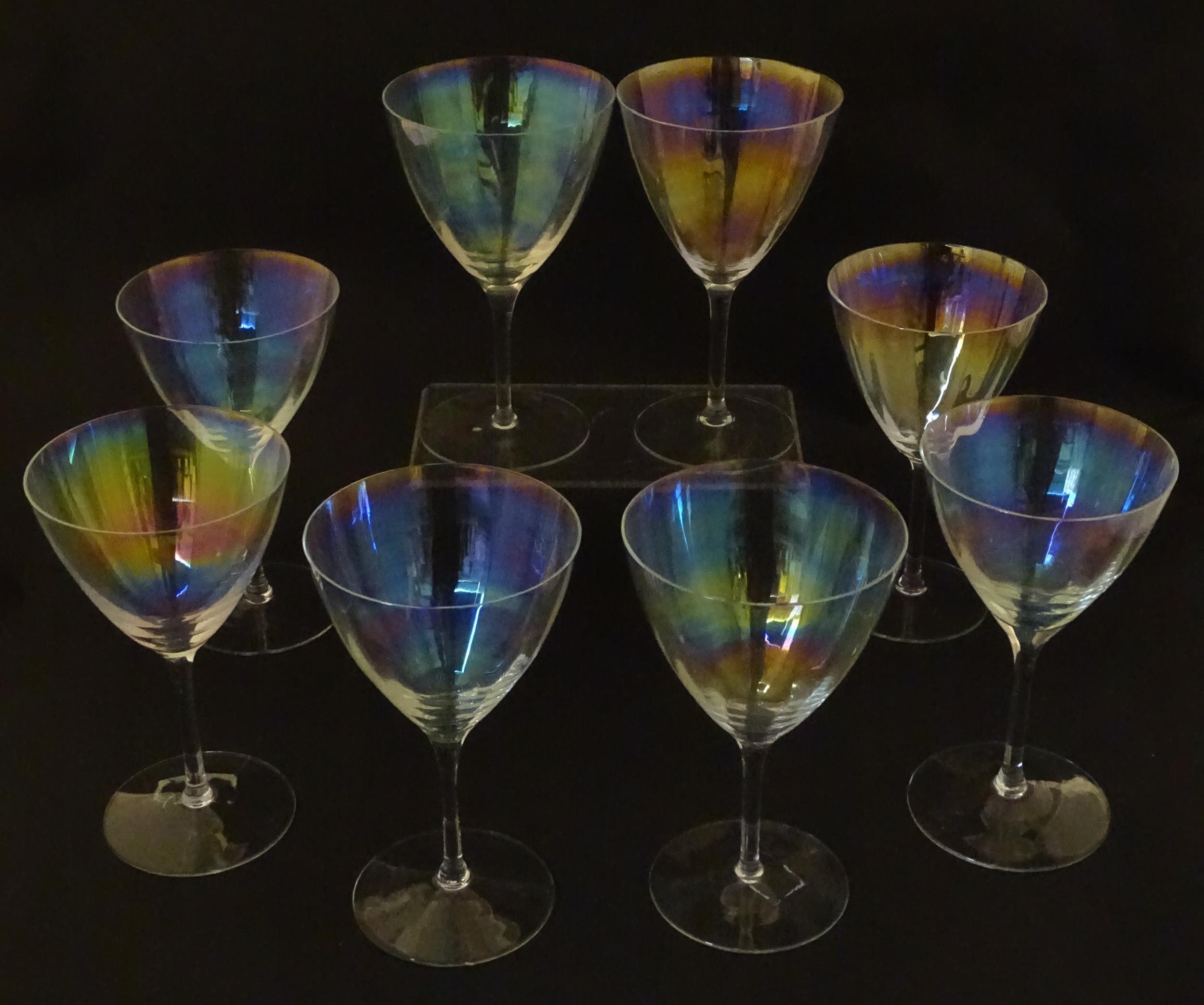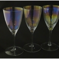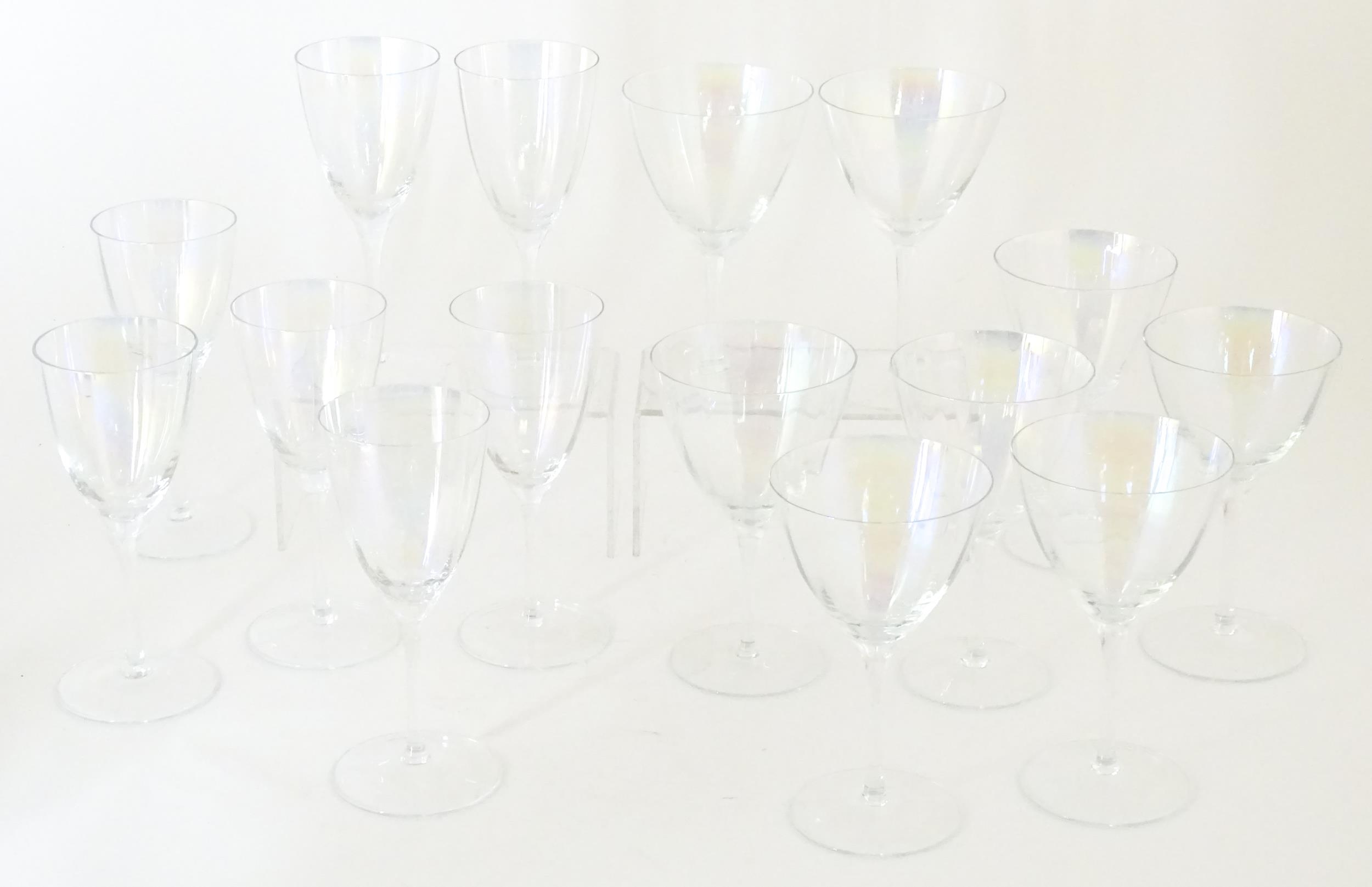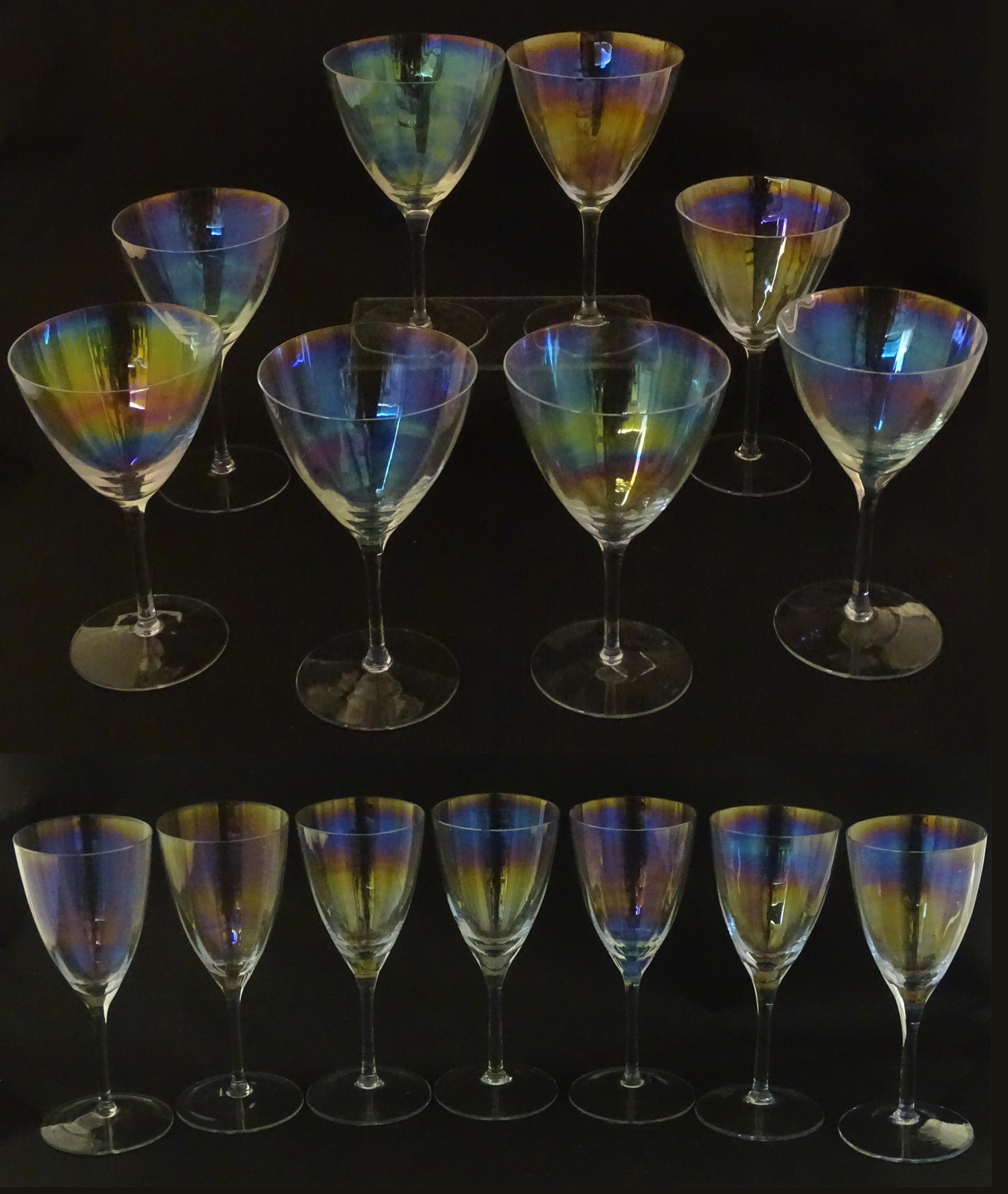 Fifteen iridescent glass wine glasses. Largest approx. 7" high (7+8)