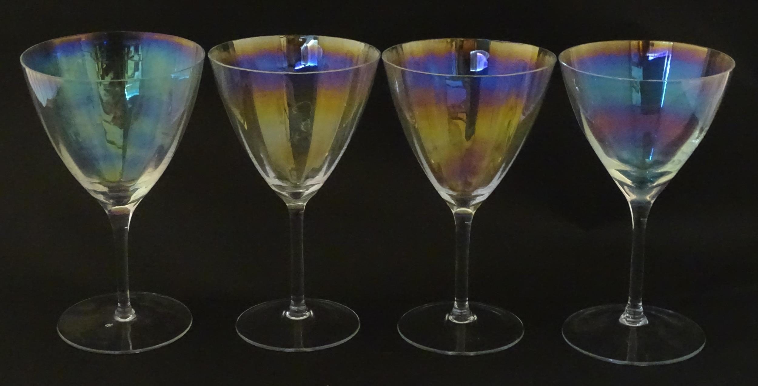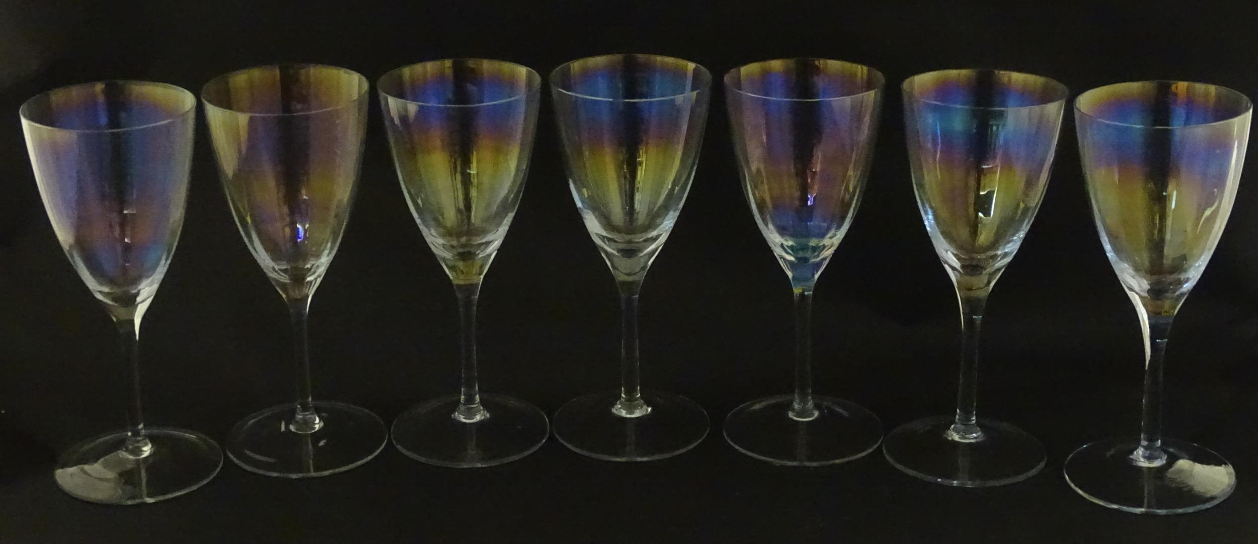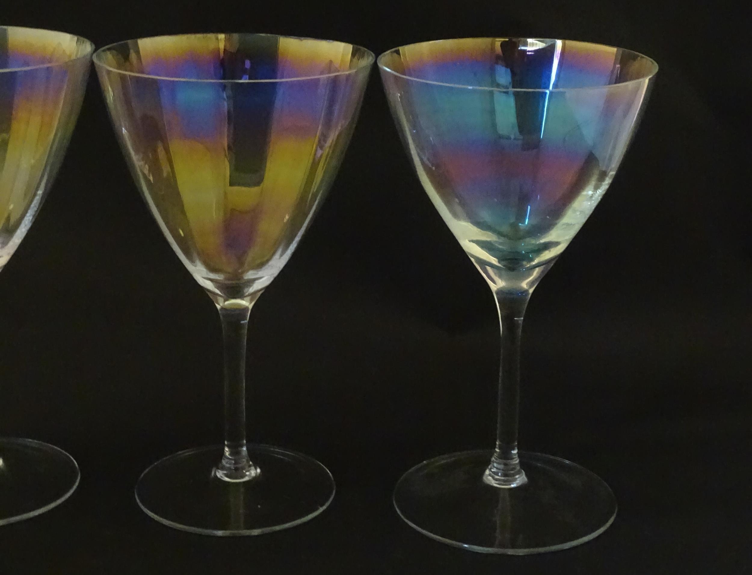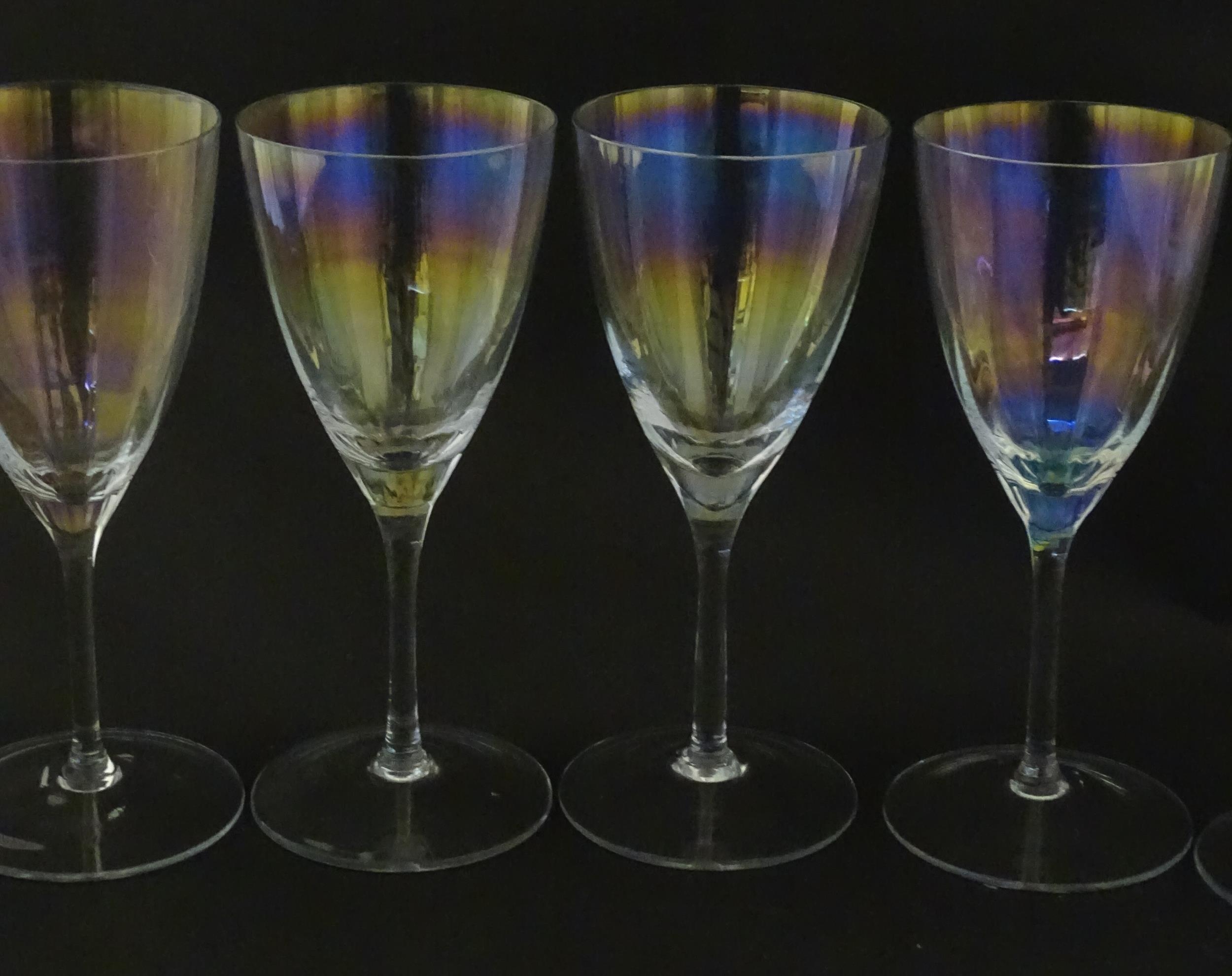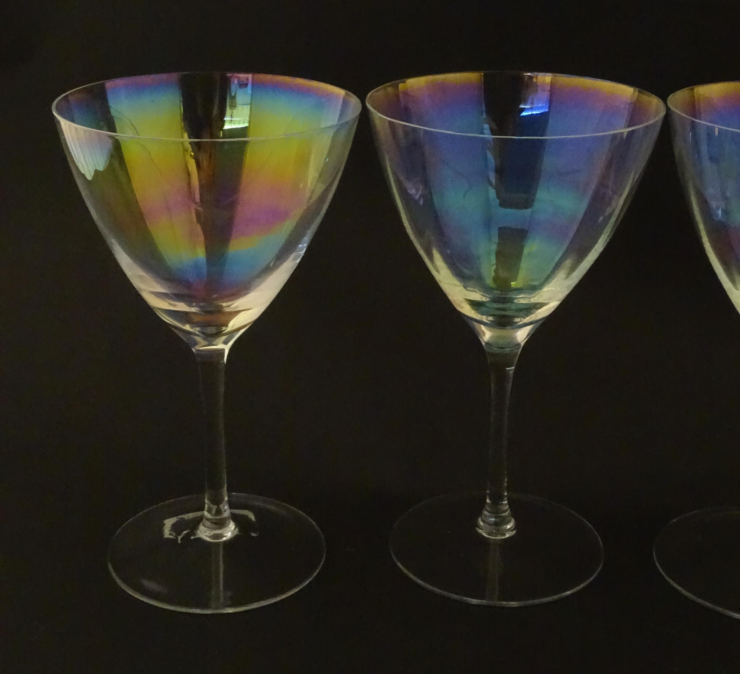 Fifteen iridescent glass wine glasses. Largest approx. 7" high (7+8)