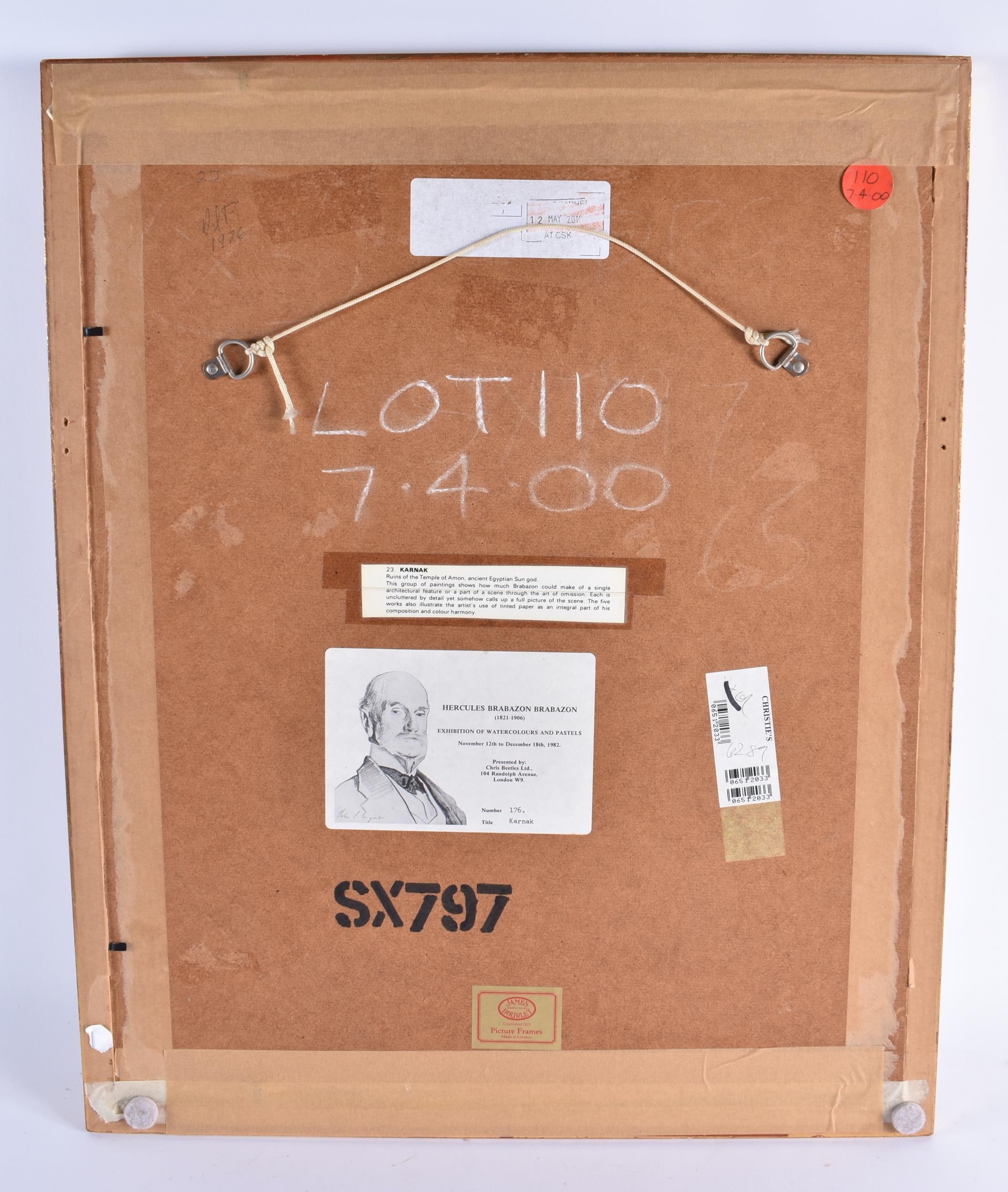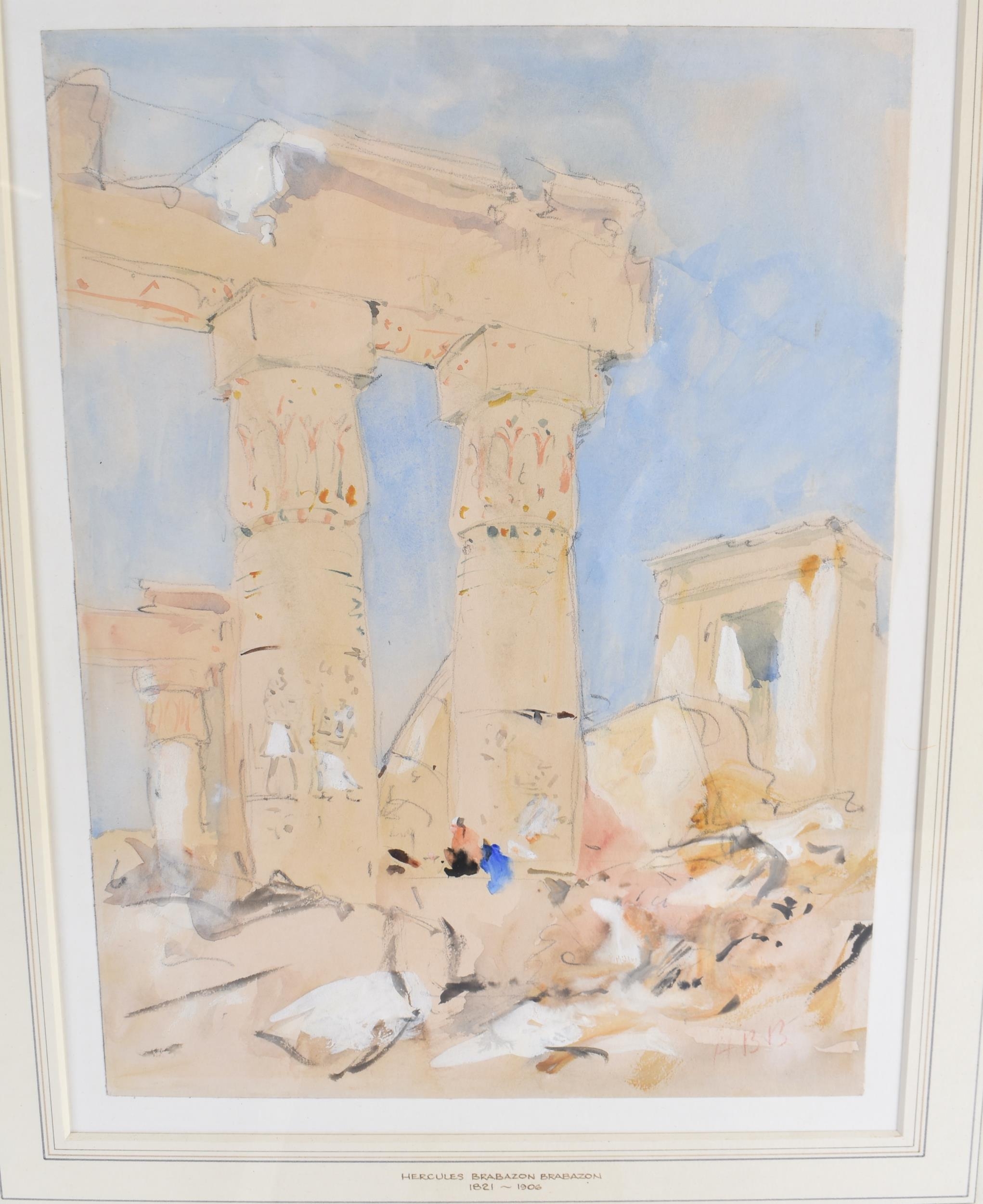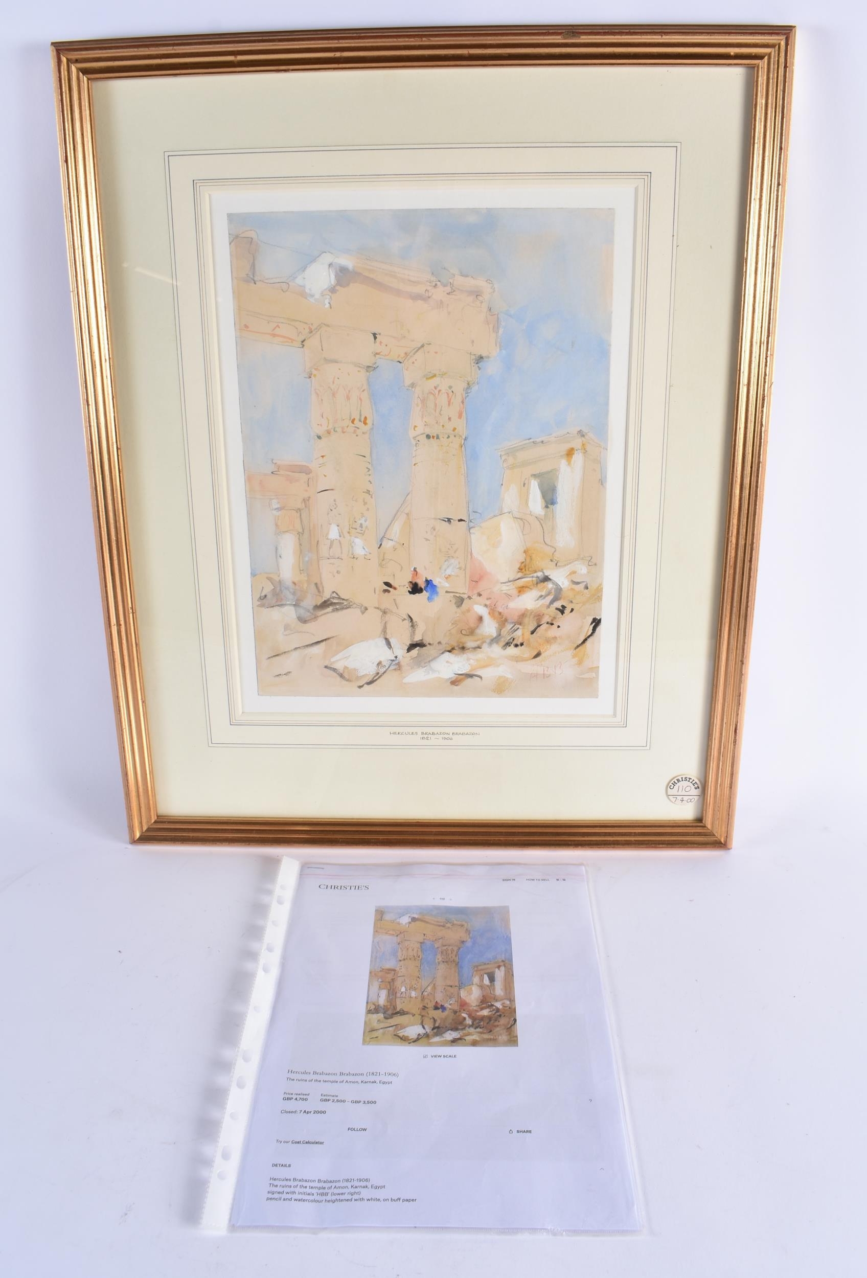 A FRAMED WATERCOLOUR BY HERCULES BRABAZON BRABAZON (1821-1906). Ruins of Temple of Amon, Karnak, Egypt. Signed with HBB initials bottom right. Size: 33.5cm x 24.7cm. Total size (framed and glazed): 57cm x 46cm. Old Christies and Chris Beetles labels to front and back. In excellent condition. PROVENANCE: sold by The Albany Gallery, London at Christies on 7th April 2000 for £4,700 Lot 100: (https://www.christies.com/lot/lot-1749780). Exhibited: London, Leighton House, Hercules Brabazon Brabazon, 1971, no. 31. Hastings, Hastings Museum and Art Gallery, The Wide World of Hercules Brabazon Brabazon: A Retrospective Exhibition of his Art, 17 July-12 September, 1976, no. 23//London, Campbell and Franks, Hercules Brabazon Brabazon: A Retrospective of his Art, 1976, no. 61.//London, Chris Beetles, Hercules Brabazon Brabazon (1821-1906): Exhibition of Watercolours and Pastels, 12 November-18 December 1982, no. 176.