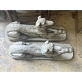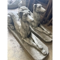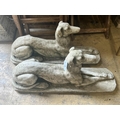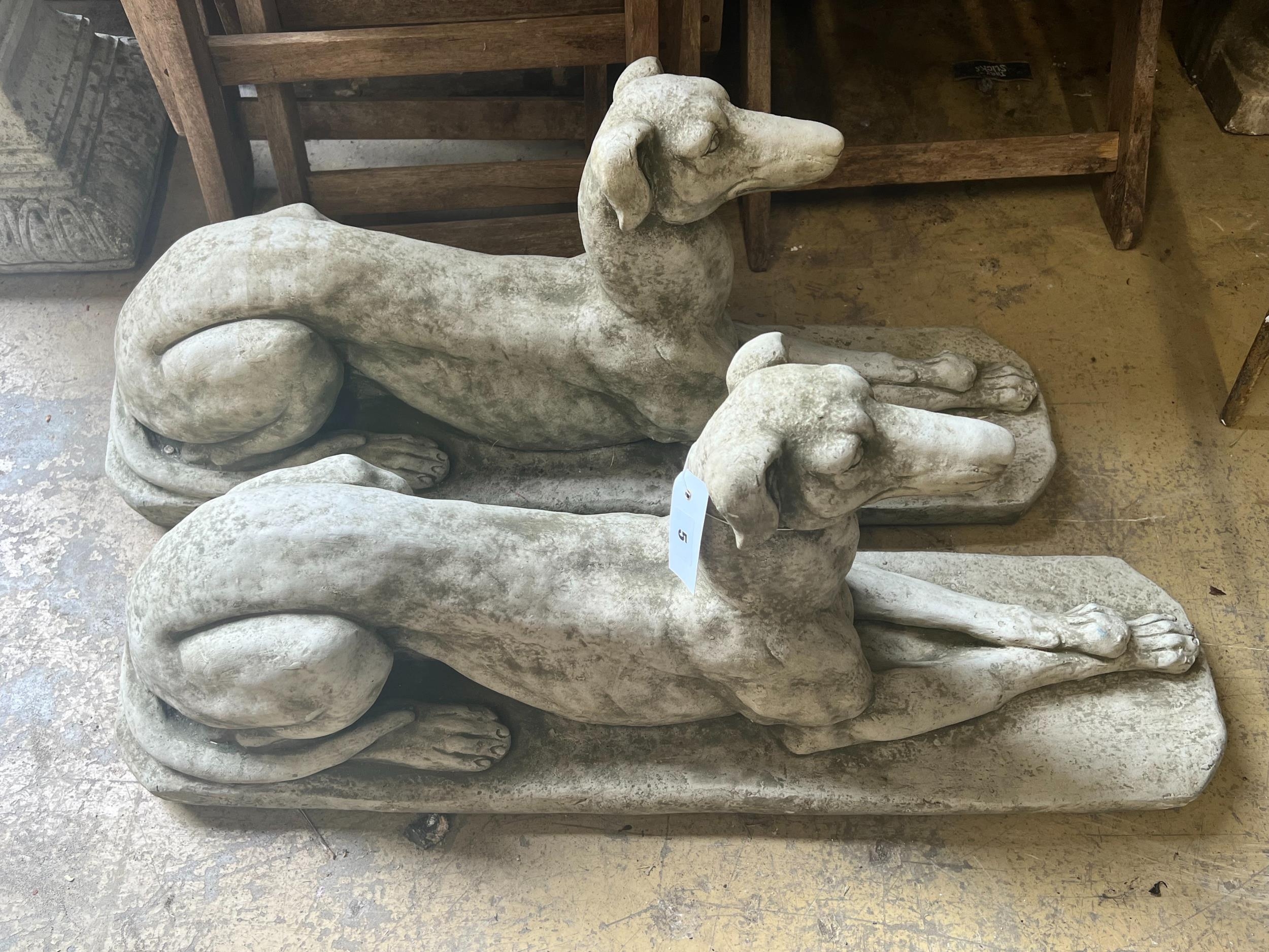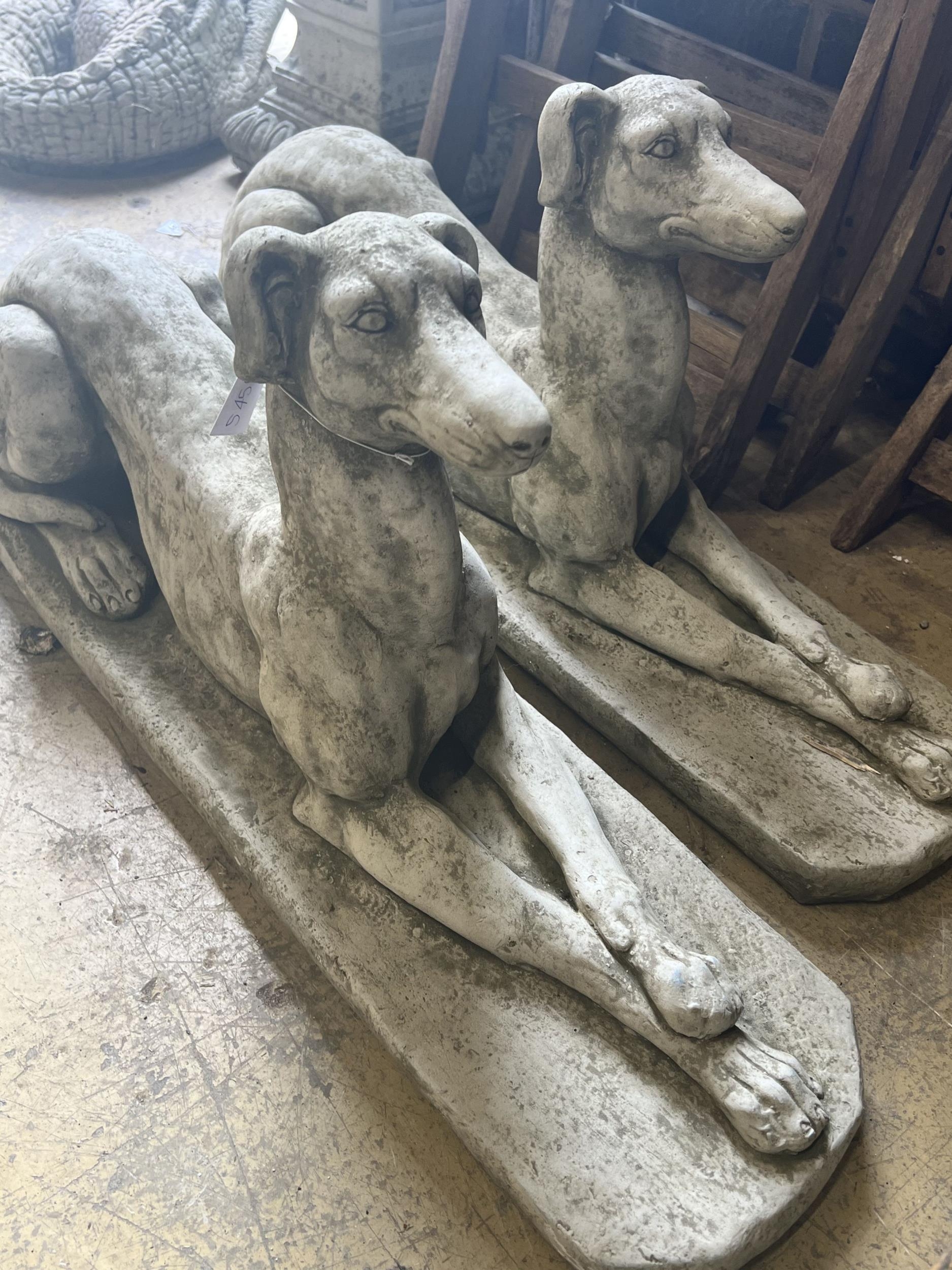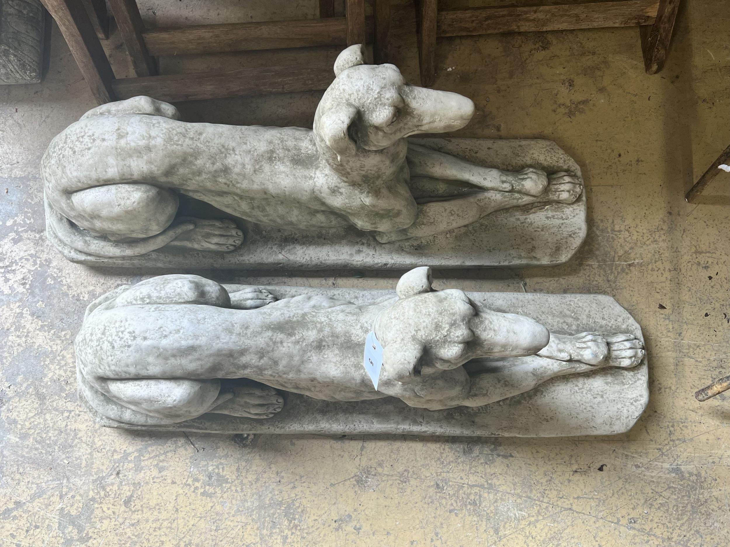 A pair of reconstituted stone recumbent greyhound ornaments, length 82cm
