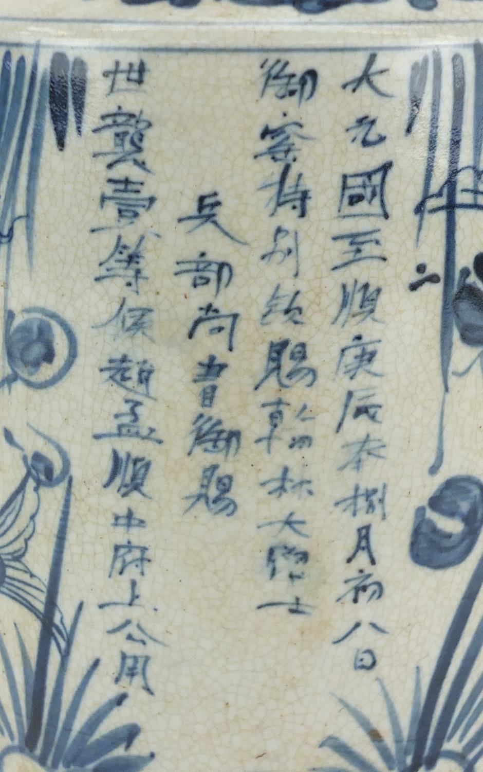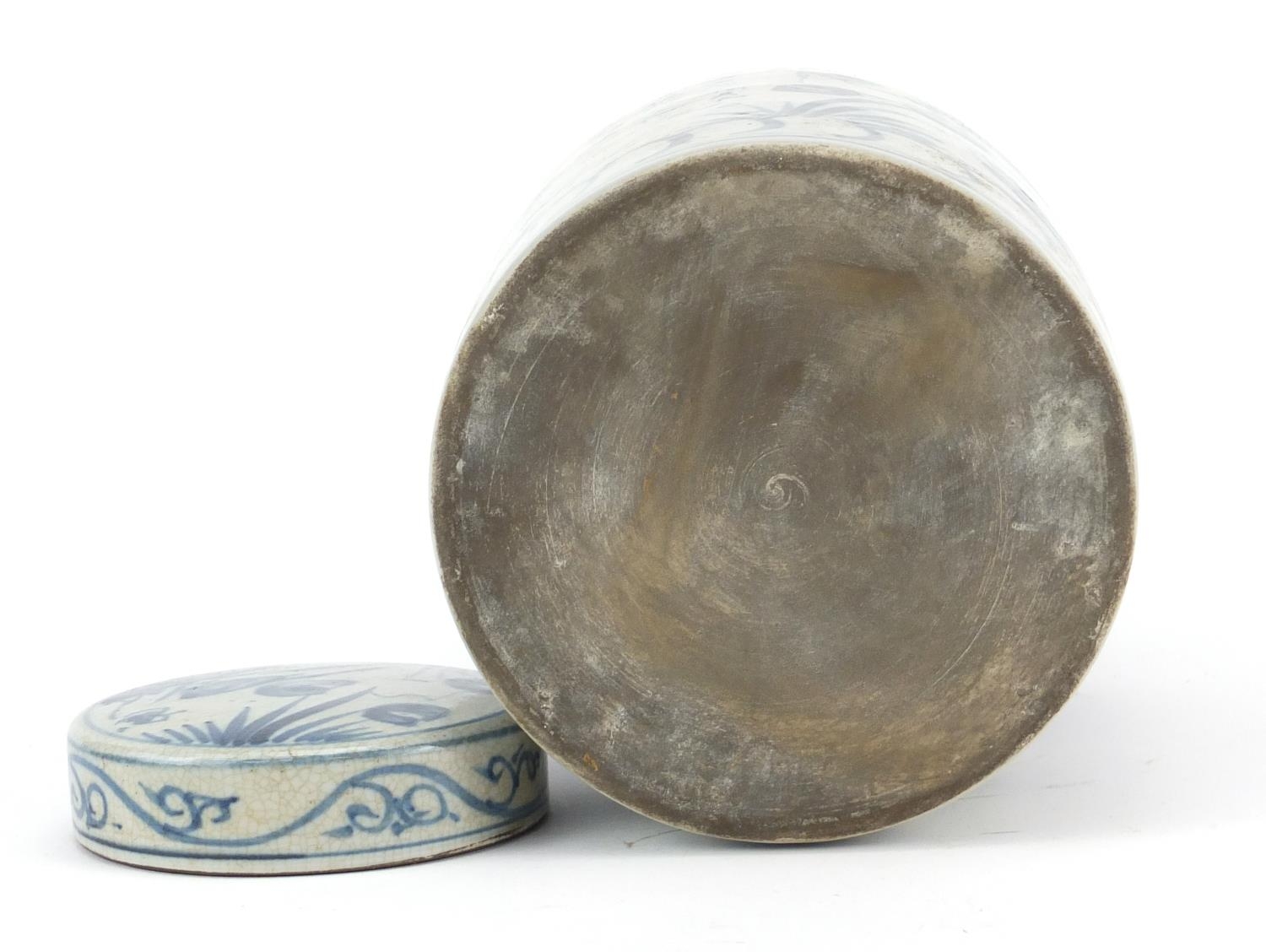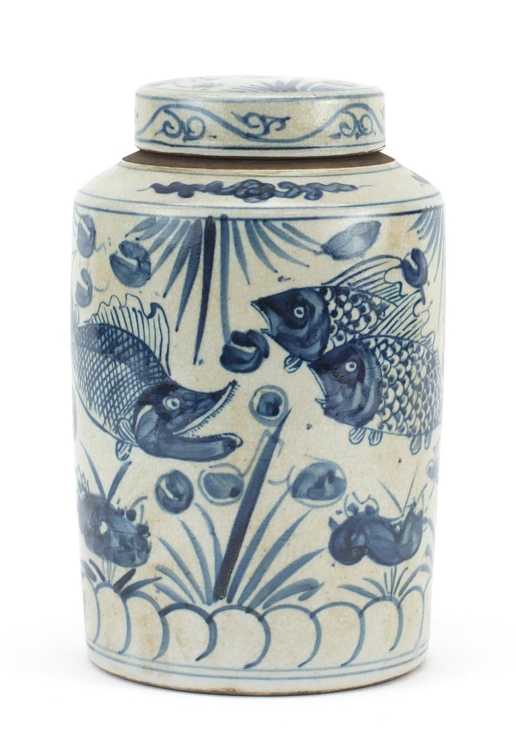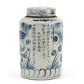 Chinese blue and white porcelain cylindrical jar and cover, hand painted with fish amongst reeds and calligraphy, 24cm high