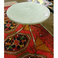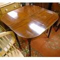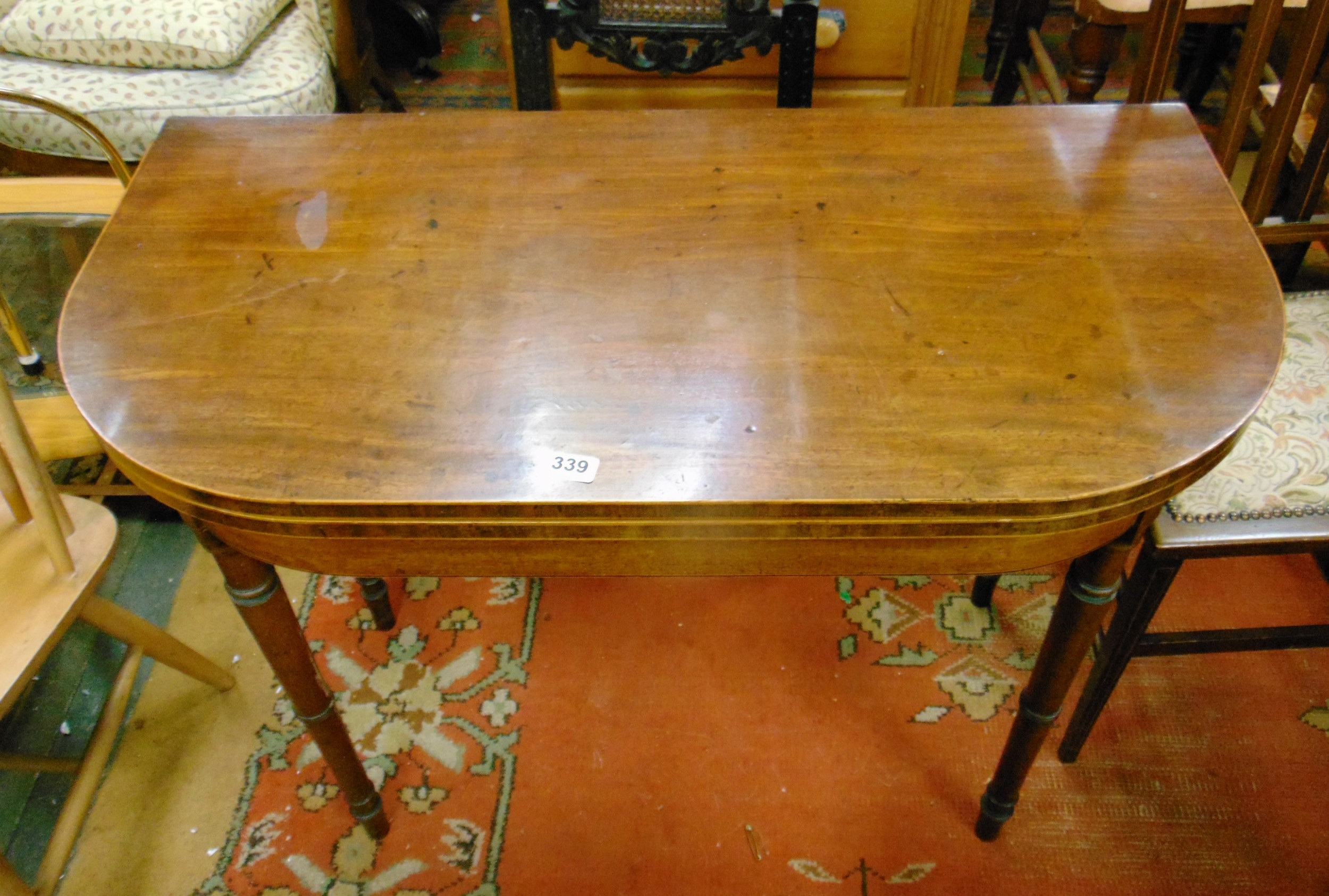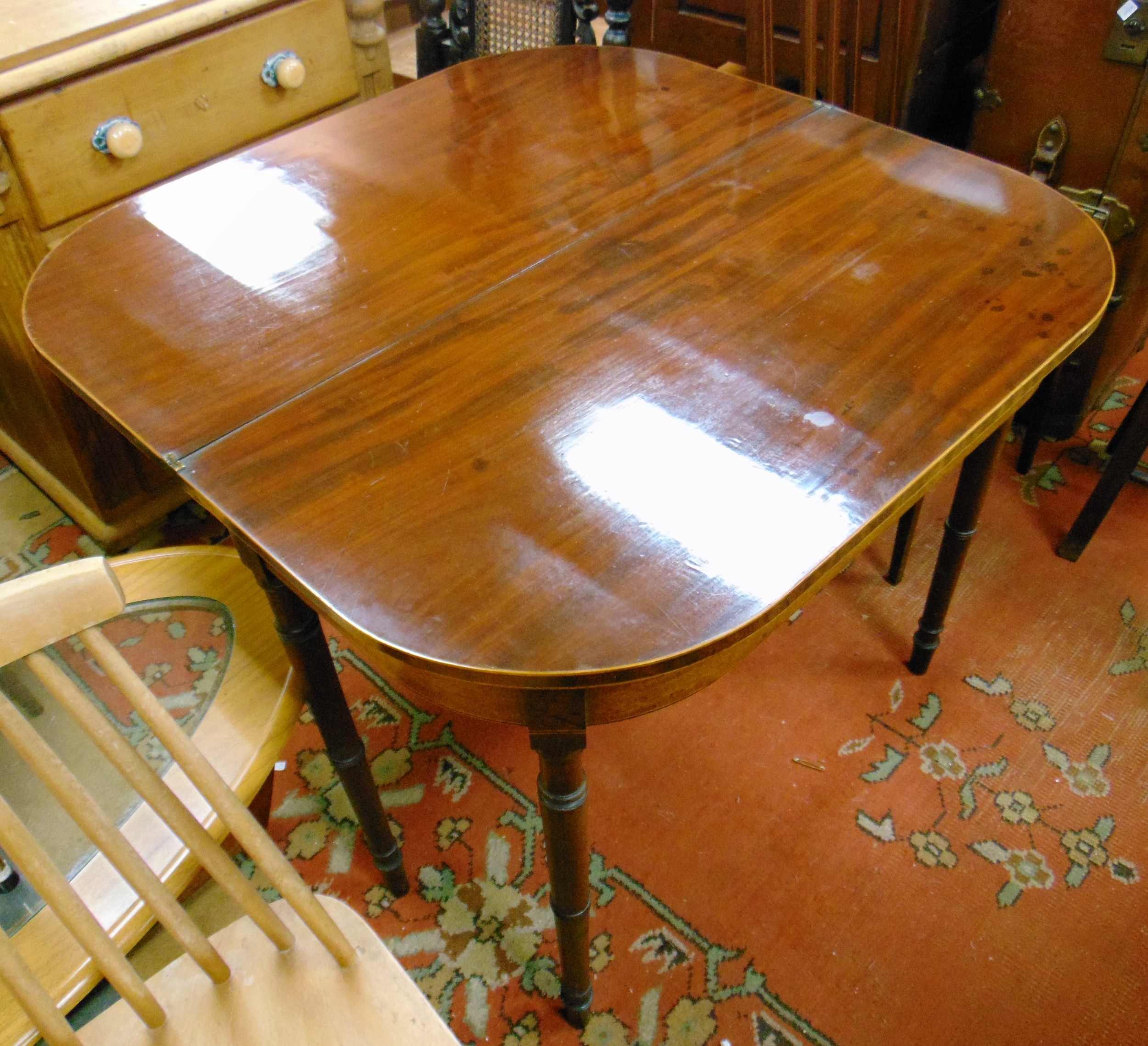 Antique mahogany inlaid tea table, fold over top revealing a polished interior and on ring turned supports, 29 x 36 x 18" deep.