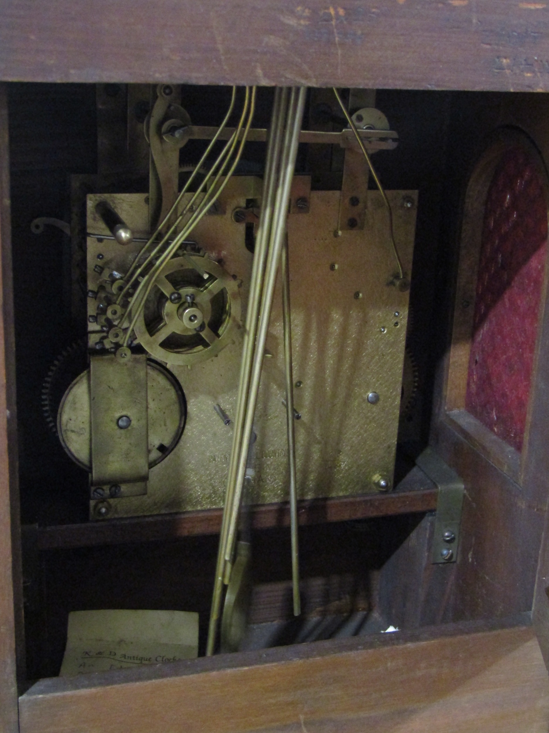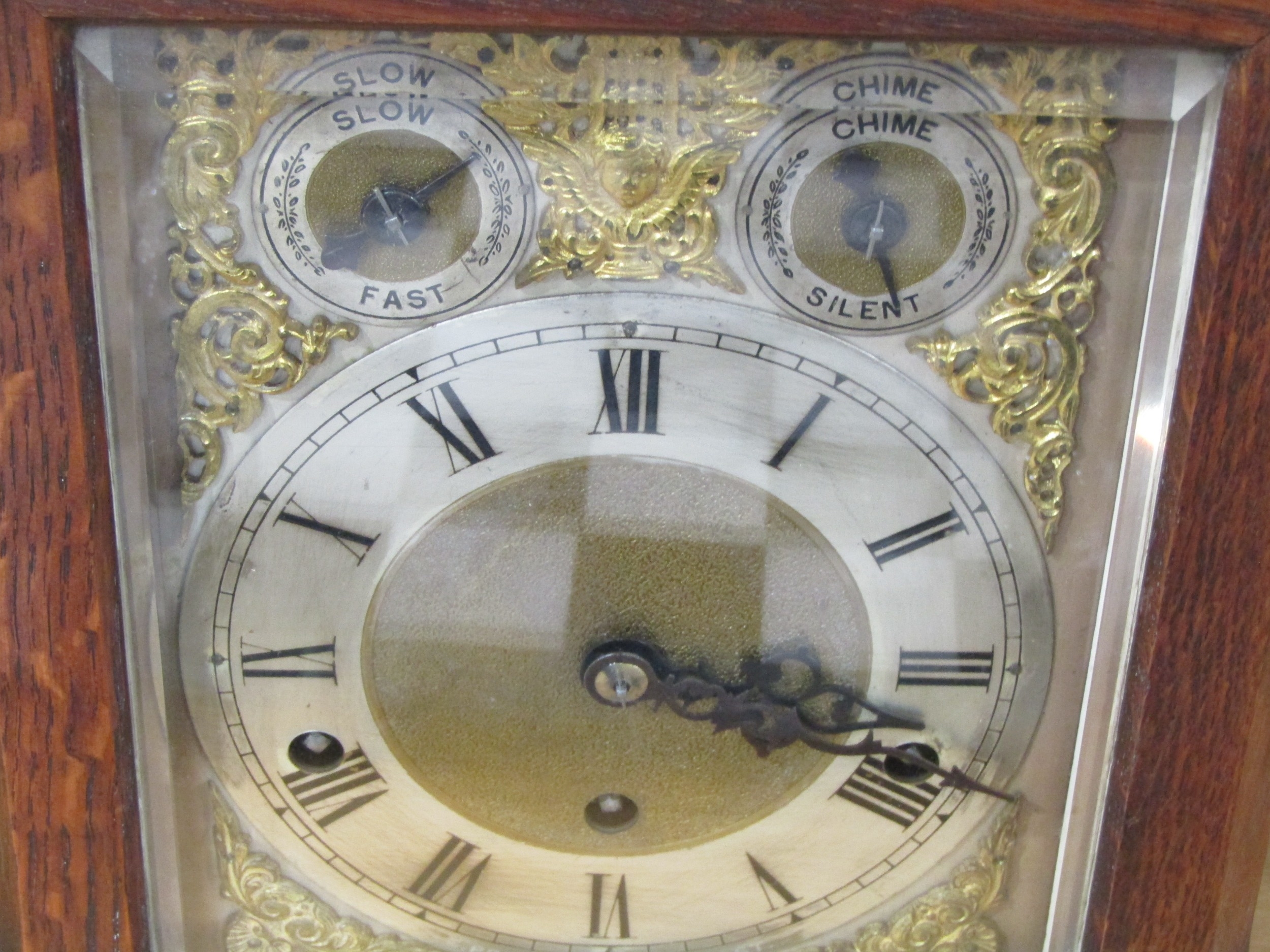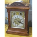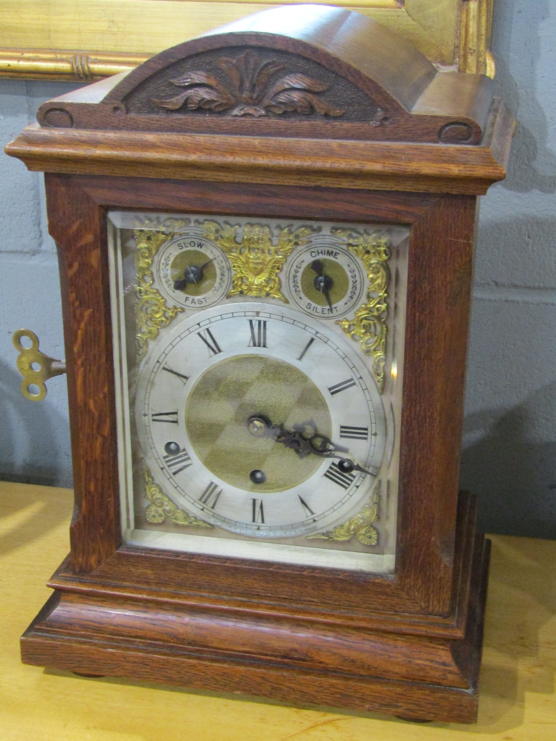 An Edwardian oak cased bracket clock with key and pendulum