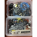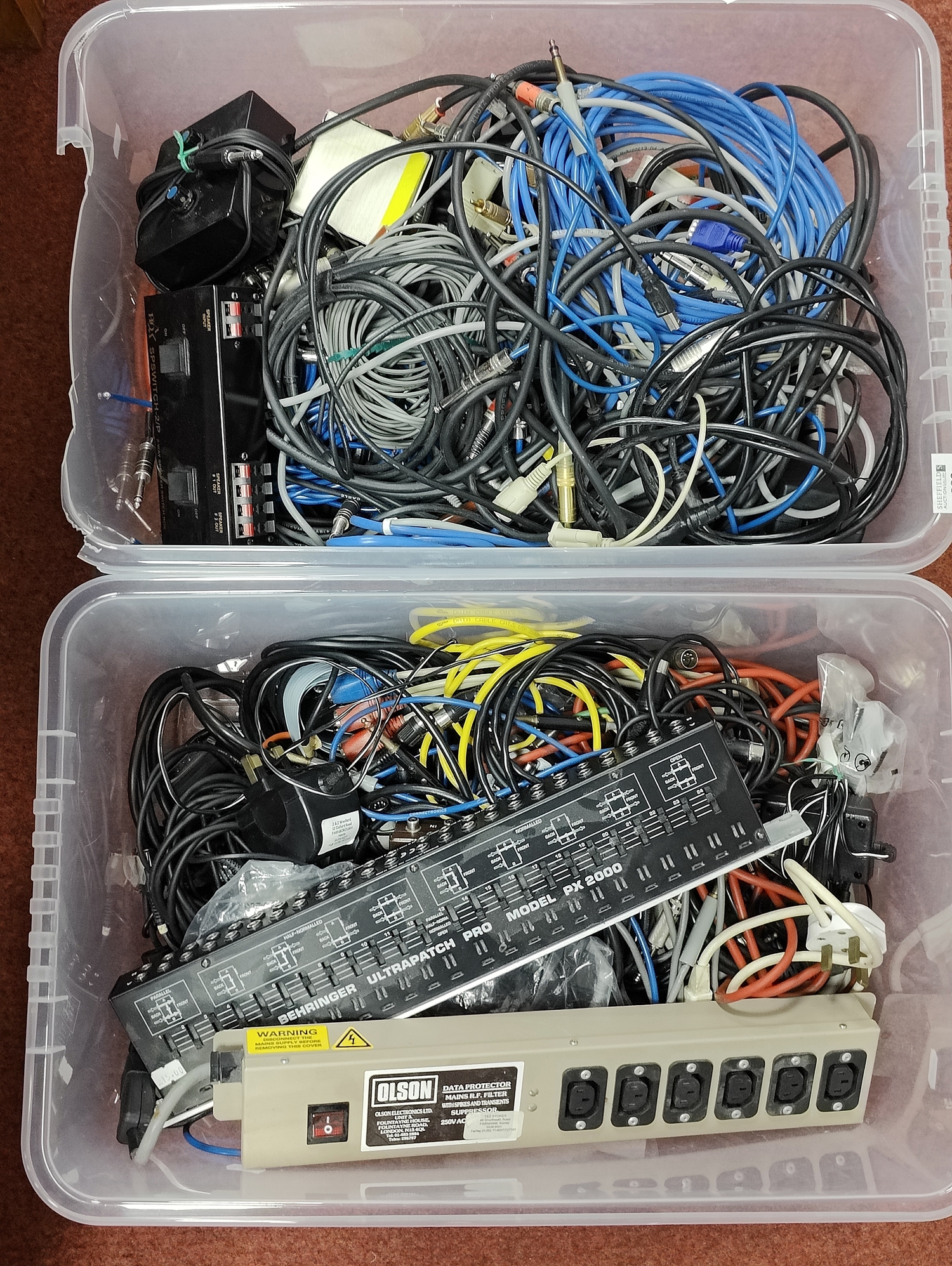 Two Boxes of Pro Audio and Band Cables and Connectors, including a Behringer PX2000 patch box.