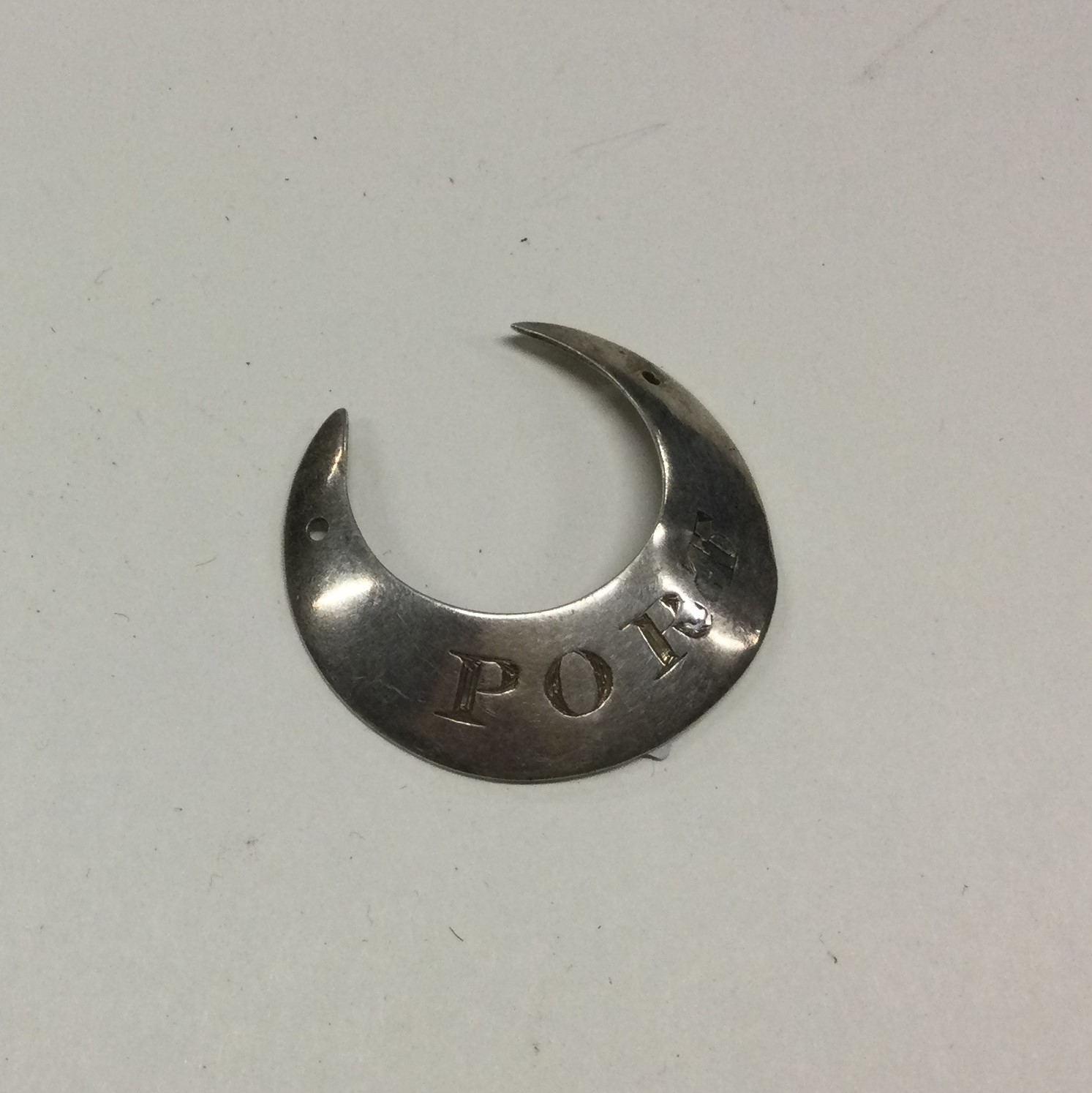 An 18th Century crescent shaped silver wine label for 'Port'. Approx. 3 grams. Est. £30 - £50.