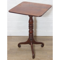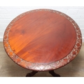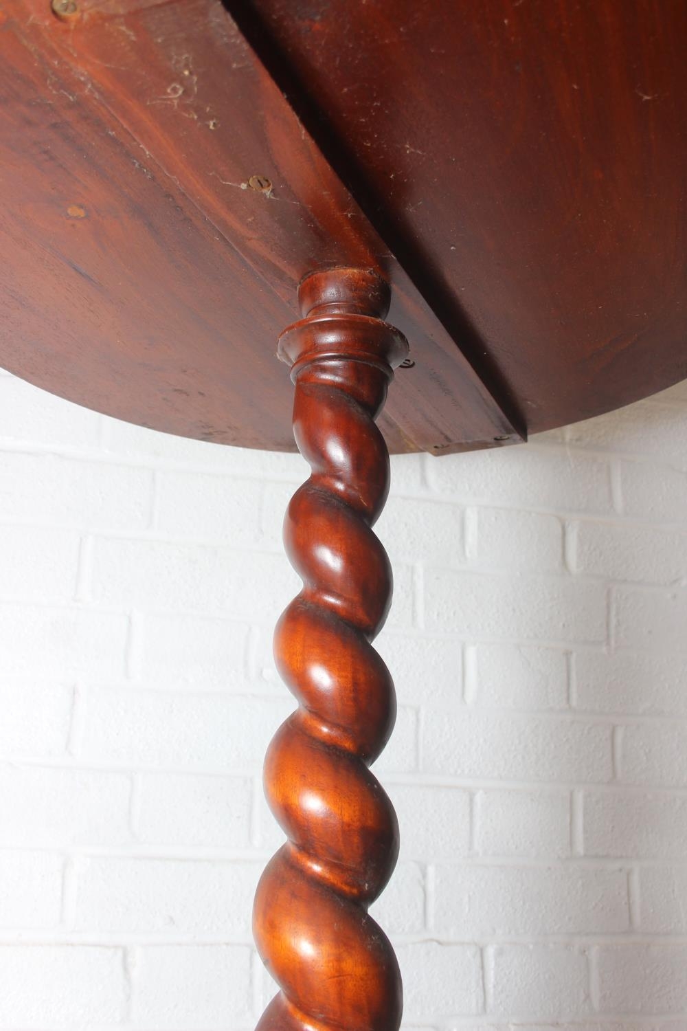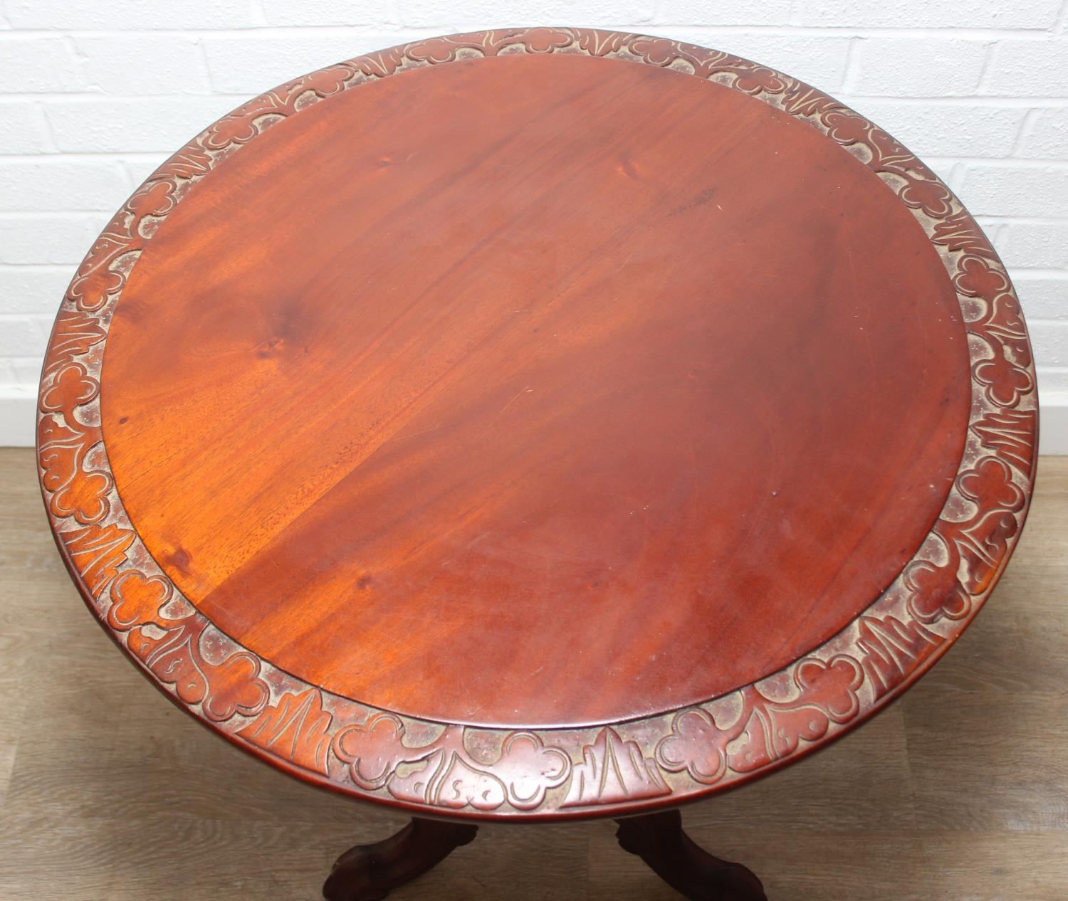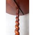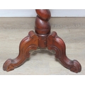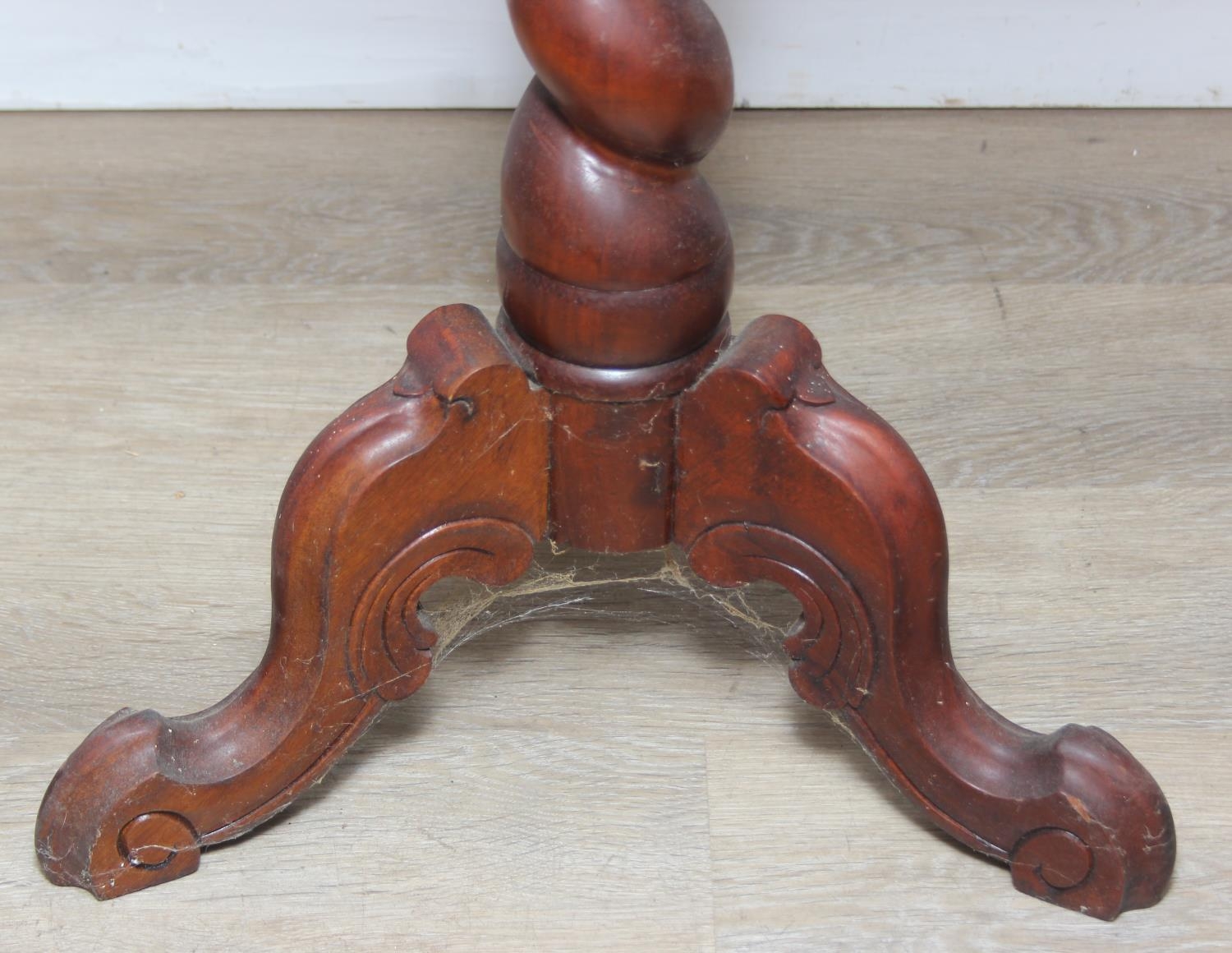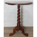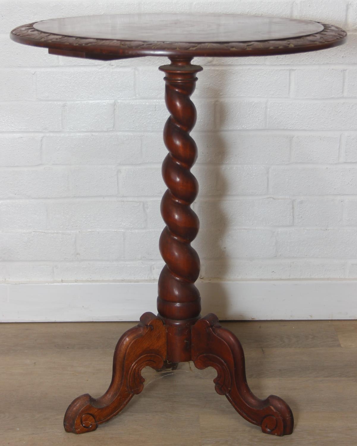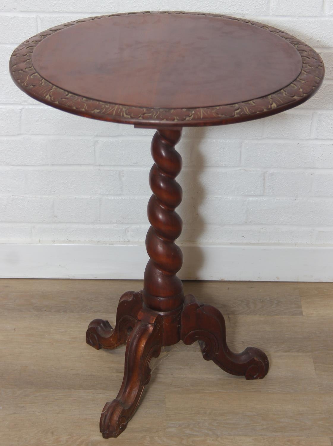 A vintage carved wooden side table with carved details to edge of Art Nouveau style and barleytwist support on three legs, 60cm x 73cm tall
