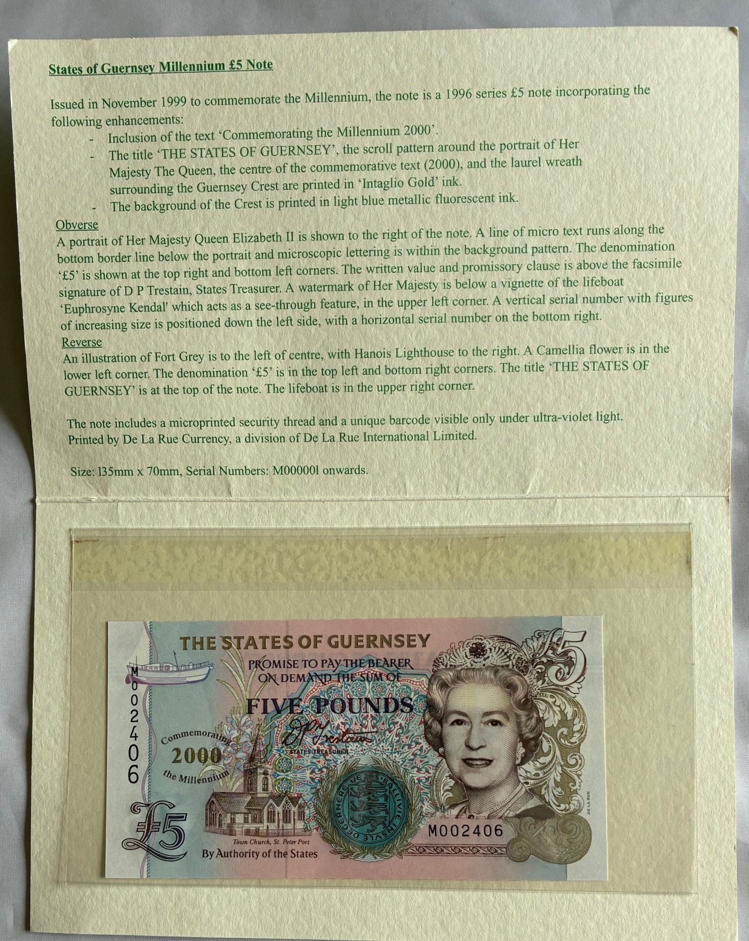 British Banknotes, The States of Guernsey, Millenium £5 Banknote, with protective sleeve and cover, as issued.