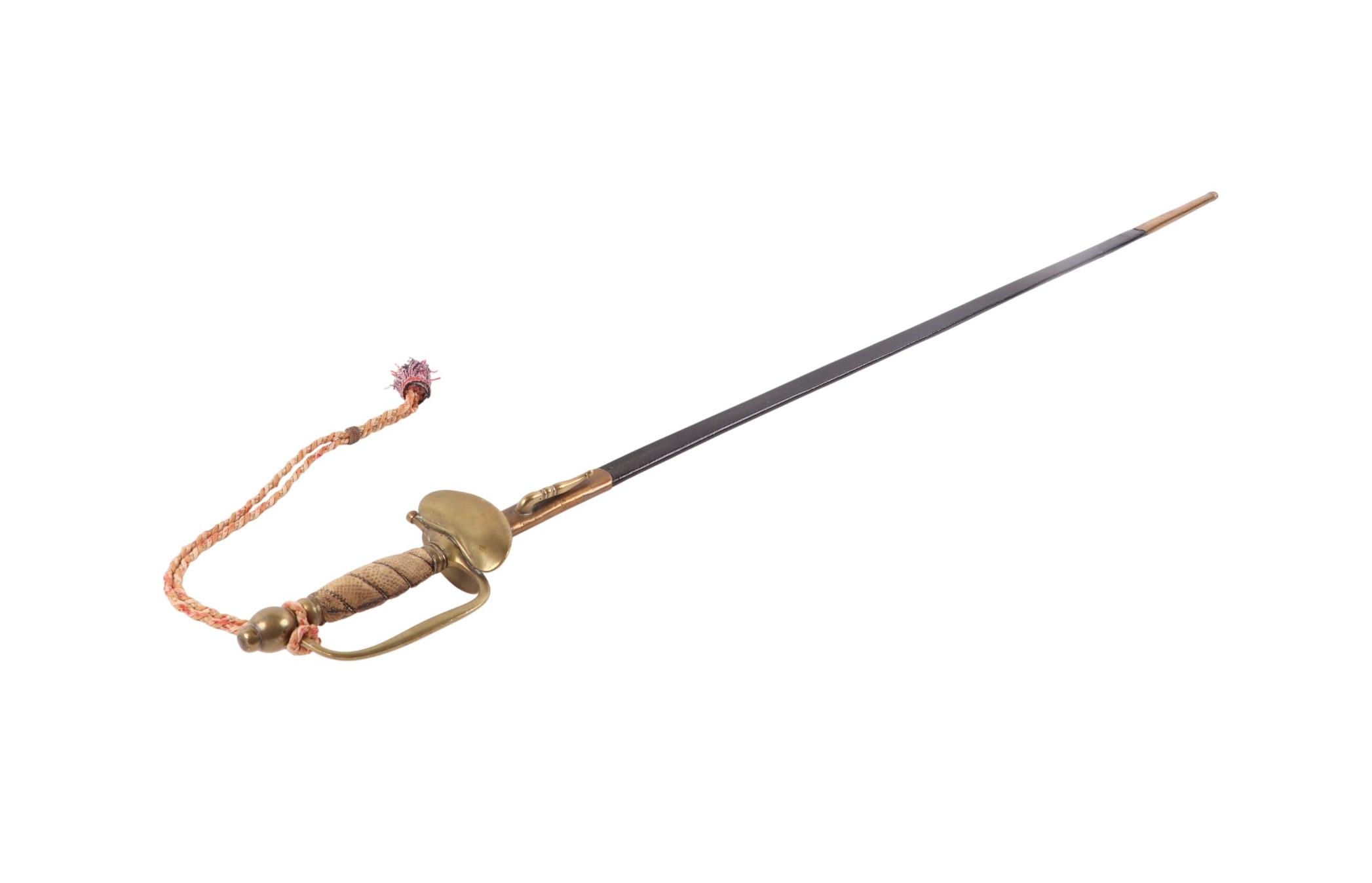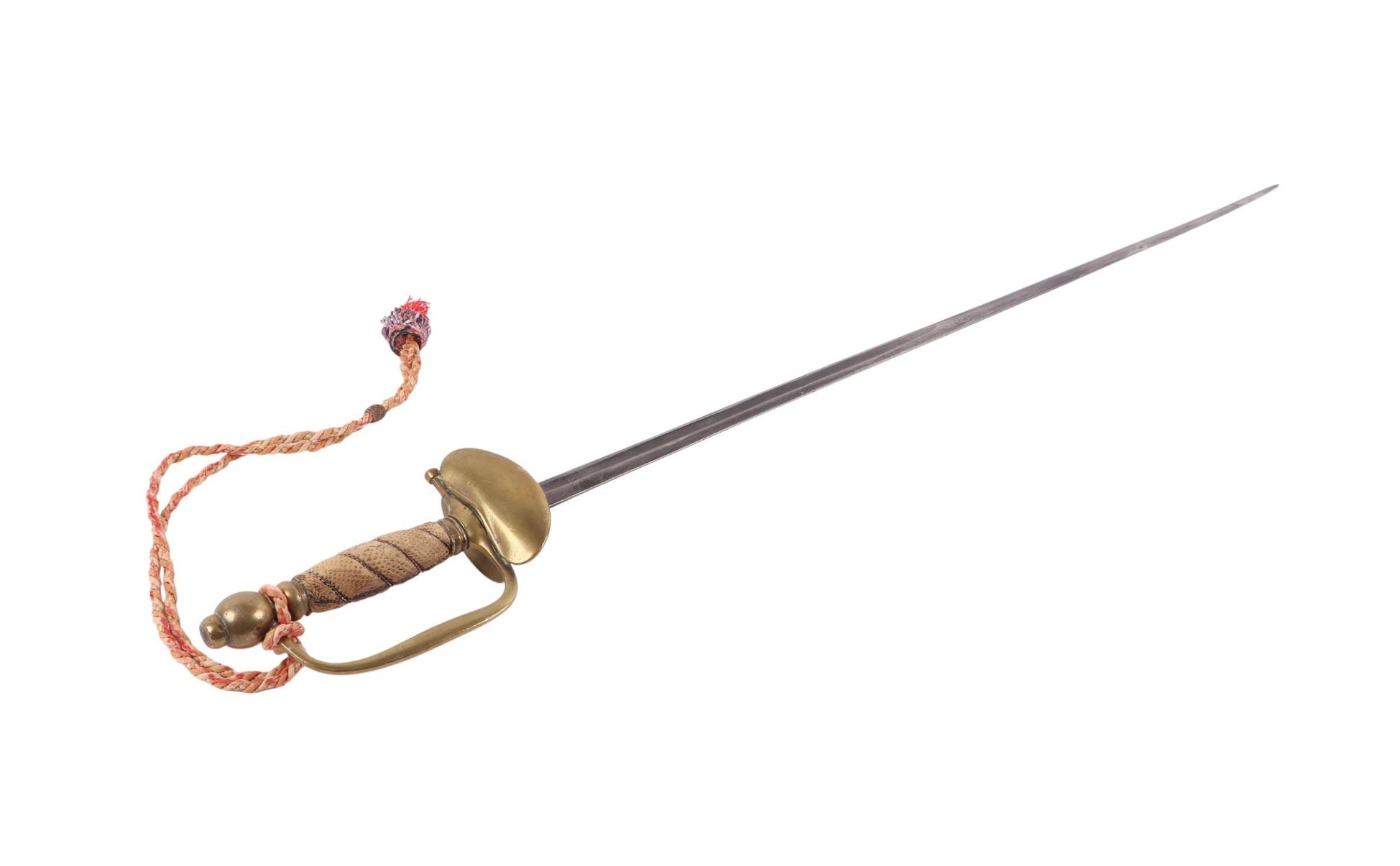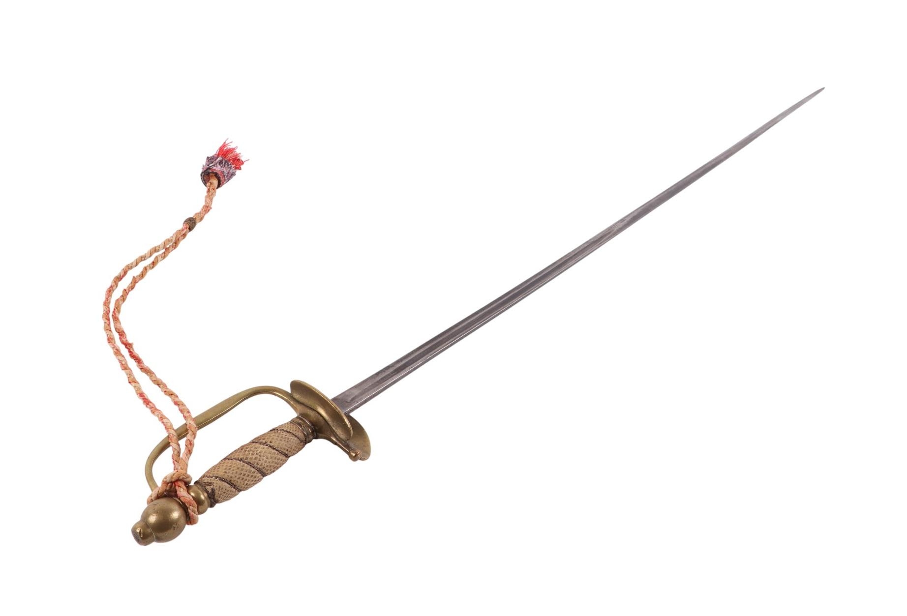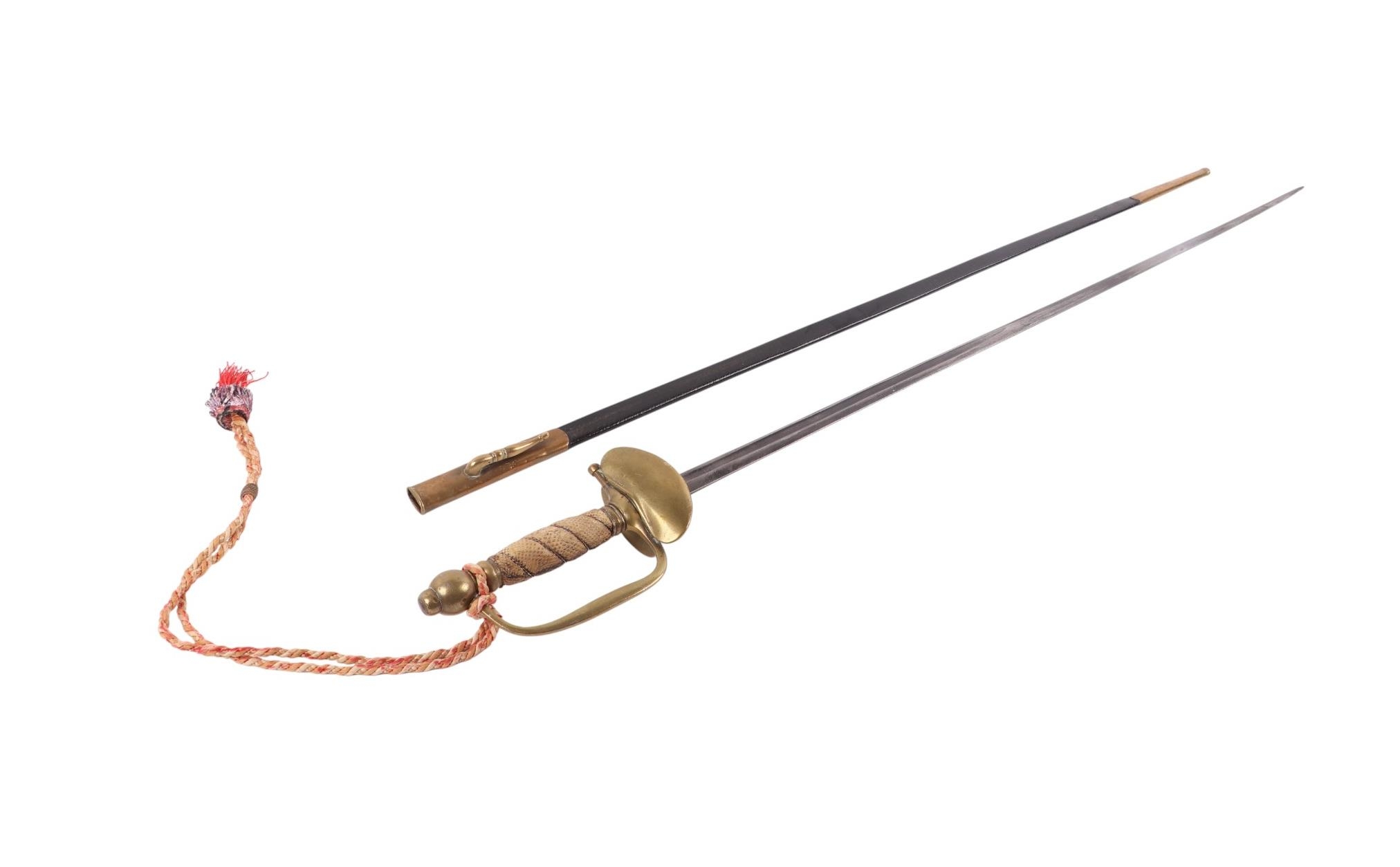 A 19th century French Army Officers Court Sword in its leather scabbard with brass mounts. The straight single edged and single fullered blade is 87cms long.