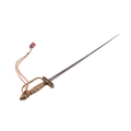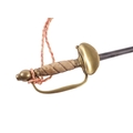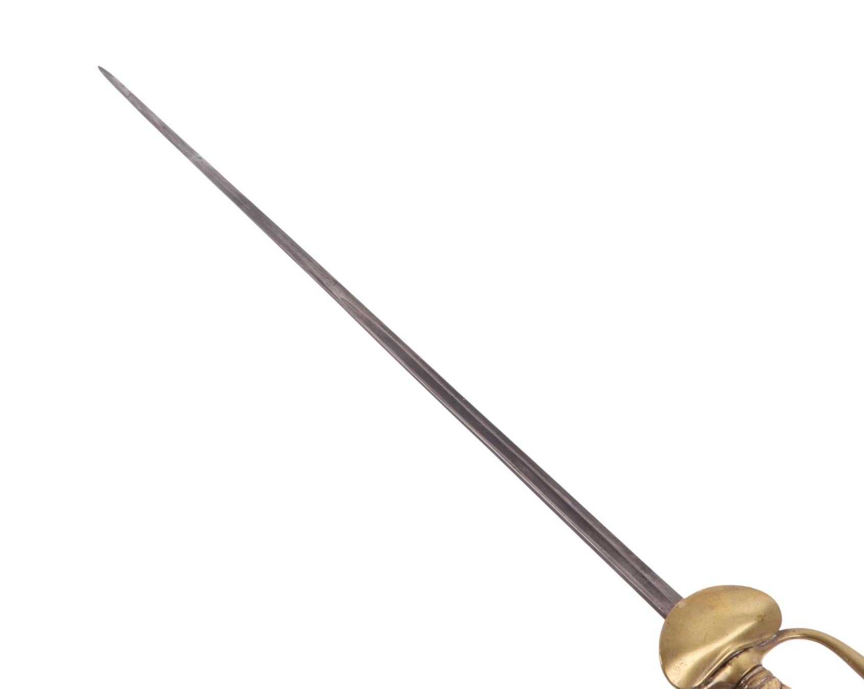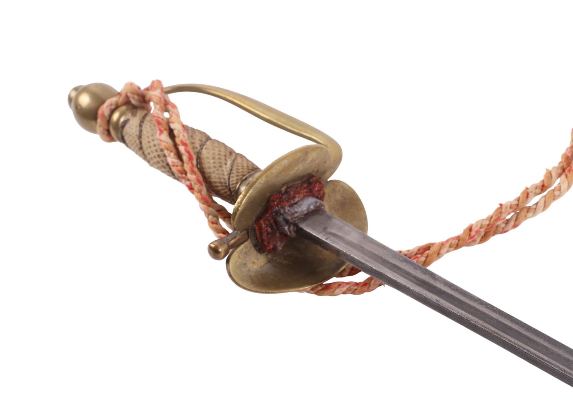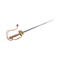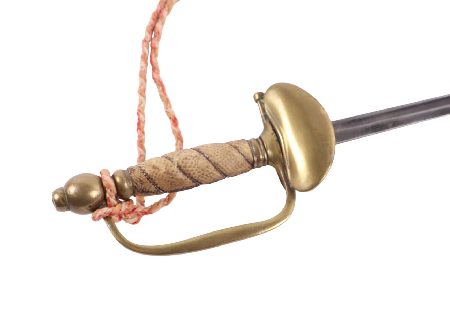 A 19th century French Army Officers Court Sword in its leather scabbard with brass mounts. The straight single edged and single fullered blade is 87cms long.